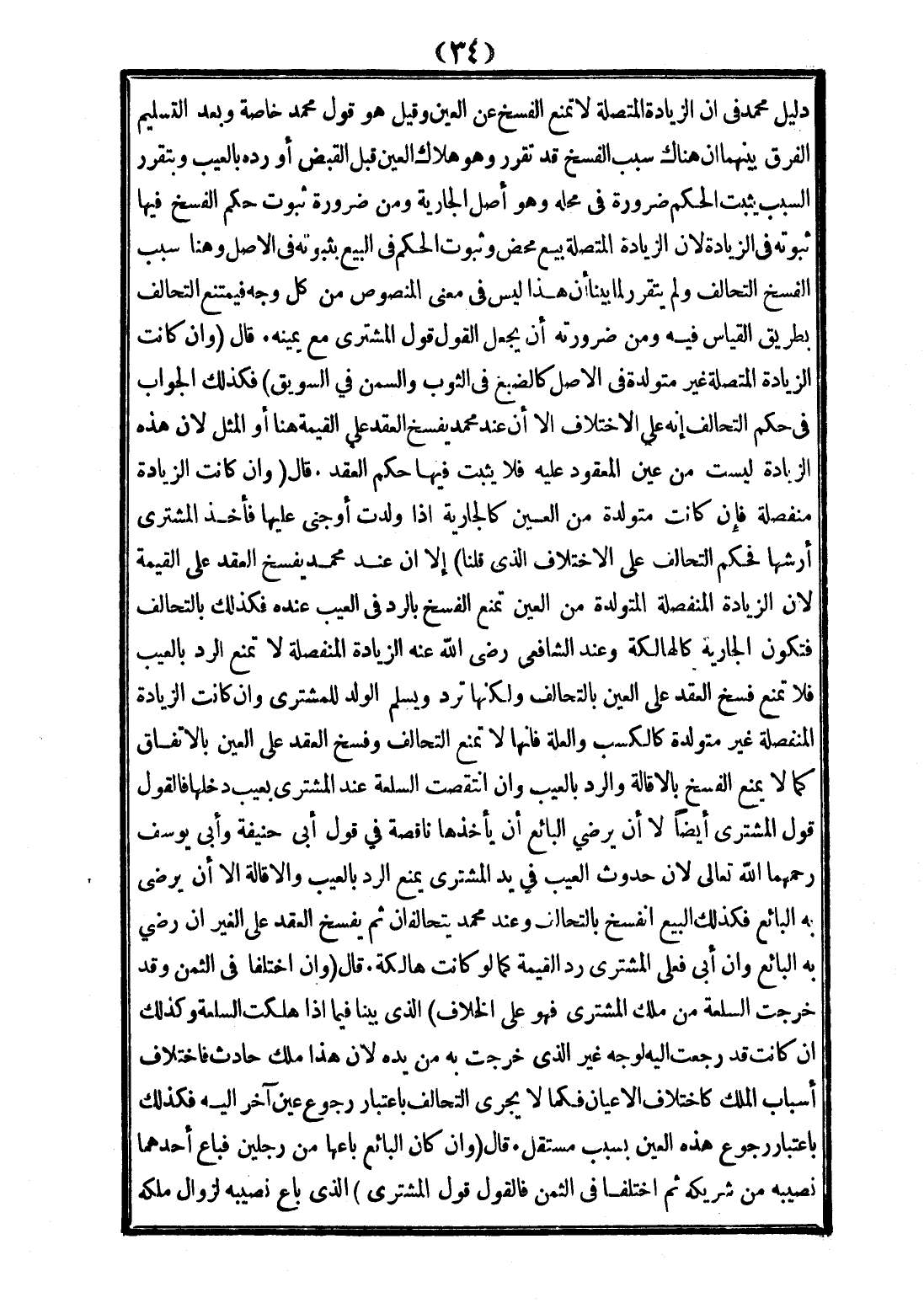 دَلِيلُ مُحَمَّدٍ فِي أَنَّ الزِّيَادَةَ الْمُتَّصِلَةَ لَا تَمْنَعُ الْفَسْخَ عَنْ الْعَيْنِ، وَقِيلَ: هُوَ قَوْلُ مُحَمَّدٍ خَاصَّةً وَبَعْدَ التَّسْلِيمِ الْفَرْقُ بَيْنَهُمَا أَنَّ هُنَاكَ سَبَبُ الْفَسْخِ قَدْ تَقَرَّرَ وَهُوَ هَلَاكُ الْعَيْنِ قَبْلَ الْقَبْضِ أَوْ رَدُّهُ بِالْعَيْبِ وَبِتَقَرُّرِ السَّبَبِ يَثْبُتُ الْحُكْمُ ضَرُورَةً فِي مَحَلِّهِ وَهُوَ أَصْلُ الْجَارِيَةِ، وَمِنْ ضَرُورَةِ ثُبُوتِ حُكْمِ الْفَسْخِ فِيهَا ثُبُوتُهُ فِي الزِّيَادَةِ؛ لِأَنَّ الزِّيَادَةَ الْمُتَّصِلَةَ بَيْعٌ مَحْضٌ وَثُبُوتُ الْحُكْمِ فِي الْبَيْعِ بِثُبُوتِهِ فِي الْأَصْلِ وَهُنَا سَبَبُ الْفَسْخِ التَّحَالُفُ وَلَمْ يَتَقَرَّرْ لِمَا بَيَّنَّا أَنَّ هَذَا لَيْسَ فِي مَعْنَى الْمَنْصُوصِ مِنْ كُلِّ وَجْهٍ فَيَمْتَنِعُ التَّحَالُفُ بِطَرِيقِ الْقِيَاسِ فِيهِ، وَمِنْ ضَرُورَتِهِ أَنْ يَجْعَلَ الْقَوْلَ قَوْلَ الْمُشْتَرِي مَعَ يَمِينِهِ قَالَ: وَإِنْ كَانَتْ الزِّيَادَةُ الْمُتَّصِلَةُ غَيْرَ مُتَوَلِّدَةٍ فِي الْأَصْلِ كَالصَّبْغِ فِي الثَّوْبِ وَالسَّمْنِ فِي التَّسْوِيقِ فَكَذَلِكَ الْجَوَابُ فِي حُكْمِ التَّحَالُفِ أَنَّهُ عَلَى الِاخْتِلَافِ إلَّا أَنَّ عِنْدَ مُحَمَّدٍ يُفْسَخُ الْعَقْدُ عَلَى الْقِيمَةِ هُنَا أَوْ الْمِثْلِ؛ لِأَنَّ هَذِهِ الزِّيَادَةَ لَيْسَتْ مِنْ عَيْنِ الْمَعْقُودِ عَلَيْهِ فَلَا يَثْبُتُ فِيهَا حُكْمُ الْعَقْدِ قَالَ: وَإِنْ كَانَتْ الزِّيَادَةُ مُنْفَصِلَةً.