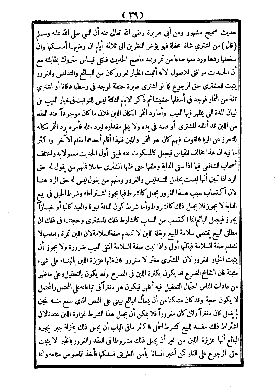 حَدِيثٌ صَحِيحٌ مَشْهُورٌ، وَعَنْ أَبِي هُرَيْرَةَ - رَضِيَ اللَّهُ تَعَالَى عَنْهُ - أَنَّ النَّبِيَّ - صَلَّى اللَّهُ عَلَيْهِ وَسَلَّمَ - قَالَ: «مَنْ اشْتَرَى شَاةً مُحَفَّلَةً فَهُوَ يُؤَخِّرُ النَّظَرَيْنِ إلَى ثَلَاثَةِ أَيَّامٍ إنْ رَضِيَهَا أَمْسَكَهَا وَإِنْ سَخِطَهَا رَدَّهَا وَرَدَّ مَعَهَا صَاعًا مِنْ تَمْرٍ» وَبَعْدَمَا صَحَّ الْحَدِيثُ فَكُلُّ قِيَاسٍ مَتْرُوكٌ بِمُقَابَلَتِهِ مَعَ أَنَّ الْحَدِيثَ مُوَافِقٌ لِلْأُصُولِ؛ لِأَنَّهُ أَثْبَتَ الْخِيَارَ لِغُرُورٍ كَانَ مِنْ الْبَائِعِ، وَالتَّدْلِيسُ وَالْغُرُورُ يُثْبِتُ لِلْمُشْتَرِي حَقَّ الرُّجُوعِ كَمَا لَوْ اشْتَرَى صُبْرَةَ حِنْطَةٍ فَوَجَدَ فِي وَسَطِهَا دُكَّانًا أَوْ اشْتَرَى قُفَّةً مِنْ الثِّمَارِ فَوَجَدَ فِي أَسْفَلِهَا حَشِيشًا.