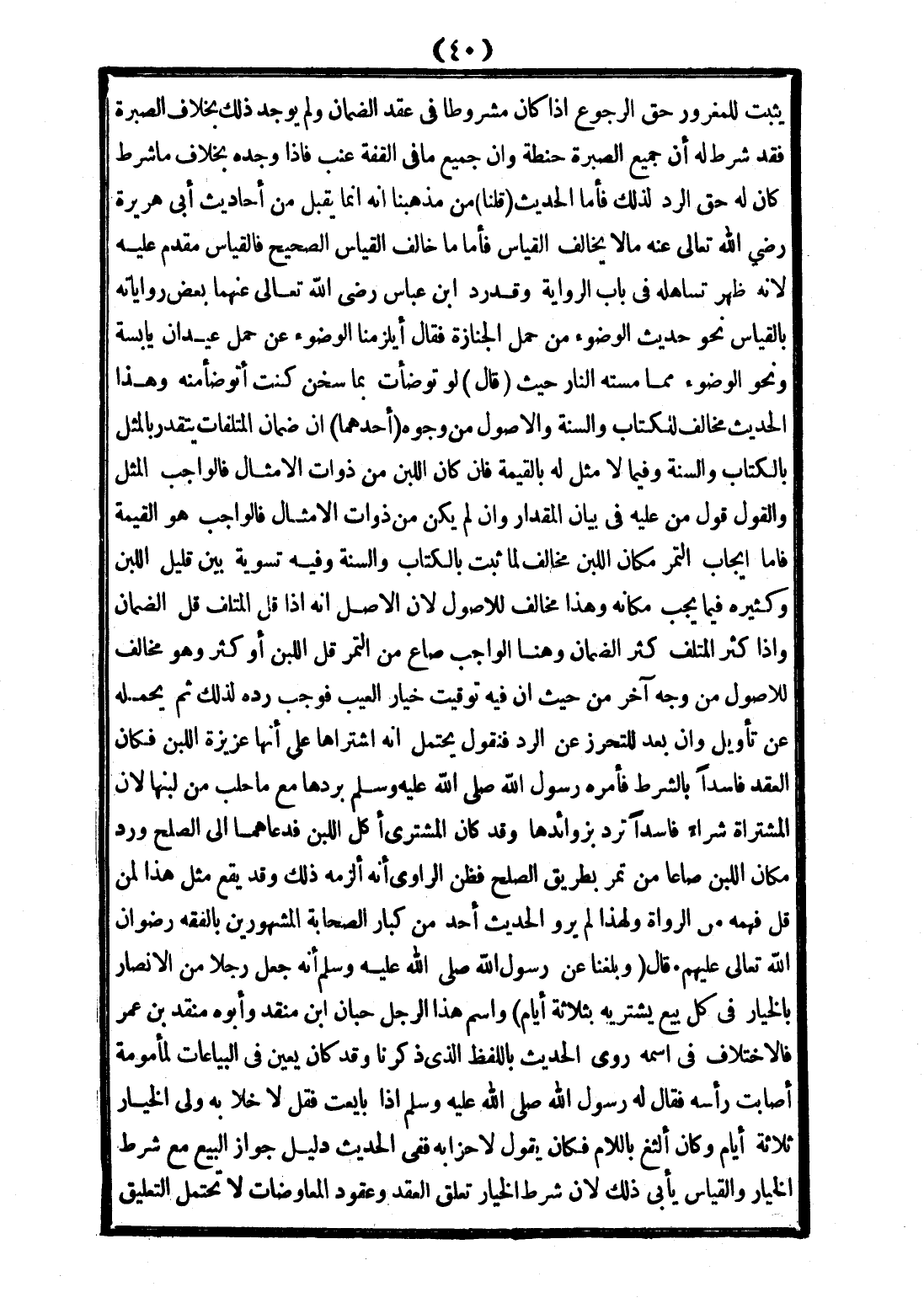 وَفِيهِ تَسْوِيَةٌ بَيْنَ قَلِيلِ اللَّبَنِ وَكَثِيرِهِ فِيمَا يَجِبُ مَكَانَهُ وَهَذَا مُخَالِفٌ لِلْأُصُولِ؛ لِأَنَّ الْأَصْلَ أَنَّهُ إذَا قَلَّ الْمُتْلَفُ قَلَّ الضَّمَانُ، وَإِذَا كَثُرَ الْمُتْلَفُ كَثُرَ الضَّمَانُ وَهُنَا الْوَاجِبُ صَاعٌ مِنْ التَّمْرِ قَلَّ اللَّبَنُ أَوْ كَثُرَ وَهُوَ مُخَالِفٌ لِلْأُصُولِ مِنْ وَجْهٍ آخَرَ مِنْ حَيْثُ إنَّ فِيهِ تَوْقِيتَ خِيَارِ الْعَيْبِ فَوَجَبَ رَدُّهُ لِذَلِكَ ثُمَّ يَحْمِلُهُ عَنْ تَأْوِيلٍ، وَإِنْ بَعُدَ لِلتَّحَرُّزِ عَنْ الرَّدِّ فَنَقُولُ يُحْتَمَلُ أَنَّهُ اشْتَرَاهَا عَلَى أَنَّهَا عَزِيزَةُ اللَّبَنِ فَكَانَ الْعَقْدُ فَاسِدًا بِالشَّرْطِ فَأَمَرَهُ رَسُولُ اللَّهِ - صَلَّى اللَّهُ عَلَيْهِ وَسَلَّمَ - بِرَدِّهَا مَعَ مَا حَلَبَ مِنْ لَبَنِهَا؛ لِأَنَّ الْمُشْتَرَاةَ شِرَاءً فَاسِدًا تُرَدُّ بِزَوَائِدِهَا، وَقَدْ كَانَ الْمُشْتَرِي أَكَلَ اللَّبَنَ فَدَعَاهُمَا إلَى الصُّلْحِ وَرَدَّ مَكَانَ اللَّبَنِ صَاعًا مِنْ تَمْرٍ بِطَرِيقِ الصُّلْحِ فَظَنَّ الرَّاوِي أَنَّهُ أَلْزَمَهُ ذَلِكَ، وَقَدْ يَقَعُ مِثْلُ هَذَا لِمَنْ قَلَّ فَهْمُهُ مِنْ الرُّوَاةِ وَلِهَذَا لَمْ يَرْوِ الْحَدِيثَ أَحَدٌ مِنْ كِبَارِ الصَّحَابَةِ الْمَشْهُورِينَ بِالْفِقْهِ - رِضْوَانُ اللَّهِ تَعَالَى عَلَيْهِمْ - قَالَ: وَبَلَغَنَا عَنْ رَسُولِ اللَّهِ - صَلَّى اللَّهُ عَلَيْهِ وَسَلَّمَ - أَنَّهُ جَعَلَ رَجُلًا مِنْ الْأَنْصَارِ بِالْخِيَارِ فِي كُلِّ بَيْعٍ يَشْتَرِيهِ بِثَلَاثَةِ أَيَّامٍ وَاسْمُ هَذَا الرَّجُلِ حِبَّانُ بْنُ مُنْقِدٍ وَأَبُوهُ مُنْقِدُ بْنُ عُمَرَ فَالِاخْتِلَافُ فِي اسْمِهِ رَوَى الْحَدِيثَ بِاللَّفْظِ الَّذِي ذَكَرْنَا وَقَدْ كَانَ يُعَيِّنُ فِي الْبِيَاعَاتِ لِمَأْمُومَةٍ أَصَابَتْ رَأْسَهُ فَقَالَ لَهُ رَسُولُ اللَّهِ - صَلَّى اللَّهُ عَلَيْهِ وَسَلَّمَ - إذَا بَايَعَتْ فَقُلْ لَا خِلَابَةَ وَلِيَ الْخِيَارُ ثَلَاثَةُ أَيَّامٍ وَكَانَ أَلْثَغَ بِاللَّامِ فَكَانَ يَقُولُ لَا خِيَابَةَ فَفِي الْحَدِيثِ دَلِيلُ جَوَازِ الْبَيْعِ مَعَ شَرْطِ الْخِيَارِ وَالْقِيَاسُ يَأْبَى ذَلِكَ؛ لِأَنَّ شَرْطَ الْخِيَارِ تَعَلُّقُ الْعَقْدِ وَعُقُودُ الْمُعَاوَضَاتِ لَا تَحْتَمِلُ التَّعْلِيقَ