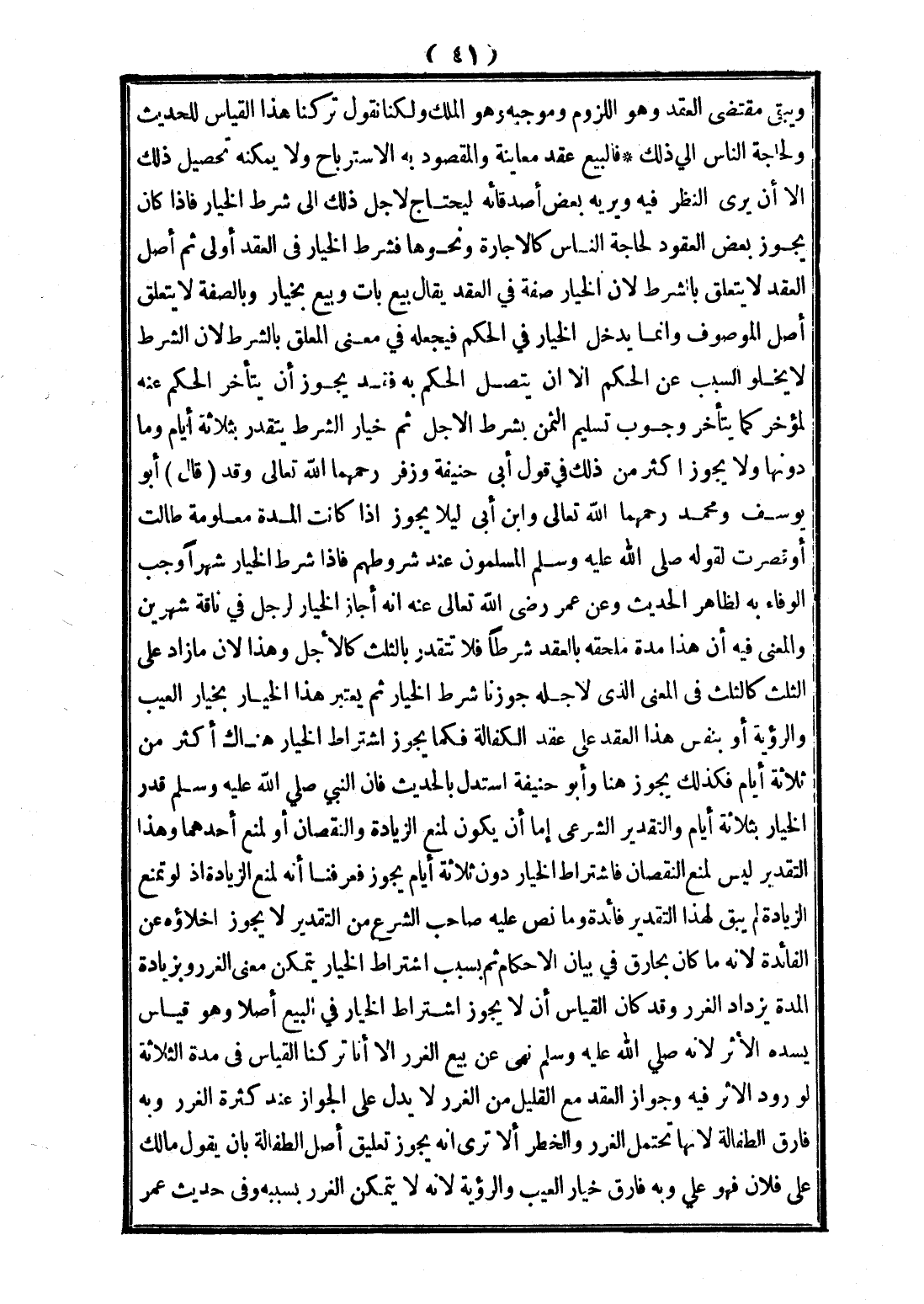 وَيَبْقَى مُقْتَضَى الْعَقْدِ وَهُوَ اللُّزُومُ وَمُوجِبُهُ وَهُوَ الْمِلْكُ، وَلَكِنَّا نَقُولُ تَرَكْنَا هَذَا الْقِيَاسَ لِلْحَدِيثِ وَلِحَاجَةِ النَّاسِ إلَى ذَلِكَ فَالْبَيْعُ عَقْدُ مُعَايَنَةٍ وَالْمَقْصُودُ بِهِ الِاسْتِرْبَاحُ وَلَا يُمْكِنُهُ تَحْصِيلُ ذَلِكَ إلَّا أَنْ تَرَى النَّظَرَ فِيهِ وَيُرِيهِ بَعْضَ أَصْدِقَائِهِ لِيَحْتَاجَ لِأَجْلِ ذَلِكَ إلَى شَرْطِ الْخِيَارِ فَإِذَا كَانَ يَجُوزُ بَعْضُ الْعُقُودِ لِحَاجَةِ النَّاسِ كَالْإِجَارَةِ وَنَحْوِهَا فَشَرْطُ الْخِيَارِ فِي الْعَقْدِ أَوْلَى ثُمَّ أَصْلُ الْعَقْدِ لَا يَتَعَلَّقُ بِالشَّرْطِ؛ لِأَنَّ الْخِيَارَ صِفَةٌ فِي الْعَقْدِ يُقَالُ: بَيْعٌ بَاتٌّ وَبَيْعٌ بِخِيَارٍ وَبِالصِّفَةِ لَا يَتَعَلَّقُ أَصْلُ الْمَوْصُوفِ، وَإِنَّمَا يَدْخُلُ الْخِيَارُ فِي الْحُكْمِ فَيَجْعَلُهُ فِي مَعْنَى الْمُعَلَّقِ بِالشَّرْطِ؛ لِأَنَّ الشَّرْطَ لَا يَخْلُو السَّبَبُ عَنْ الْحُكْمِ إلَّا أَنْ يَتَّصِلَ الْحُكْمُ بِهِ فَقَدْ يَجُوزُ أَنْ يَتَأَخَّرَ الْحُكْمُ عَنْهُ لِمُؤَخَّرٍ كَمَا يَتَأَخَّرُ وُجُوبُ تَسْلِيمِ الثَّمَنِ بِشَرْطِ الْأَجَلِ ثُمَّ خِيَارُ الشَّرْطِ يَتَقَدَّرُ بِثَلَاثَةِ أَيَّامٍ وَمَا دُونَهَا وَلَا يَجُوزُ أَكْثَرُ مِنْ ذَلِكَ فِي قَوْلِ أَبِي حَنِيفَةَ وَزُفَرَ - رَحِمَهُمَا اللَّهُ تَعَالَى -.