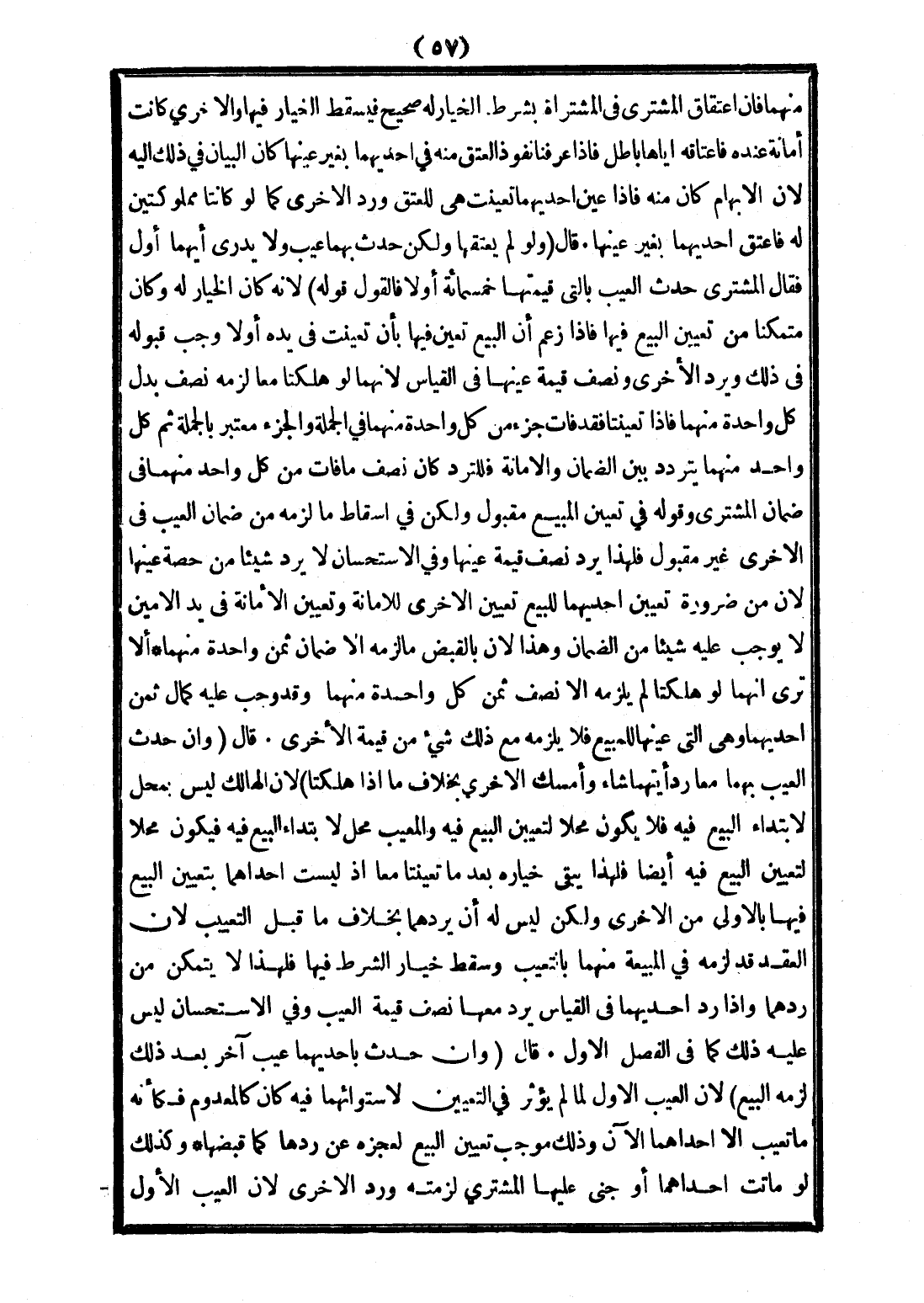 مِنْهُمَا فَإِنَّ إعْتَاقَ الْمُشْتَرِي فِي الْمُشْتَرَاةِ بِشَرْطِ الْخِيَارِ لَهُ صَحِيحٌ فَيَسْقُطُ الْخِيَارُ فِيهَا وَالْأُخْرَى كَانَتْ أَمَانَةً عِنْدَهُ فَإِعْتَاقُهُ إيَّاهَا بَاطِلٌ فَإِذَا عَرَفْنَا نُفُوذَ الْعِتْقِ فِي إحْدَاهُمَا بِغَيْرِ عَيْنِهَا كَانَ الْبَيَانُ فِي ذَلِكَ إلَيْهِ؛ لِأَنَّ الْإِبْهَامَ كَانَ مِنْهُ فَإِذَا عَيَّنَ إحْدَاهُمَا تَعَيَّنَتْ هِيَ لِلْعِتْقِ وَرَدَّ الْأُخْرَى كَمَا لَوْ كَانَتَا مَمْلُوكَتَيْنِ لَهُ فَأَعْتَقَ إحْدَاهُمَا بِغَيْرِ عَيْنِهَا، قَالَ: وَلَوْ لَمْ يُعْتِقْهَا وَلَكِنْ حَدَثَ بِهِمَا عَيْبٌ وَلَا يَدْرِي أَيَّهُمَا أَوَّلَ فَقَالَ الْمُشْتَرِي حَدَثَ الْعَيْبُ بِاَلَّتِي قِيمَتُهَا خَمْسُمِائَةٍ أَوَّلًا فَالْقَوْلُ قَوْلُهُ؛ لِأَنَّهُ كَانَ الْخِيَارُ لَهُ، وَكَانَ مُتَمَكِّنًا مِنْ تَعْيِينِ الْبَيْعِ فِيهَا فَإِذَا زَعَمَ أَنَّ الْبَيْعَ تَعَيَّنَ فِيهَا بِأَنْ تَعَيَّنَتْ فِي يَدِهِ أَوَّلًا وَجَبَ قَبُولُهُ فِي ذَلِكَ وَيَرُدُّ الْأُخْرَى وَنِصْفَ قِيمَةِ عَيْنِهَا فِي الْقِيَاسِ؛ لِأَنَّهُمَا لَوْ هَلَكَتَا مَعًا لَزِمَهُ نِصْفُ بَدَلِ كُلِّ وَاحِدَةٍ مِنْهُمَا فَإِذَا تَعَيَّنَتَا فَقَدْ فَاتَ جُزْءٌ مِنْ كُلِّ وَاحِدَةٍ مِنْهُمَا فِي الْجُمْلَةِ، وَالْجُزْءُ مُعْتَبَرٌ بِالْجُمْلَةِ ثُمَّ كُلُّ وَاحِدٍ مِنْهُمَا يَتَرَدَّدُ بَيْنَ الضَّمَانِ وَالْأَمَانَةِ فَلِلتَّرَدُّدِ كَانَ نِصْفُ مَا فَاتَ مِنْ كُلِّ وَاحِدٍ مِنْهُمَا فِي ضَمَانِ الْمُشْتَرِي.