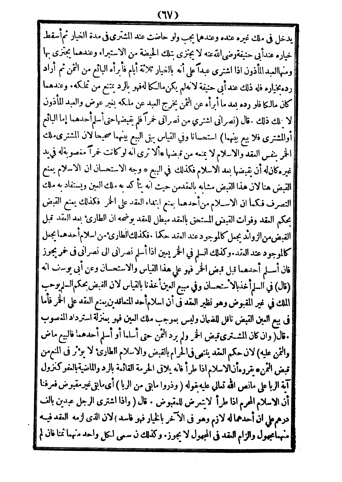 قَالَ: نَصْرَانِيٌّ اشْتَرَى مِنْ نَصْرَانِيٍّ خَمْرًا فَلَمْ يَقْبِضْهَا حَتَّى أَسْلَمَ أَحَدُهُمَا إمَّا الْبَائِعُ أَوْ الْمُشْتَرِي فَلَا بَيْعَ بَيْنَهُمَا اسْتِحْسَانًا، وَفِي الْقِيَاسِ يَبْقَى الْبَيْعُ بَيْنَهُمَا صَحِيحًا؛ لِأَنَّ الْمُشْتَرِيَ مَلَكَ الْخَمْرَ بِنَفْسِ الْعَقْدِ، وَالْإِسْلَامُ لَا يَمْنَعُهُ مِنْ قَبْضِهَا أَلَا تَرَى أَنَّهُ لَوْ كَانَتْ خَمْرًا مَغْصُوبَةً لَهُ فِي يَدِ غَيْرِهِ كَانَ لَهُ أَنْ يَقْبِضَهَا بَعْدَ الْإِسْلَامِ فَكَذَلِكَ فِي الْبَيْعِ، وَجْهُ الِاسْتِحْسَانِ أَنَّ الْإِسْلَامَ يَمْنَعُ الْقَبْضَ هُنَا؛ لِأَنَّ هَذَا الْقَبْضَ مُشَابِهٌ بِالْعَقْدِ مِنْ حَيْثُ إنَّهُ يَتَأَكَّدُ بِهِ مِلْكُ الْعَيْنِ، وَيُسْتَفَادُ بِهِ مِلْكُ التَّصَرُّفِ فَكَمَا أَنَّ الْإِسْلَامَ مِنْ أَحَدِهِمَا يَمْنَعُ ابْتِدَاءَ الْعَقْدِ عَلَى الْخَمْرِ فَكَذَلِكَ يَمْنَعُ الْقَبْضَ بِحُكْمِ الْعَقْدِ وَفَوَاتُ الْقَبْضِ الْمُسْتَحَقِّ بِالْعَقْدِ مُبْطِلٌ لِلْعَقْدِ، يُوَضِّحُهُ أَنَّ الطَّارِئَ بَعْدَ الْعَقْدِ قَبْلَ الْقَبْضِ مِنْ الزَّوَائِدِ يُجْعَلُ كَالْمَوْجُودِ عِنْدَ الْعَقْدِ حُكْمًا فَكَذَلِكَ الطَّارِئُ مِنْ إسْلَامِ أَحَدِهِمَا يُجْعَلُ كَالْمَوْجُودِ عِنْدَ الْعَقْدِ، وَكَذَلِكَ السَّلَمُ فِي الْخَمْرِ يُعَيَّنُ إذَا أَسْلَمَ نَصْرَانِيٌّ إلَى نَصْرَانِيٍّ فِي خَمْرٍ يَجُوزُ، فَإِنْ أَسْلَمَ أَحَدُهُمَا قَبْلَ قَبْضِ الْخَمْرِ فَهُوَ عَلَى هَذَا الْقِيَاسِ وَالِاسْتِحْسَانِ، وَعَنْ أَبِي يُوسُفَ أَنَّهُ قَالَ فِي السَّلَمِ أَخَذَ بِالِاسْتِحْسَانِ وَفِي مَبِيعِ الْعَيْنِ أَخَذْنَا بِالْقِيَاسِ؛ لِأَنَّ الْقَبْضَ بِحُكْمِ السَّلَمِ يُوجِبُ الْمِلْكَ فِي غَيْرِ الْمَقْبُوضِ وَهُوَ نَظِيرُ الْعَقْدِ فِي أَنَّ إسْلَامَ أَحَدِ الْمُتَعَاقِدَيْنِ يَمْنَعُ عَلَى الْخَمْرِ فَأَمَّا فِي بَيْعِ الْعَيْنِ الْقَبْضُ نَاقِلٌ لِلضَّمَانِ وَلَيْسَ بِمُوجِبٍ مِلْكَ الْعَيْنِ فَهُوَ بِمَنْزِلَةِ اسْتِرْدَادِ الْمَغْصُوبِ، قَالَ: وَإِنْ كَانَ الْمُشْتَرِي قَبَضَ الْخَمْرَ، وَلَمْ يَرُدَّ الثَّمَنَ حَتَّى أَسْلَمَا أَوْ أَسْلَمَ أَحَدُهُمَا فَالْبَيْعُ مَاضٍ وَالثَّمَنُ عَلَيْهِ؛ لِأَنَّ حُكْمَ الْعَقْدِ يَنْتَهِي فِي الْحَرَامِ بِالْقَبْضِ، وَالْإِسْلَامُ الطَّارِئُ لَا يُؤَثِّرُ فِي الْمَنْعِ مِنْ قَبْضِ الثَّمَنِ يُقَرِّرُهُ أَنَّ الْإِسْلَامَ إذَا طَرَأَ فَإِنَّهُ يُلَاقِي الْحُرْمَةَ الْقَائِمَةَ بِالرَّدِّ وَالْمَاضِيَةَ بِالْعَفْوِ كَنُزُولِ آيَةِ الرِّبَا عَلَى مَا نَصَّ اللَّهُ تَعَالَى عَلَيْهِ بِقَوْلِهِ {وَذَرُوا مَا بَقِيَ مِنْ الرِّبَا} [البقرة: 278] أَيْ مَا بَقِيَ غَيْرُ مَقْبُوضٍ فَعَرَفْنَا أَنَّ الْإِسْلَامَ الْمُحَرِّمَ إذَا طَرَأَ لَا يَتَعَرَّضُ لِلْمَقْبُوضِ