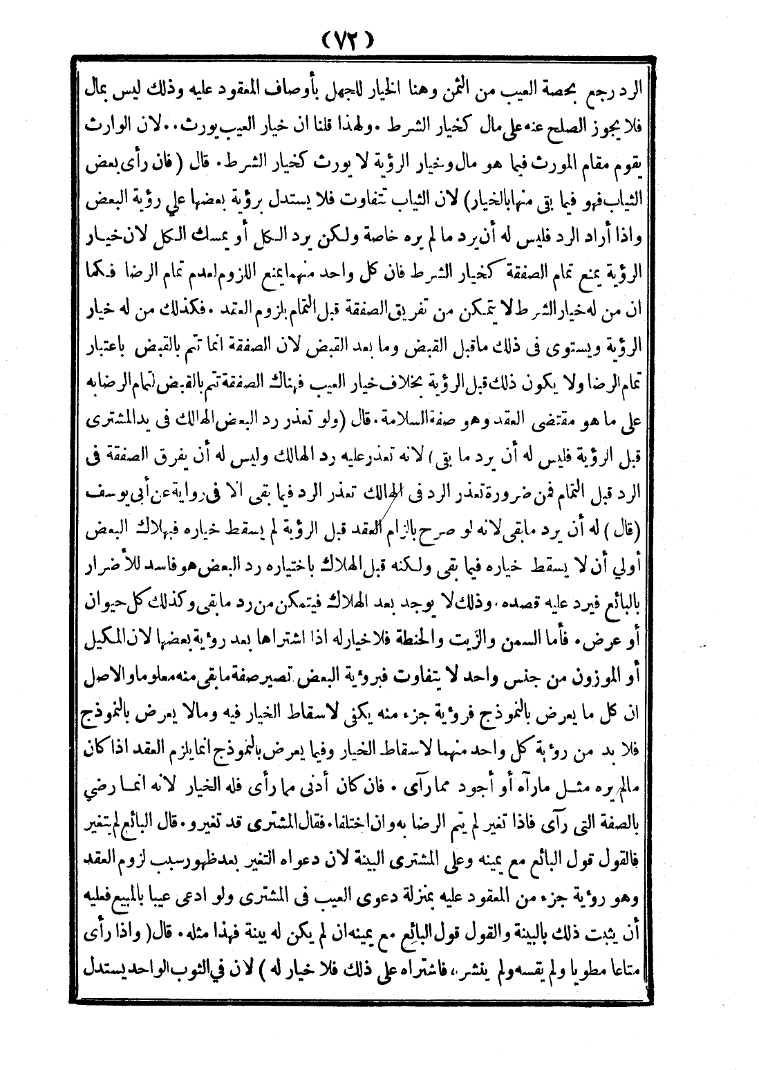 الرَّدُّ رَجَعَ بِحِصَّةِ الْعَيْبِ مِنْ الثَّمَنِ، وَهُنَا الْخِيَارُ لِلْجَهْلِ بِأَوْصَافِ الْمَعْقُودِ عَلَيْهِ وَذَلِكَ لَيْسَ بِمَالٍ فَلَا يَجُوزُ الصُّلْحُ عَنْهُ عَلَى مَالٍ كَخِيَارِ الشَّرْطِ وَلِهَذَا قُلْنَا: إنَّ خِيَارَ الْعَيْبِ يُورَثُ؛ لِأَنَّ الْوَارِثَ يَقُومُ مَقَامَ الْمُوَرِّثِ فِيمَا هُوَ مَالٌ وَخِيَارُ الرُّؤْيَةِ لَا يُورَثُ كَخِيَارِ الشَّرْطِ قَالَ: فَإِنْ رَأَى بَعْضَ الثِّيَابِ فَهُوَ فِيمَا بَقِيَ مِنْهَا بِالْخِيَارِ؛ لِأَنَّ الثِّيَابَ تَتَفَاوَتُ فَلَا يُسْتَدَلُّ بِرُؤْيَةِ بَعْضِهَا عَلَى رُؤْيَةِ الْبَعْضِ.