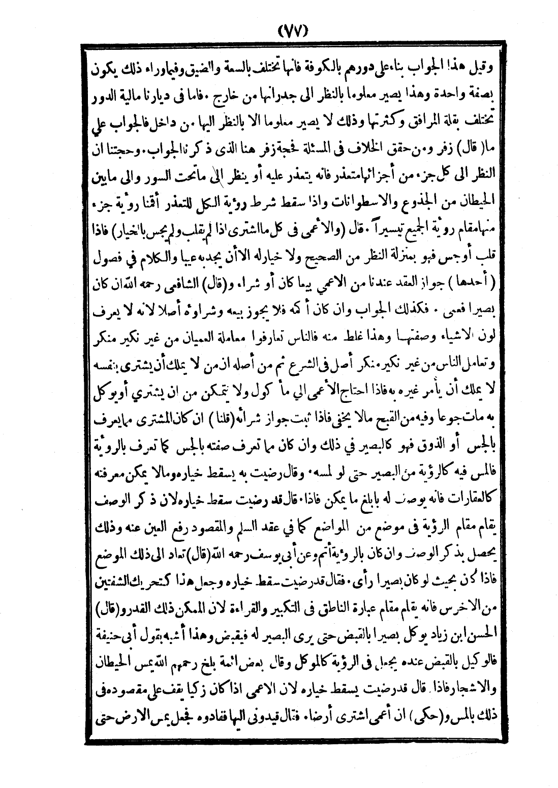 وَقِيلَ: هَذَا الْجَوَابُ بِنَاءً عَلَى دُورِهِمْ بِالْكُوفَةِ فَإِنَّهَا تَخْتَلِفُ بِالسَّعَةِ وَالضِّيقِ وَفِيمَا وَرَاءَ ذَلِكَ يَكُونُ بِصِفَةٍ وَاحِدَةٍ وَهَذَا يَصِيرُ مَعْلُومًا بِالنَّظَرِ إلَى جُدْرَانِهَا مِنْ خَارِجٍ، فَأَمَّا فِي دِيَارِنَا مَالِيَّةُ الدُّورِ تَخْتَلِفُ بِقِلَّةِ الْمَرَافِقِ وَكَثْرَتِهَا، وَذَلِكَ لَا يَصِيرُ مَعْلُومًا إلَّا بِالنَّظَرِ إلَيْهَا مِنْ دَاخِلٍ، فَالْجَوَابُ عَلَى مَا قَالَ زُفَرُ وَمَنْ حَقَّقَ الْخِلَافَ فِي الْمَسْأَلَةِ فَحُجَّةُ زُفَرَ هُنَا الَّذِي ذَكَرْنَا الْجَوَابَ، وَحُجَّتُنَا أَنَّ النَّظَرَ إلَى كُلِّ جُزْءٍ مِنْ أَجْزَائِهَا مُتَعَذِّرٌ فَإِنَّهُ يَتَعَذَّرُ عَلَيْهِ أَوْ يَنْظُرُ إلَى مَا تَحْتَ السُّورِ وَإِلَى مَا بَيْنَ الْحِيطَانِ مِنْ الْجُذُوعِ وَالْأُسْطُوَانَات وَإِذَا سَقَطَ شَرْطُ رُؤْيَةِ الْكُلِّ لِلتَّعَذُّرِ أَقَمْنَا رُؤْيَةَ جُزْءٍ مِنْهَا مَقَامَ رُؤْيَةِ الْجَمِيعِ تَيْسِيرًا