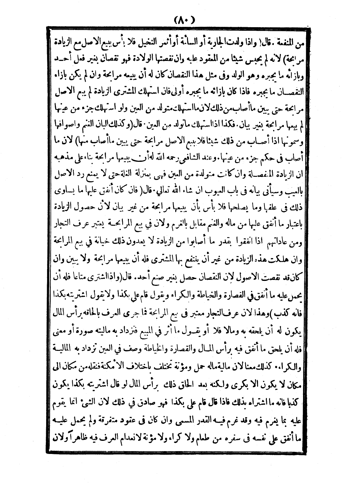 قَالَ: وَإِذَا وَلَدَتْ الْجَارِيَةُ أَوْ السَّائِبَةُ أَوْ أَثْمَرَ النَّخِيلُ فَلَا بَأْسَ بِبَيْعِ الْأَصْلِ مَعَ الزِّيَادَةِ مُرَابَحَةً؛ لِأَنَّهُ لَمْ يَحْبِسْ شَيْئًا مِنْ الْمَعْقُودِ عَلَيْهِ، وَإِنْ نَقَصَتْهَا الْوِلَادَةُ فَهُوَ نُقْصَانٌ بِغَيْرِ فِعْلِ أَحَدٍ وَبِإِزَائِهِ مَا يَجْبُرُهُ وَهُوَ الْوَلَدُ وَفِي مِثْلِ هَذَا النُّقْصَانِ كَانَ لَهُ أَنْ يَبِيعَهُ مُرَابَحَةً، وَإِنْ لَمْ يَكُنْ بِإِزَاءِ النُّقْصَانِ مَا يَجْبُرُهُ فَإِذَا كَانَ بِإِزَائِهِ مَا يَجْبُرُهُ أَوْلَى، فَإِنْ اسْتَهْلَكَ الْمُشْتَرِي الزِّيَادَةَ لَمْ يَبِعْ الْأَصْلَ مُرَابَحَةً حَتَّى يُبَيِّنَ مَا أَصَابَ مِنْ ذَلِكَ؛ لِأَنَّ مَا اُسْتُهْلِكَ مُتَوَلِّدٌ مِنْ الْعَيْنِ وَلَوْ اُسْتُهْلِكَ جُزْءٌ مِنْ عَيْنِهَا لَمْ يَبِعْهَا مُرَابَحَةً بِغَيْرِ بَيَانٍ فَكَذَا إذَا اسْتَهْلَكَ مَا تَوَلَّدَ مِنْ الْعَيْنِ