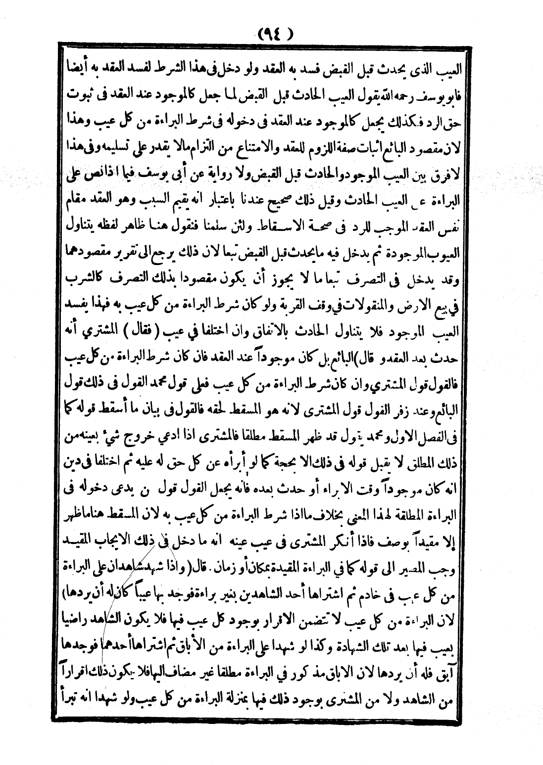 الْعَيْبِ الَّذِي يَحْدُثُ قَبْلَ الْقَبْضِ فَسَدَ بِهِ الْعَقْدُ وَلَوْ دَخَلَ فِي هَذَا الشَّرْطِ لَفَسَدَ الْعَقْدُ بِهِ أَيْضًا فَأَبُو يُوسُفَ - رَحِمَهُ اللَّهُ - يَقُولُ الْعَيْبُ الْحَادِثُ قَبْلَ الْقَبْضِ لَمَّا جُعِلَ كَالْمَوْجُودِ عِنْدَ الْعَقْدِ فِي ثُبُوتِ حَقِّ الرَّدِّ فَكَذَلِكَ يُجْعَلُ كَالْمَوْجُودِ عِنْدَ الْعَقْدِ فِي دُخُولِهِ فِي شَرْطِ الْبَرَاءَةِ مِنْ كُلِّ عَيْبٍ وَهَذَا؛ لِأَنَّ مَقْصُودَ الْبَائِعِ إثْبَاتُ صِفَةِ اللُّزُومِ لِلْعَقْدِ وَالِامْتِنَاعُ مِنْ الْتِزَامِ مَا لَا يَقْدِرُ عَلَى تَسْلِيمِهِ، وَفِي هَذَا لَا فَرْقَ بَيْنَ الْعَيْبِ الْمَوْجُودِ وَالْحَادِثِ قَبْلَ الْقَبْضِ وَلَا رِوَايَةَ عَنْ أَبِي يُوسُفَ فِيمَا إذَا نَصَّ عَلَى الْبَرَاءَةِ عَنْ الْعَيْبِ الْحَادِثِ.