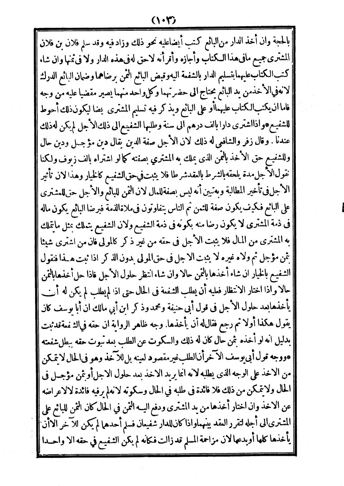 وَإِذَا اشْتَرَى دَارًا بِأَلْفِ دِرْهَمٍ إلَى سَنَةٍ وَطَلَبهَا الشَّفِيعُ إلَى ذَلِكَ الْأَجَلِ لَمْ يَكُنْ لَهُ ذَلِكَ عِنْدَنَا. وَقَالَ زُفَرُ وَالشَّافِعِيُّ لَهُ ذَلِكَ؛ لِأَنَّ الْأَجَلَ صِفَةُ الدَّيْنِ يُقَالُ دَيْنٌ مُؤَجَّلٌ وَدَيْنٌ حَالٌّ وَلِلشَّفِيعِ حَقُّ الْأَخْذِ بِالثَّمَنِ الَّذِي يَمْلِكُ بِهِ الْمُشْتَرِي بِصِفَتِهِ كَمَا لَوْ اشْتَرَاهُ بِأَلْفٍ زُيُوفٍ، وَلَكِنَّا نَقُولُ الْأَجَلُ مُدَّةً يَلْحَقُهُ بِالشَّرْطِ بِالْعَقْدِ شَرْطٌ، فَلَا يَثْبُتُ فِي حَقِّ الشَّفِيعِ كَالْخِيَارِ وَهَذَا؛ لِأَنَّ تَأْثِيرَ الْأَجَلِ فِي تَأْخِيرِ الْمُطَالَبَةِ، وَبِهِ تَبَيَّنَ أَنَّهُ لَيْسَ بِصِفَةٍ لِلْمَالِ؛ لِأَنَّ الثَّمَنَ لِلْبَائِعِ، وَالْأَجَلَ حَقٌّ لِلْمُشْتَرِي عَلَى الْبَائِعِ فَكَيْفَ يَكُونُ صِفَةً لِلثَّمَنِ، ثُمَّ النَّاسُ يَتَفَاوَتُونَ فِي مَلَاةِ الذِّمَّةِ فَبِرِضَا الْبَائِعِ يَكُونُ مَالُهُ فِي ذِمَّةِ الْمُشْتَرِي لَا يَكُونُ رِضًا مِنْهُ بِكَوْنِهِ فِي ذِمَّةِ الشَّفِيعِ؛ وَلِأَنَّ الشَّفِيعَ يَتَمَلَّكُ بِمِثْلِ مَا يَتَمَلَّكُ بِهِ الْمُشْتَرِي مِنْ الْمَالِ، فَلَا يَثْبُتُ الْأَجَلُ فِي حَقِّهِ مِنْ غَيْرِ ذِكْرٍ كَالْمَوْلَى، فَإِنَّ مَنْ اشْتَرَى شَيْئًا بِثَمَنٍ مُؤَجَّلٍ، ثُمَّ وَلَّاهُ غَيْرُهُ لَا يَثْبُتُ الْأَجَلُ فِي حَقِّ الْمَوْلَى بِدُونِ الذِّكْرِ إذَا ثَبَتَ هَذَا، فَنَقُولُ: الشَّفِيعُ بِالْخِيَارِ إنْ شَاءَ أَخَذَهَا بِالثَّمَنِ حَالًّا وَإِنْ شَاءَ انْتَظَرَ حُلُولَ الْأَجَلِ فَإِذَا حَلَّ أَخَذَهَا بِالثَّمَنِ حَالًّا وَإِذَا اخْتَارَ الِانْتِظَارَ فَعَلَيْهِ أَنْ يَطْلُبَ الشُّفْعَةَ فِي الْحَالِ حَتَّى إذَا لَمْ يَطْلُبْ لَمْ يَكُنْ لَهُ أَنْ يَأْخُذَهَا بَعْدَ حُلُولِ الْأَجَلِ فِي قَوْلِ أَبِي حَنِيفَةَ وَمُحَمَّدٍ وَذَكَرَ ابْنُ أَبِي مَالِكٍ أَنَّ أَبَا يُوسُفَ كَانَ يَقُولُ هَكَذَا أَوَّلًا، ثُمَّ رَجَعَ، فَقَالَ: لَهُ: أَنْ يَأْخُذَهَا وَجْهُ ظَاهِرِ الرِّوَايَةِ أَنَّ حَقَّهُ فِي الشُّفْعَةِ قَدْ ثَبَتَ بِدَلِيلِ أَنَّهُ لَوْ أَخَذَهُ بِثَمَنٍ حَالٍّ كَانَ لَهُ ذَلِكَ، وَالسُّكُوتُ عَنْ الطَّلَبِ بَعْدَ ثُبُوتِ حَقِّهِ يُبْطِلُ شُفْعَتَهُ وَوَجْهُ قَوْلِ أَبِي يُوسُفَ الْآخَرُ أَنَّ الطَّلَبَ غَيْرُ مَقْصُودٍ لَعَيْنِهِ، بَلْ لِلْآخِذِ، وَهُوَ فِي الْحَالِ لَا يَتَمَكَّنُ مِنْ الْأَخْذِ عَلَى الْوَجْهِ الَّذِي يَطْلُبُهُ؛ لِأَنَّهُ إنَّمَا يُرِيدُ الْأَخْذَ بَعْدَ حُلُولِ الْأَجَلِ، أَوْ بِثَمَنٍ مُؤَجَّلٍ فِي الْحَالِ، وَلَا يَتَمَكَّنُ مِنْ ذَلِكَ، فَلَا فَائِدَةَ فِي طَلَبِهِ فِي الْحَالِ وَسُكُوتِهِ؛ لِأَنَّهُ لَمْ يَرَ فِيهِ فَائِدَةً لَا لِإِعْرَاضِهِ عَنْ الْأَخْذِ، وَإِنْ اخْتَارَ أَخْذَهَا مِنْ يَدِ الْمُشْتَرِي وَدَفَعَ إلَيْهِ الثَّمَنَ فِي الْحَالِ كَانَ الثَّمَنُ لِلْبَائِعِ عَلَى الْمُشْتَرِي إلَى أَجَلِهِ لِتَقَرُّرِ الْعَقْدِ بَيْنَهُمَا.