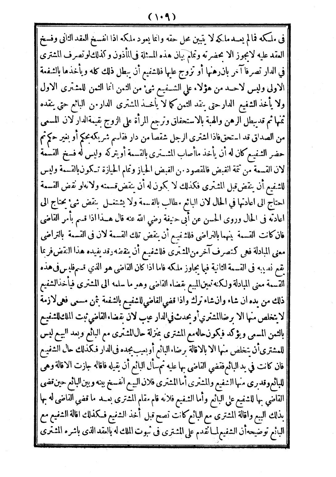 فِي مِلْكِهِ فَمَا لَمْ يَعُدْ مِلْكُهُ لَا يَتَبَيَّنُ مَحَلُّ حَقِّهِ، وَإِنَّمَا يَعُودُ مِلْكُهُ إذَا انْفَسَخَ الْعَقْدُ الثَّانِي وَفَسْخُ الْعَقْدِ عَلَيْهِ لَا يَجُوزُ، إلَّا بِحَضْرَتِهِ وَتَمَامُ بَيَانِ هَذِهِ الْمَسْأَلَةِ فِي الْمَأْذُونِ، وَكَذَلِكَ لَوْ تَصَرَّفَ الْمُشْتَرِي فِي الدَّارِ تَصَرُّفًا آخَرَ بِأَنْ رَهَنَهَا، أَوْ تَزَوَّجَ عَلَيْهَا فَلِلشَّفِيعِ أَنْ يُبْطِلَ ذَلِكَ كُلَّهُ وَيَأْخُذَهَا بِالشُّفْعَةِ الْأُولَى، وَلَيْسَ لِأَحَدٍ مِنْ هَؤُلَاءِ عَلَى الشَّفِيعِ شَيْءٌ مِنْ الثَّمَنِ إنَّمَا الثَّمَنُ لِلْمُشْتَرِي الْأَوَّلِ، وَلَا يَأْخُذُ الشَّفِيعُ الدَّارَ حَتَّى يَنْقُدَ الثَّمَنَ كَمَا لَا يَأْخُذُ الْمُشْتَرِي الدَّارَ مِنْ الْبَائِعِ حَتَّى يَنْقُدَهُ ثَمَنَهَا، ثُمَّ قَدْ يَبْطُلُ الرَّهْنُ، وَالْهِبَةُ بِالِاسْتِحْقَاقِ وَتَرْجِعُ الْمَرْأَةُ عَلَى الزَّوْجِ بِقِيمَةِ الدَّارِ؛ لِأَنَّ الْمُسَمَّى مِنْ الصَّدَاقِ قَدْ اُسْتُحِقَّ