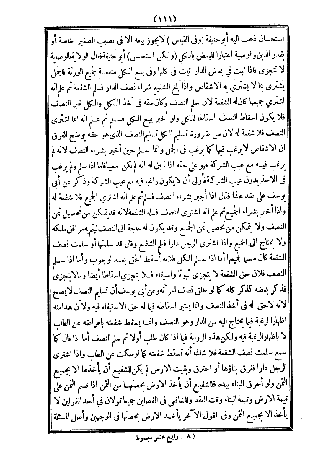 اسْتِحْسَانٌ ذَهَبَ إلَيْهِ أَبُو حَنِيفَةَ (وَفِي الْقِيَاسِ) لَا يَجُوزُ بَيْعُهُ، إلَّا فِي نَصِيبِ الصَّغِيرِ خَاصَّةً، أَوْ بِقَدْرِ الدَّيْنِ، وَالْوَصِيَّةُ اعْتِبَارٌ لِلْبَعْضِ بِالْكُلِّ (وَلَكِنْ اسْتَحْسَنَ) أَبُو حَنِيفَةَ، فَقَالَ: الْوِلَايَةُ بِالْوِصَايَةِ لَا تَتَجَزَّأُ، فَإِذَا ثَبَتَ فِي بَعْضِ الدَّارِ ثَبَتَ فِي كُلِّهَا وَفِي بَيْعِ الْكُلِّ مَنْفَعَةٌ لِجَمِيعِ الْوَرَثَةِ، فَالْجُمُلُ يُشْتَرَى بِمَا لَا يُشْتَرَى بِهِ الْأَشْقَاصُ وَإِذَا بَلَغَ الشَّفِيعُ شِرَاءَ نِصْفِ الدَّارِ فَسَلَّمَ الشُّفْعَةَ، ثُمَّ عَلِمَ أَنَّهُ اشْتَرَى جَمِيعَهَا كَانَ لَهُ الشُّفْعَةُ؛ لِأَنَّهُ سَلَّمَ النِّصْفَ وَكَانَ حَقُّهُ فِي أَخْذِ الْكُلِّ، وَالْكُلُّ غَيْرُ النِّصْفِ، فَلَا يَكُونُ إسْقَاطُ النِّصْفِ إسْقَاطًا لِلْكُلِّ وَلَوْ أُخْبِرَ بَيْع الْكُلّ فَسَلَّمَ، ثُمَّ عِلْم أَنَّهُ إنَّمَا اشْتَرَى النِّصْف، فَلَا شُفْعَة لَهُ؛ لِأَنَّ مِنْ ضَرُورَة تَسْلِيم الْكُلّ تَسْلِيم النِّصْف الَّذِي هُوَ حَقّه يُوضِح الْفَرْق أَنَّ الْأَشْقَاص لَا يُرْغَب فِيهَا كَمَا يُرْغَب فِي الْجُمَل، وَإِنَّمَا سَلَّمَ حِين أُخْبِرَ بِشِرَاءِ النِّصْفِ؛ لِأَنَّهُ لَمْ يَرْغَبْ فِيهِ مَعَ عَيْبِ الشَّرِكَةِ، فَهُوَ عَلَى حَقِّهِ إذَا تَبَيَّنَ لَهُ أَنَّهُ لَمْ يَكُنْ مَعِيبًا