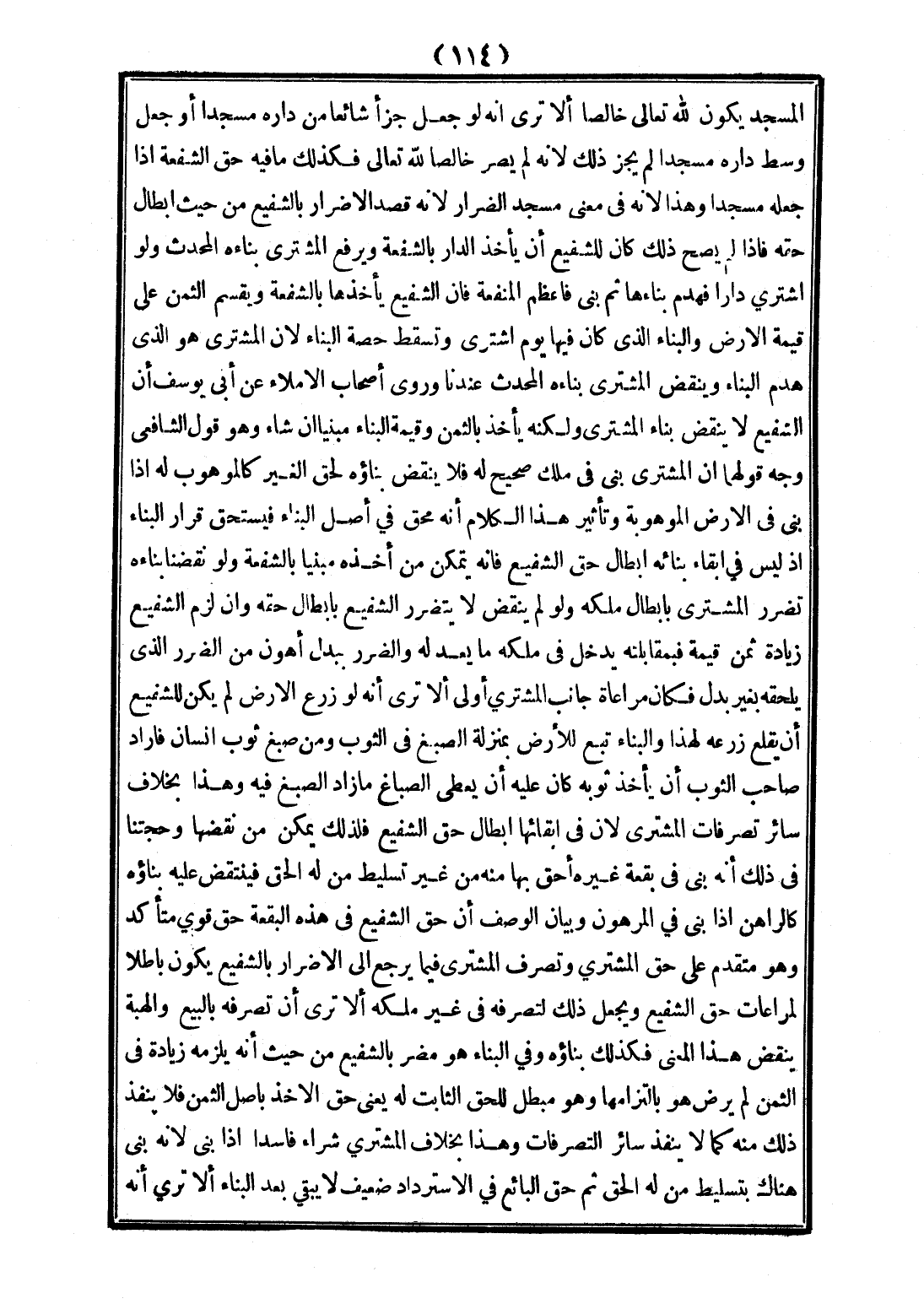 الْمَسْجِدَ يَكُونُ لِلَّهِ تَعَالَى خَالِصًا، أَلَا تَرَى أَنَّهُ لَوْ جَعَلَ جُزْءًا شَائِعًا مِنْ دَارِهِ مَسْجِدًا، أَوْ جَعَلَ وَسْطَ دَارِهِ مَسْجِدًا لَمْ يَجُزْ ذَلِكَ؛ لِأَنَّهُ لَمْ يَصِرْ خَالِصًا لِلَّهِ تَعَالَى فَكَذَلِكَ مَا فِيهِ حَقُّ الشُّفْعَةِ إذَا جَعَلَهُ مَسْجِدًا وَهَذَا؛ لِأَنَّهُ فِي مَعْنَى مَسْجِدِ الضِّرَارِ؛ لِأَنَّهُ قَصَدَ الْإِضْرَارَ بِالشَّفِيعِ مِنْ حَيْثُ إبْطَالُ حَقِّهِ، فَإِذَا لَمْ يَصِحَّ ذَلِكَ كَانَ لِلشَّفِيعِ أَنْ يَأْخُذَ الدَّارَ بِالشُّفْعَةِ، وَيَرْفَعُ الْمُشْتَرِي بِنَاءَهُ الْمُحْدَثَ.