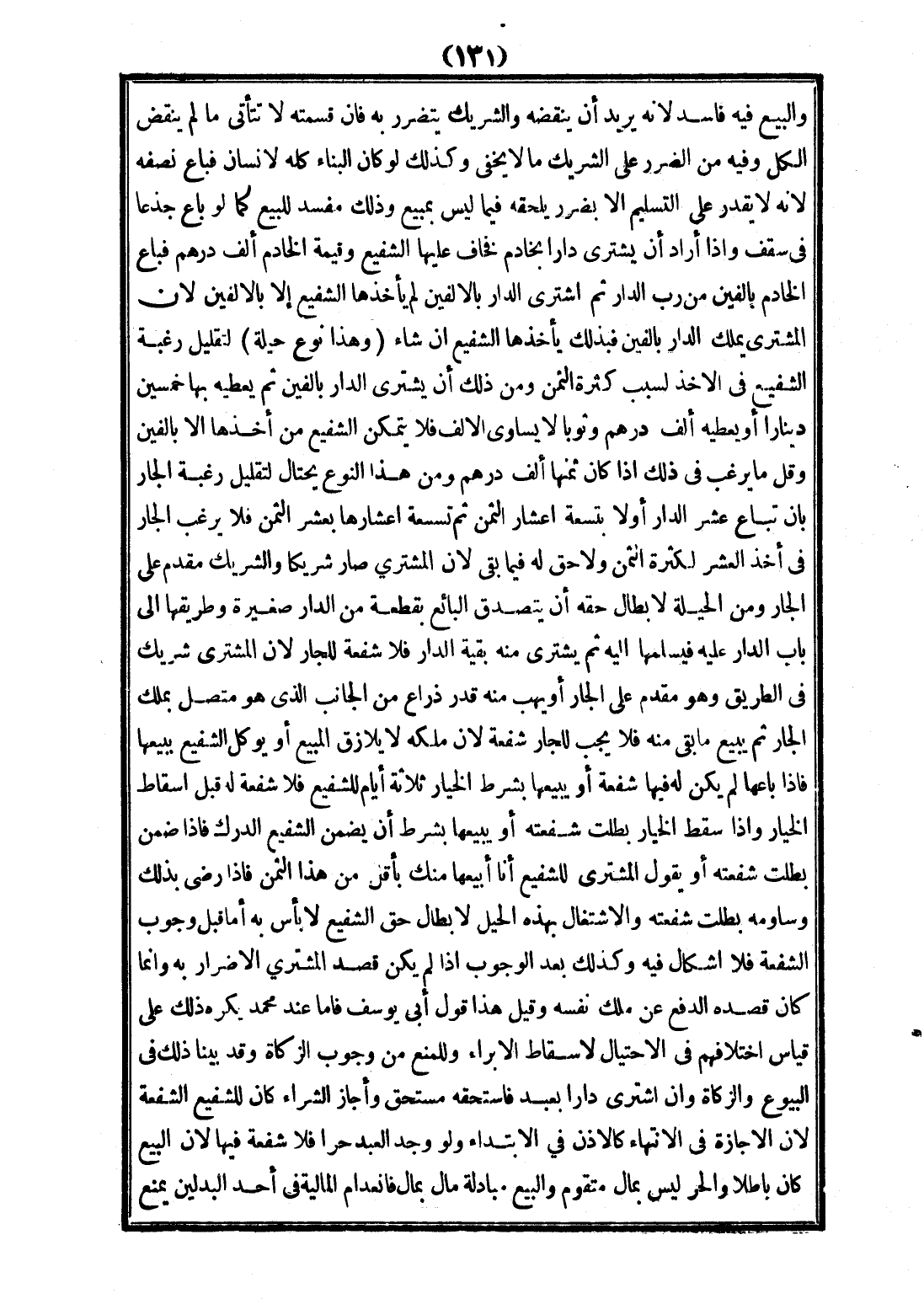 وَإِذَا أَرَادَ أَنْ يَشْتَرِيَ دَارًا بِخَادِمٍ فَخَافَ عَلَيْهَا الشَّفِيعَ وَقِيمَةُ الْخَادِمِ أَلْفُ دِرْهَمٍ فَبَاعَ الْخَادِمَ بِأَلْفَيْنِ مِنْ رَبِّ الدَّارِ، ثُمَّ اشْتَرَى الدَّارَ بِالْأَلْفَيْنِ لَمْ يَأْخُذْهَا الشَّفِيعُ، إلَّا بِالْأَلْفَيْنِ؛ لِأَنَّ الْمُشْتَرِيَ يَمْلِكُ الدَّارَ بِأَلْفَيْنِ فَبِذَلِكَ يَأْخُذُهَا الشَّفِيعُ إنْ شَاءَ (وَهَذَا نَوْعُ حِيلَةٍ) لِتَقْلِيلِ رَغْبَةِ الشَّفِيعِ فِي الْأَخْذِ لِسَبَبِ كَثْرَةِ الثَّمَنِ، وَمِنْ ذَلِكَ أَنْ يَشْتَرِيَ الدَّارَ بِأَلْفَيْنِ، ثُمَّ يُعْطِيَهُ بِهَا خَمْسِينَ دِينَارًا، أَوْ يُعْطِيَهُ أَلْفَ دِرْهَمٍ وَثَوْبًا لَا يُسَاوِي الْأَلْفَ، فَلَا يَتَمَكَّنُ الشَّفِيعُ مِنْ أَخْذِهَا، إلَّا بِأَلْفَيْنِ وَقَلَّ مَا يَرْغَبُ فِي ذَلِكَ إذَا كَانَ ثَمَنُهَا أَلْفَ دِرْهَمٍ. وَمِنْ هَذَا النَّوْعِ يَحْتَالُ لِتَقْلِيلِ رَغْبَةِ الْجَارِ بِأَنْ يُبَاعَ عُشْرُ الدَّارِ أَوَّلًا بِتِسْعَةِ أَعْشَارِ الثَّمَنِ، ثُمَّ تِسْعَةُ أَعْشَارِهَا بِعُشْرِ الثَّمَنِ، فَلَا يَرْغَبُ الْجَارُ فِي أَخْذِ الْعُشْرِ لِكَثْرَةِ الثَّمَنِ، وَلَا حَقَّ لَهُ فِيمَا بَقِيَ؛ لِأَنَّ الْمُشْتَرِيَ صَارَ شَرِيكًا، وَالشَّرِيكُ مُقَدَّمٌ عَلَى الْجَارِ، وَمِنْ الْحِيلَةِ لِإِبْطَالِ حَقِّهِ أَنْ يَتَصَدَّقُ الْبَائِعُ بِقِطْعَةٍ مِنْ الدَّارِ صَغِيرَةٍ وَطَرِيقُهَا إلَى بَابِ الدَّارِ عَلَيْهِ فَيُسَلِّمُهَا إلَيْهِ، ثُمَّ يَشْتَرِي مِنْهُ بَقِيَّةَ الدَّارِ، فَلَا شُفْعَةَ لِلْجَارِ؛ لِأَنَّ الْمُشْتَرِيَ شَرِيكٌ فِي الطَّرِيقِ وَهُوَ مُقَدَّمٌ عَلَى الْجَارِ، أَوْ يَهَبُ مِنْهُ قَدْرَ ذِرَاعٍ مِنْ الْجَانِبِ الَّذِي هُوَ مُتَّصِلٌ بِمِلْكِ الْجَارِ، ثُمَّ يَبِيعُ مَا بَقِيَ مِنْهُ، فَلَا يَجِبُ لِلْجَارِ شُفْعَةٌ؛ لِأَنَّ مِلْكَهُ لَا يُلَازِقُ الْمَبِيعَ، أَوْ يُوَكَّلُ الشَّفِيعُ بِبَيْعِهَا، فَإِذَا بَاعَهَا لَمْ يَكُنْ لَهُ فِيهَا شُفْعَةٌ، أَوْ يَبِيعُهَا بِشَرْطِ الْخِيَارِ ثَلَاثَةَ أَيَّامٍ لِلشَّفِيعِ، فَلَا شُفْعَةَ لَهُ قَبْلَ إسْقَاطِ الْخِيَارِ وَإِذَا سَقَطَ الْخِيَارُ بَطَلَتْ شُفْعَتُهُ، أَوْ يَبِيعُهَا بِشَرْطِ أَنْ يَضْمَنَ الشَّفِيعُ الدَّرَكَ، فَإِذَا ضَمِنَ بَطَلَتْ شُفْعَتُهُ، أَوْ يَقُولُ: الْمُشْتَرِي لِلشَّفِيعِ أَنَا أَبِيعُهَا مِنْك بِأَقَلَّ مِنْ هَذَا الثَّمَنِ، فَإِذَا رَضِيَ بِذَلِكَ وَسَاوَمَهُ بَطَلَتْ شُفْعَتُهُ، وَالِاشْتِغَالُ بِهَذِهِ الْحِيَلِ لِإِبْطَالِ حَقِّ الشَّفِيعِ لَا بَأْسَ بِهِ أَمَّا قَبْلَ وُجُوبِ الشُّفْعَةِ، فَلَا إشْكَالَ فِيهِ، وَكَذَلِكَ بَعْدَ الْوُجُوبِ إذَا لَمْ يَكُنْ قَصْدُ الْمُشْتَرِي الْإِضْرَارَ بِهِ، وَإِنَّمَا كَانَ قَصْدُهُ الدَّفْعَ عَنْ مِلْكِ نَفْسِهِ وَقِيلَ هَذَا قَوْلُ أَبِي يُوسُفَ، فَأَمَّا عِنْدَ مُحَمَّدٍ يُكْرَهُ ذَلِكَ عَلَى قِيَاسِ اخْتِلَافِهِمْ فِي الِاحْتِيَالِ لِإِسْقَاطِ الْإِبْرَاءِ وَلِلْمَنْعِ مِنْ وُجُوبِ الزَّكَاةِ، وَقَدْ بَيَّنَّا ذَلِكَ فِي الْبُيُوعِ، وَالزَّكَاةِ.