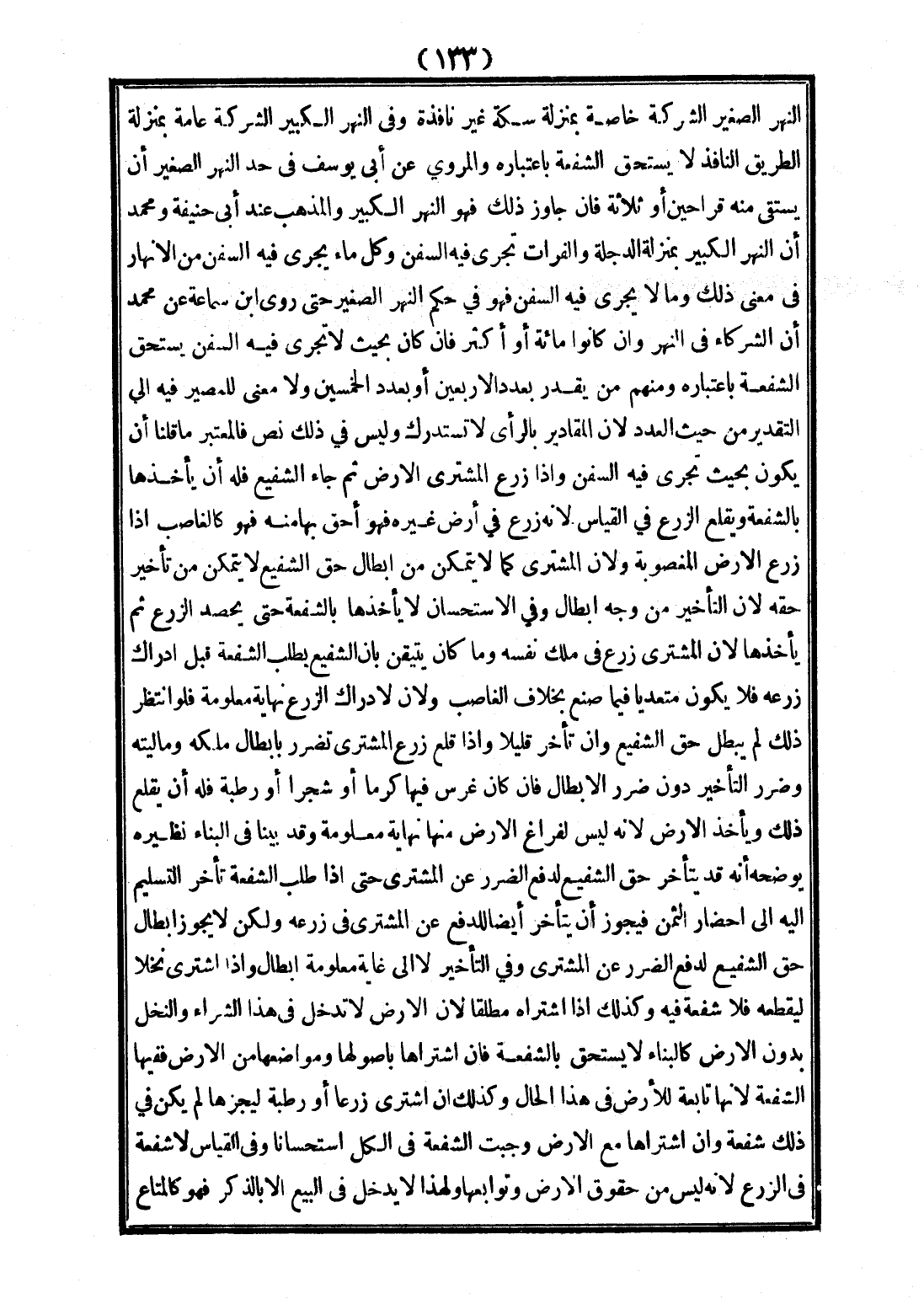 النَّهْرِ الصَّغِيرِ الشَّرِكَةُ خَاصَّةٌ بِمَنْزِلَةِ سِكَّةٍ غَيْرِ نَافِذَةٍ وَفِي النَّهْرِ الْكَبِيرِ الشَّرِكَةُ عَامَّةٌ بِمَنْزِلَةِ الطَّرِيقِ النَّافِذِ لَا يَسْتَحِقُّ الشُّفْعَةَ بِاعْتِبَارِهِ. وَالْمَرْوِيُّ عَنْ أَبِي يُوسُفَ فِي حَدِّ النَّهْرِ الصَّغِيرِ أَنْ يَسْتَقِيَ مِنْهُ قَرَاحَيْنِ، أَوْ ثَلَاثَةً، فَإِنْ جَاوَزَ ذَلِكَ، فَهُوَ النَّهْرُ الْكَبِيرُ، وَالْمَذْهَبُ عِنْدَ أَبِي حَنِيفَةَ وَمُحَمَّدٍ أَنَّ النَّهْرَ الْكَبِيرَ بِمَنْزِلَةِ الدِّجْلَةِ، وَالْفُرَاتُ تَجْرِي فِيهِ السُّفُنُ، وَكُلُّ مَاءٍ يَجْرِي فِيهِ السُّفُنُ مِنْ الْأَنْهَارِ فِي مَعْنَى ذَلِكَ وَمَا لَا يَجْرِي فِيهِ السُّفُنُ، فَهُوَ فِي حُكْمِ النَّهْرِ الصَّغِيرِ حَتَّى رَوَى ابْنُ سِمَاعَةَ عَنْ مُحَمَّدٍ أَنَّ الشُّرَكَاءَ فِي النَّهْرِ وَإِنْ كَانُوا مِائَةً، أَوْ أَكْثَرَ، فَإِنْ كَانَ بِحَيْثُ لَا تَجْرِي فِيهِ السُّفُنُ يَسْتَحِقُّ الشُّفْعَةَ بِاعْتِبَارِهِ وَمِنْهُمْ مَنْ يُقَدِّرُ بِعَدَدِ الْأَرْبَعِينَ، أَوْ بِعَدَدِ الْخَمْسِينَ، وَلَا مَعْنَى لِلْمَصِيرِ فِيهِ إلَى التَّقْدِيرِ مِنْ حَيْثُ الْعَدَدُ؛ لِأَنَّ الْمَقَادِيرَ بِالرَّأْيِ لَا تُسْتَدْرَكُ، وَلَيْسَ فِي ذَلِكَ نَصٌّ، فَالْمُعْتَبَرُ مَا قُلْنَا أَنْ يَكُونَ بِحَيْثُ تَجْرِي فِيهِ السُّفُنُ.