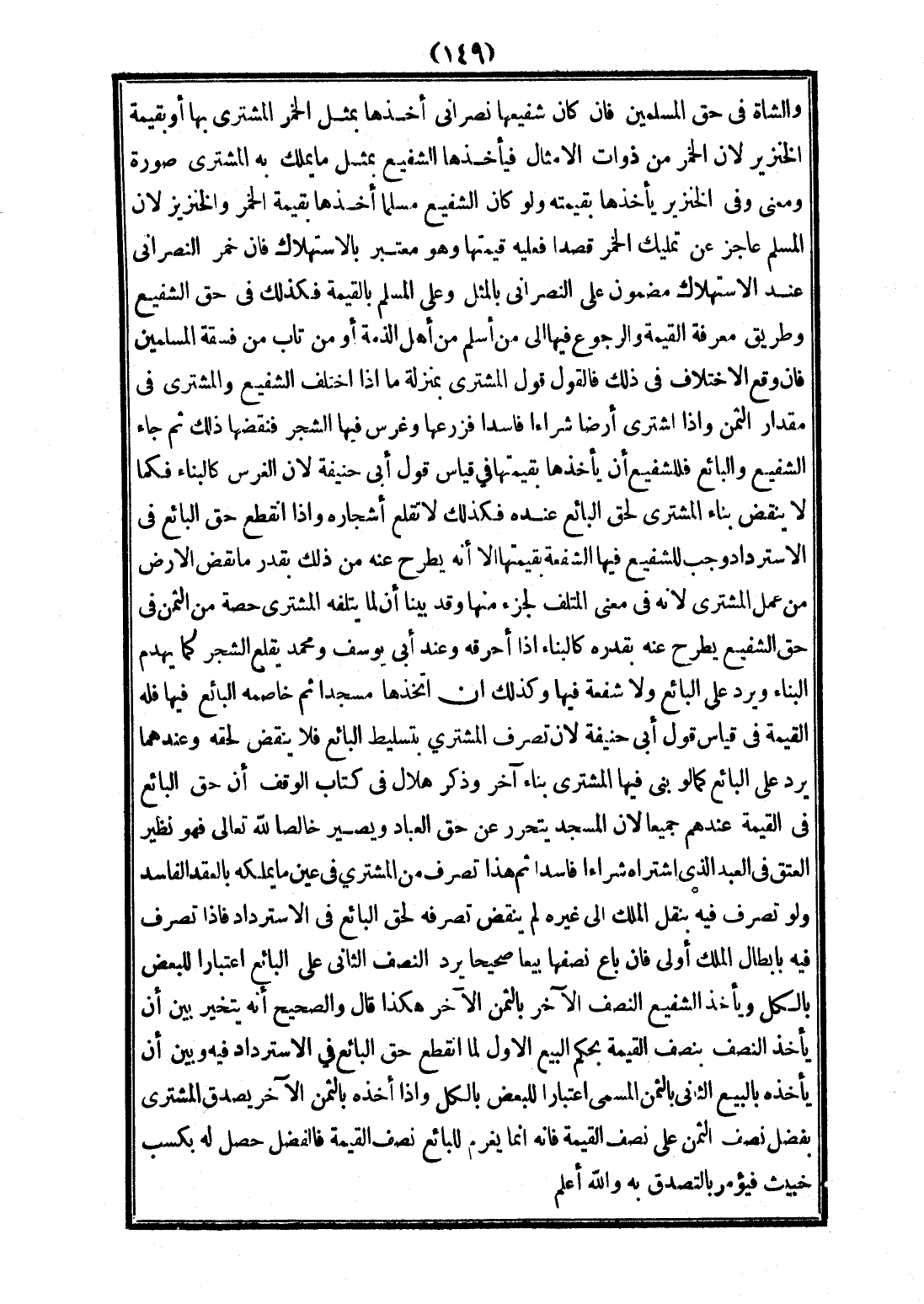 وَالشَّاةِ فِي حَقِّ الْمُسْلِمِينَ، فَإِنْ كَانَ شَفِيعُهَا نَصْرَانِيًّا أَخَذَهَا بِمِثْلِ الْخَمْرِ الْمُشْتَرَى بِهَا أَوْ بِقِيمَةِ الْخِنْزِيرِ؛ لِأَنَّ الْخَمْرَ مِنْ ذَوَاتِ الْأَمْثَالِ فَيَأْخُذُهَا الشَّفِيعُ بِمِثْلِ مَا يُمْلَكُ بِهِ الْمُشْتَرَى صُورَةً وَمَعْنًى، وَفِي الْخِنْزِيرِ يَأْخُذُهَا بِقِيمَتِهِ وَلَوْ كَانَ الشَّفِيعُ مُسْلِمًا أَخَذَهَا بِقِيمَةِ الْخَمْرِ، وَالْخِنْزِيرِ؛ لِأَنَّ الْمُسْلِمَ عَاجِزٌ عَنْ تَمْلِيكِ الْخَمْرِ قَصْدًا فَعَلَيْهِ قِيمَتُهَا وَهُوَ مُعْتَبَرٌ بِالِاسْتِهْلَاكِ، فَإِنَّ خَمْرَ النَّصْرَانِيِّ عِنْدَ الِاسْتِهْلَاكِ مَضْمُونٌ عَلَى النَّصْرَانِيِّ بِالْمِثْلِ وَعَلَى الْمُسْلِمِ بِالْقِيمَةِ فَكَذَلِكَ فِي حَقِّ الشَّفِيعِ، وَطَرِيقُ مَعْرِفَةِ الْقِيمَةِ وَالرُّجُوعُ فِيهَا إلَى مَنْ أَسْلَمَ مِنْ أَهْلِ الذِّمَّةِ، أَوْ مَنْ تَابَ مِنْ فَسَقَةِ الْمُسْلِمِينَ، فَإِنْ وَقَعَ الِاخْتِلَافُ فِي ذَلِكَ، فَالْقَوْلُ قَوْلُ الْمُشْتَرِي بِمَنْزِلَةِ مَا إذَا اخْتَلَفَ الشَّفِيعُ، وَالْمُشْتَرِي فِي مِقْدَارِ الثَّمَنِ.