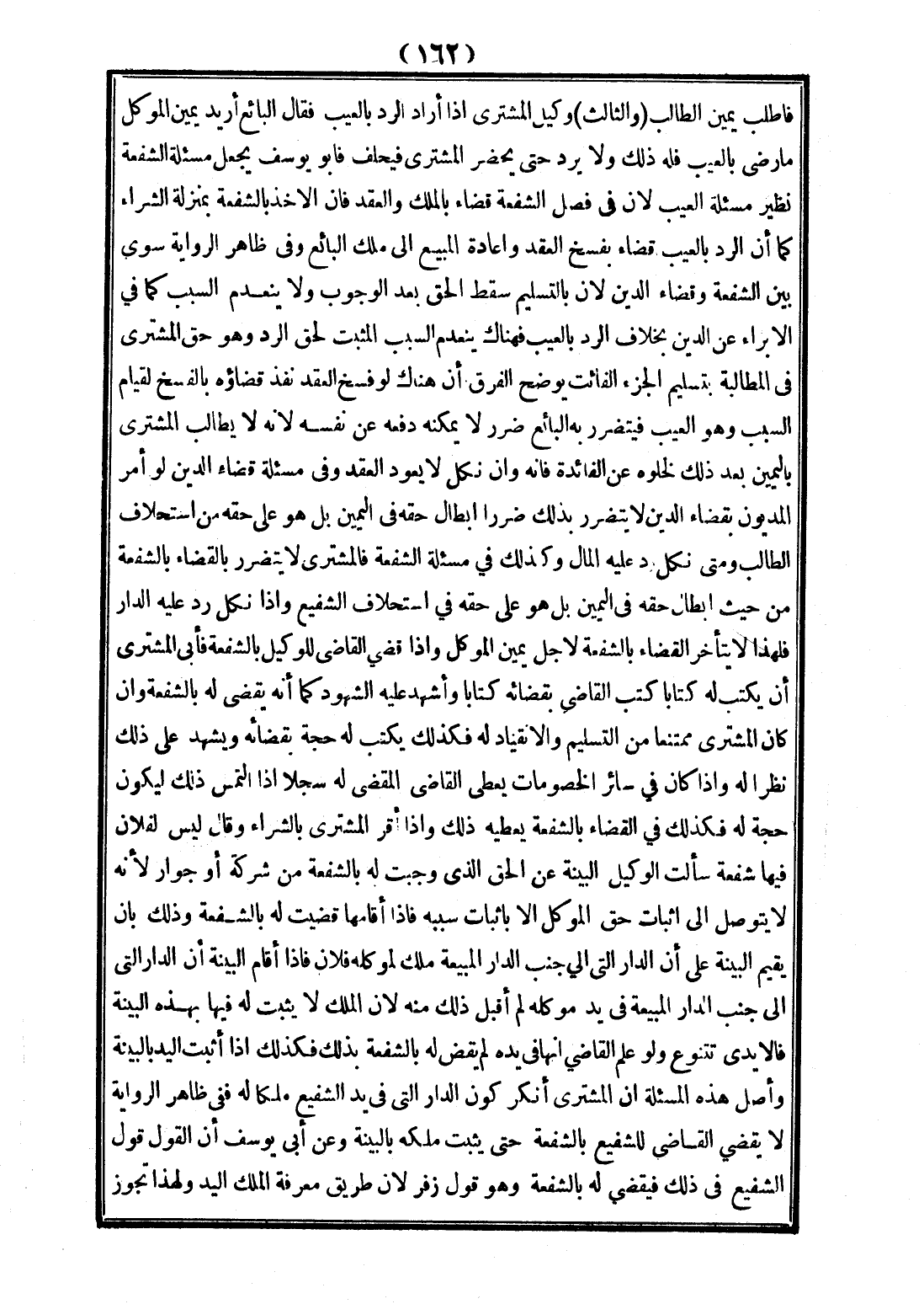فَاطْلُبْ يَمِينَ الطَّالِبِ (وَالثَّالِثُ) وَكِيلُ الْمُشْتَرِي إذَا أَرَادَ الرَّدَّ بِالْعَيْبِ، فَقَالَ الْبَائِعُ: أُرِيدُ يَمِينَ الْمُوَكِّلِ مَا رَضِيَ بِالْعَيْبِ فَلَهُ ذَلِكَ، وَلَا يُرَدُّ حَتَّى يَحْضُرَ الْمُشْتَرِي فَيَحْلِفَ فَأَبُو يُوسُفَ يَجْعَلُ مَسْأَلَةَ الشُّفْعَةِ نَظِيرَ مَسْأَلَةِ الْعَيْبِ؛ لِأَنَّ فِي فَصْلِ الشُّفْعَةِ قَضَاءً بِالْمِلْكِ، وَالْعَقْدِ، فَإِنَّ الْأَخْذَ بِالشُّفْعَةِ بِمَنْزِلَةِ الشِّرَاءِ كَمَا أَنَّ الرَّدَّ بِالْعَيْبِ قَضَاءٌ بِفَسْخِ الْعَقْدِ وَإِعَادَةِ الْمَبِيعِ إلَى مِلْكِ الْبَائِعِ. وَفِي ظَاهِرِ الرِّوَايَةِ سَوَّى بَيْنَ الشُّفْعَةِ وَقَضَاءِ الدَّيْنِ؛ لِأَنَّ بِالتَّسْلِيمِ سَقَطَ الْحَقُّ بَعْدَ الْوُجُوبِ، وَلَا يَنْعَدِمُ السَّبَبُ كَمَا فِي الْإِبْرَاءِ عَنْ الدَّيْنِ بِخِلَافِ الرَّدِّ بِالْعَيْبِ فَهُنَاكَ يَنْعَدِمُ السَّبَبُ الْمُثْبِتُ لِحَقِّ الرَّدِّ، وَهُوَ حَقُّ الْمُشْتَرِي فِي الْمُطَالَبَةِ بِتَسْلِيمِ الْجُزْءِ الْفَائِتِ، يُوَضِّحُ الْفَرْقَ: أَنَّ هُنَاكَ لَوْ فُسِخَ الْعَقْدُ نَفَذَ قَضَاؤُهُ بِالْفَسْخِ لِقِيَامِ السَّبَبِ، وَهُوَ الْعَيْبُ فَيَتَضَرَّرُ بِهِ الْبَائِعُ ضَرَرًا لَا يُمْكِنُهُ دَفْعُهُ عَنْ نَفْسِهِ؛ لِأَنَّهُ لَا يُطَالِبُ الْمُشْتَرِي بِالْيَمِينِ بَعْدَ ذَلِكَ لِخُلُوِّهِ عَنْ الْفَائِدَةِ، فَإِنَّهُ، وَإِنْ نَكَلَ لَا يَعُودُ الْعَقْدُ وَفِي مَسْأَلَةِ قَضَاءِ الدَّيْنِ لَوْ أَمَرَ الْمَدْيُونَ بِقَضَاءِ الدَّيْنِ لَا يَتَضَرَّرُ بِذَلِكَ ضَرَرَ إبْطَالِ حَقِّهِ فِي الْيَمِينِ، بَلْ هُوَ عَلَى حَقِّهِ مِنْ اسْتِحْلَافِ الطَّالِبِ وَمَتَى نَكَلَ رَدَّ عَلَيْهِ الْمَالَ، وَكَذَلِكَ فِي مَسْأَلَةِ الشُّفْعَةِ، فَالْمُشْتَرِي لَا يَتَضَرَّرُ بِالْقَضَاءِ بِالشُّفْعَةِ مِنْ حَيْثُ إبْطَالُ حَقِّهِ فِي الْيَمِينِ، بَلْ هُوَ عَلَى حَقِّهِ فِي اسْتِحْلَافِ الشَّفِيعِ وَإِذَا نَكَلَ رَدَّ عَلَيْهِ الدَّارَ؛ فَلِهَذَا لَا يَتَأَخَّرُ الْقَضَاءُ بِالشُّفْعَةِ لِأَجْلِ يَمِينِ الْمُوَكِّلِ.