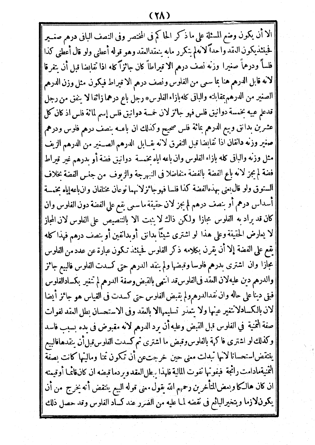 وَلَوْ قَالَ: أَعْطِنِي كَذَا فَلْسًا، وَدِرْهَمًا صَغِيرًا وَزْنُهُ نِصْفُ دِرْهَمٍ إلَّا قِيرَاطًا كَانَ جَائِزًا كُلُّهُ إذَا تَقَابَضَا قَبْلَ أَنْ يَتَفَرَّقَا؛ لِأَنَّهُ قَابَلَ الدِّرْهَمَ هُنَا بِمَا سَمَّى مِنْ الْفُلُوسِ، وَنِصْفِ دِرْهَمٍ إلَّا قِيرَاطًا فَيَكُونُ مِثْلَ وَزْنِ الدِّرْهَمِ الصَّغِيرِ مِنْ الدِّرْهَمِ بِمُقَابَلَتِهِ، وَالْبَاقِي كُلُّهُ بِإِزَاءِ الْفُلُوسِ.