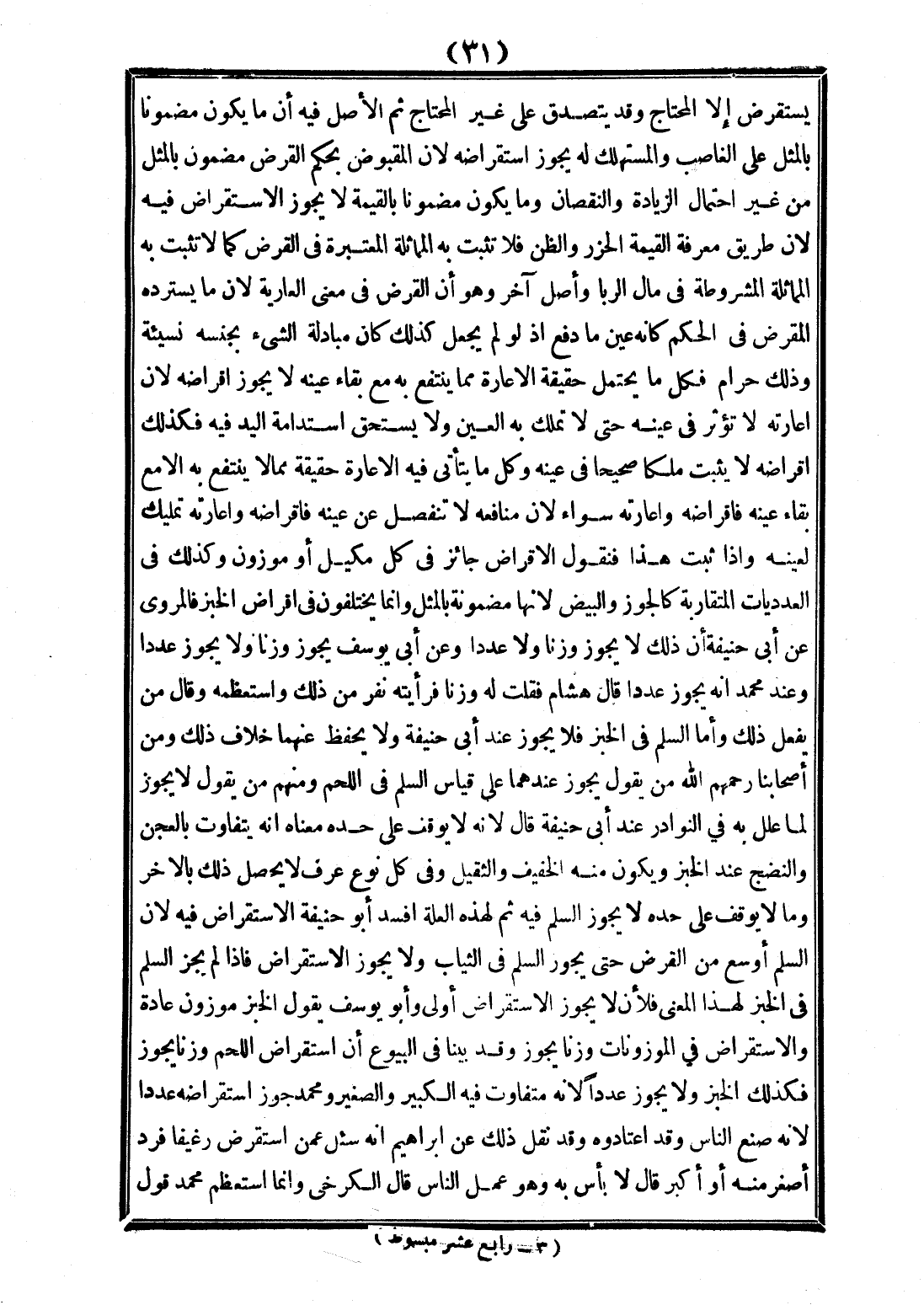 وَإِذَا ثَبَتَ هَذَا فَنَقُولُ: الْإِقْرَاضُ جَائِزٌ فِي كُلِّ مَكِيلٍ، أَوْ مَوْزُونٍ، وَكَذَلِكَ فِي الْعَدَدِيَّاتِ الْمُتَقَارِبَةِ كَالْجَوْزِ، وَالْبَيْضِ؛ لِأَنَّهَا مَضْمُونَةٌ بِالْمِثْلِ، وَإِنَّمَا يَخْتَلِفُونَ فِي إقْرَاضِ الْخُبْزِ فَالْمَرْوِيُّ عَنْ أَبِي حَنِيفَةَ: أَنَّ ذَلِكَ لَا يَجُوزُ وَزْنًا، وَلَا عَدَدًا، وَعَنْ أَبِي يُوسُفَ: يَجُوزُ وَزْنًا، وَلَا يَجُوزُ عَدَدًا، وَعِنْدَ مُحَمَّدٍ أَنَّهُ يَجُوزُ عَدَدًا قَالَ هِشَامُ: فَقُلْتُ لَهُ وَزْنًا فَرَأَيْتُهُ نَفَرَ مِنْ ذَلِكَ، وَاسْتَعْظَمَهُ، وَقَالَ مَنْ يَفْعَلُ ذَلِكَ؟ وَأَمَّا السَّلَمُ فِي الْخُبْزِ، فَلَا يَجُوزُ عِنْدَ أَبِي حَنِيفَةَ، وَلَا يُحْفَظُ عَنْهُمَا خِلَافُ ذَلِكَ، وَمِنْ أَصْحَابِنَا - رَحِمَهُمُ اللَّهُ - مَنْ يَقُولُ: يَجُوزُ عِنْدَهُمَا عَلَى قِيَاسَ السَّلَمِ فِي اللَّحْمِ، وَمِنْهُمْ مَنْ يَقُولُ: لَا يَجُوزُ لِمَا عَلَّلَ بِهِ فِي النَّوَادِرِ عِنْدَ أَبِي حَنِيفَةَ قَالَ: لِأَنَّهُ لَا يُوقَفُ عَلَى حَدِّهِ مَعْنَاهُ أَنَّهُ يَتَفَاوَتُ بِالْعَجْنِ وَالنُّضْجِ عِنْدَ الْخَبْزِ، وَيَكُونُ مِنْهُ الْخَفِيفُ، وَالثَّقِيلُ، وَفِي كُلِّ نَوْعٍ عُرْفٌ. لَا يَحْصُلُ ذَلِكَ بِالْآخَرِ، وَمَا لَا يُوقَفُ عَلَى حَدِّهِ لَا يَجُوزُ السَّلَمُ فِيهِ، ثُمَّ لِهَذِهِ الْعِلَّةِ أَفْسَدَ أَبُو حَنِيفَةَ الِاسْتِقْرَاضَ فِيهِ؛ لِأَنَّ السَّلَمَ أَوْسَعُ مِنْ الْقَرْضِ حَتَّى يَجُوزَ السَّلَمُ فِي الثِّيَابِ، وَلَا يَجُوزُ الِاسْتِقْرَاضُ فَإِذَا لَمْ يَجُزْ السَّلَمُ فِي الْخُبْزِ لِهَذَا الْمَعْنَى؛ فَلَأَنْ لَا يَجُوزَ الِاسْتِقْرَاضُ أَوْلَى وَأَبُو يُوسُفَ يَقُولُ: الْخُبْزُ مَوْزُونٌ عَادَةً، وَالِاسْتِقْرَاضُ فِي الْمَوْزُونَاتِ، وَزْنًا يَجُوزُ، وَقَدْ بَيَّنَّا فِي الْبُيُوعِ أَنَّ اسْتِقْرَاضَ اللَّحْمِ وَزْنًا يَجُوزُ فَكَذَلِكَ الْخُبْزُ، وَلَا يَجُوزُ عَدَدًا؛ لِأَنَّهُ مُتَفَاوِتٌ، فِيهِ الْكَبِيرُ، وَالصَّغِيرُ وَمُحَمَّدٌ جَوَّزَ اسْتِقْرَاضَهُ عَدَدًا؛ لِأَنَّهُ صُنْعُ النَّاسِ، وَقَدْ اعْتَادُوهُ، وَقَدْ نُقِلَ ذَلِكَ عَنْ إبْرَاهِيمَ أَنَّهُ سُئِلَ عَمَّنْ اسْتَقْرَضَ رَغِيفًا فَرَدَّ أَصْغَرَ مِنْهُ، أَوْ أَكْبَرَ قَالَ: لَا بَأْسَ بِهِ، وَهُوَ عَمَلُ النَّاسِ قَالَ الْكَرْخِيُّ: وَإِنَّمَا اسْتَعْظَمَ مُحَمَّدٌ قَوْلَ
