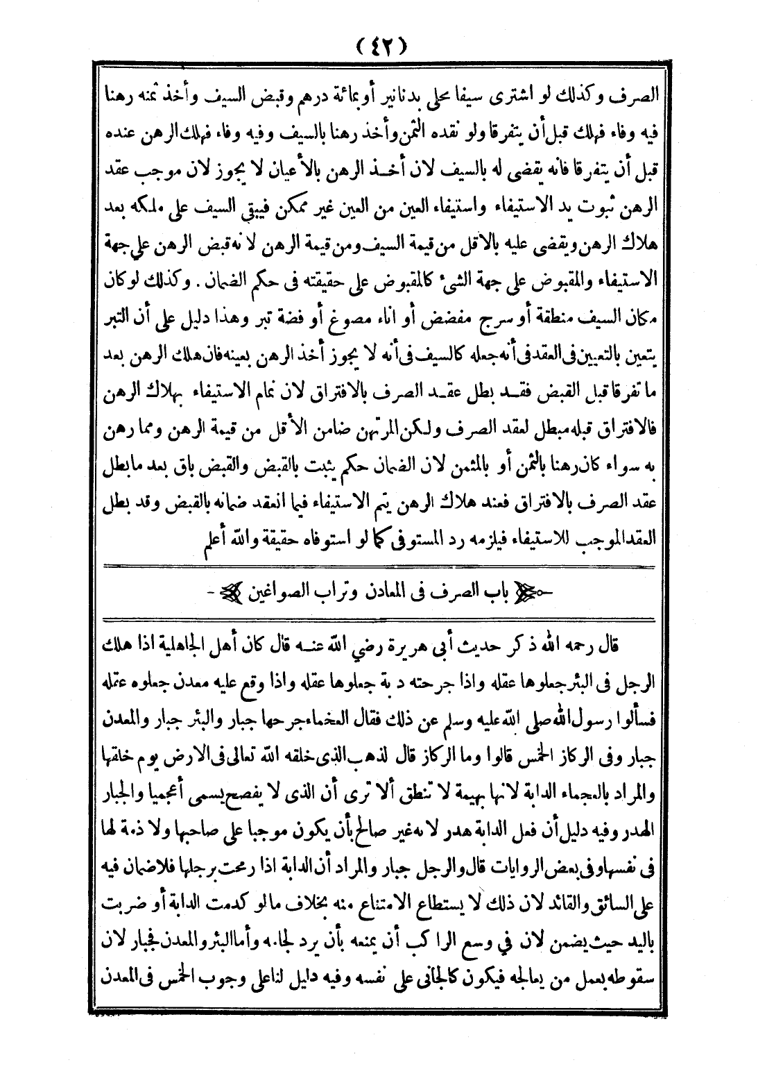 الصَّرْفِ كَذَلِكَ لَوْ اشْتَرَى سَيْفًا مُحَلَّى بِدَنَانِيرَ أَوْ بِمِائَةِ دِرْهَمٍ وَقَبَضَ السَّيْفَ وَأَخَذَ ثَمَنَهُ رَهْنًا، فِيهِ وَفَاءٌ فَهَلَكَ قَبْلَ أَنْ يَتَفَرَّقَا وَلَوْ نَقَدَهُ الثَّمَنَ وَأَخَذَ رَهْنًا بِالسَّيْفِ، وَفِيهِ وَفَاءٌ فَهَلَكَ الرَّهْنُ عِنْدَهُ قَبْلَ أَنْ يَتَفَرَّقَا؛ فَإِنَّهُ يُقْضَى لَهُ بِالسَّيْفِ؛ لِأَنَّ أَخْذَ الرَّهْنِ بِالْأَعْيَانِ لَا يَجُوزُ؛ لِأَنَّ مُوجِبَ عَقْدِ الرَّهْنِ ثُبُوتُ يَدِ الِاسْتِيفَاءِ، وَاسْتِيفَاءُ الْعَيْنِ مِنْ الْعَيْنِ غَيْرُ مُمْكِنٌ فَيَبْقَى السَّيْفُ عَلَى مِلْكِهِ بَعْدَ هَلَاكِ الرَّهْنِ وَيُقْضَى عَلَيْهِ بِالْأَقَلِّ مِنْ قِيمَةِ السَّيْفِ وَمِنْ قِيمَةِ الرَّهْنِ؛ لِأَنَّهُ قَبَضَ الرَّهْنَ عَلَى جِهَةِ الِاسْتِيفَاءِ، وَالْمَقْبُوضُ عَلَى جِهَةِ الشَّيْءِ كَالْمَقْبُوضِ عَلَى حَقِيقَتِهِ فِي حُكْمِ الضَّمَانِ، وَكَذَلِكَ لَوْ كَانَ مَكَانَ السَّيْفِ مِنْطَقَةٌ أَوْ سَرْجٌ مُفَضَّضٌ أَوْ إنَاءٌ مَصُوغٌ أَوْ فِضَّةُ تِبْرٍ، وَهَذَا دَلِيلٌ عَلَى أَنَّ التِّبْرَ يَتَعَيَّنُ بِالتَّعْيِينِ فِي الْعَقْدِ فِي أَنَّهُ جَعَلَهُ كَالسَّيْفِ فِي أَنَّهُ لَا يَجُوزُ أَخْذُ الرَّهْنِ بِعَيْنِهِ فَإِنْ هَلَكَ الرَّهْنُ بَعْدَ مَا تَفَرَّقَا قَبْلَ الْقَبْضِ فَقَدْ بَطَلَ عَقْدُ الصَّرْفِ بِالِافْتِرَاقِ؛ لِأَنَّ تَمَامَ الِاسْتِيفَاءِ بِهَلَاكِ الرَّهْنِ فَالِافْتِرَاقُ قَبْلَهُ مُبْطِلٌ لِعَقْدِ الصَّرْفِ وَلَكِنَّ الْمُرْتَهِنَ ضَامِنُ الْأَقَلِّ مِنْ قِيمَةِ الرَّهْنِ وَمِمَّا رَهَنَ بِهِ سَوَاءٌ كَانَ رَهْنًا بِالثَّمَنِ أَوْ بِالْمُثَمَّنِ؛ لِأَنَّ الضَّمَانَ حُكْمٌ يَثْبُتُ بِالْقَبْضِ، وَالْقَبْضُ بَاقٍ بَعْدَ مَا بَطَلَ عَقْدُ الصَّرْفِ بِالِافْتِرَاقِ فَعِنْدَ هَلَاكِ الرَّهْنِ يَتِمُّ الِاسْتِيفَاءُ فِيمَا انْعَقَدَ ضَمَانُهُ بِالْقَبْضِ، وَقَدْ بَطَلَ الْعَقْدُ الْمُوجِبُ لِلِاسْتِيفَاءِ فَيَلْزَمُهُ رَدُّ الْمُسْتَوْفَى كَمَا لَوْ اسْتَوْفَاهُ حَقِيقَةً، وَاَللَّهُ أَعْلَمُ.