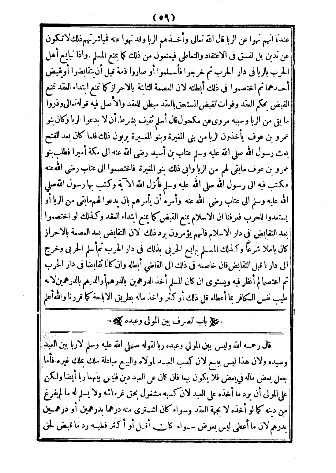 وَإِذَا تَبَايَعَ أَهْلُ الْحَرْبِ بِالرِّبَا فِي دَارِ الْحَرْبِ، ثُمَّ خَرَجُوا فَأَسْلَمُوا، أَوْ صَارُوا ذِمَّة، قَبْلَ أَنْ يَتَقَابَضُوا، أَوْ يَقْبِضَ أَحَدُهُمَا، ثُمَّ اخْتَصَمُوا فِي ذَلِكَ أَبْطَلْتُهُ، لِأَنَّ الْعِصْمَةَ الثَّابِتَةَ بِالْإِحْرَازِ كَمَا تَمْنَعُ ابْتِدَاءَ الْعَقْدِ، تَمْنَعُ الْقَبْضَ بِحُكْمِ الْعَقْدِ، وَفَوَاتُ الْقَبْضِ الْمُسْتَحَقِّ بِالْعَقْدِ مُبْطِلٌ لِلْعَقْدِ،، وَالْأَصْلُ فِيهِ قَوْله تَعَالَى {: وَذَرُوا مَا بَقِيَ مِنْ الرِّبَا} [البقرة: 278]، وَسَبَبُهُ مَرْوِيٌّ عَنْ مَكْحُولٍ قَالَ «أَسْلَمَ ثَقِيفُ بِشَرْطِ أَنْ لَا يَدَعُوا الرِّبَا، وَكَانَ بَنُو عَمْرِو بْنِ عَوْفٍ يَأْخُذُوا الرِّبَا مِنْ بَنِي الْمُغِيرَةِ، وَبَنُو الْمُغِيرَةِ يَرْبُونَ ذَلِكَ، فَلَمَّا كَانَ بَعْدَ الْفَتْحِ بَعَثَ رَسُولُ اللَّهِ - صَلَّى اللَّهُ عَلَيْهِ وَسَلَّمَ - عَتَّابُ بْنَ أَسِيدٍ - رَضِيَ اللَّهُ عَنْهُ - إلَى مَكَّةِ أَمِيرًا فَطَلَبَ بَنُو عَمْرِو بْنِ عَوْفٍ مَا بَقِيَ لَهُمْ مِنْ الرِّبَا، وَأَبَى ذَلِكَ بَنُو الْمُغِيرَةِ فَاخْتَصَمُوا إلَى عَتَّابٍ - رَضِيَ اللَّهُ عَنْهُ -، فَكَتَبَ فِيهِ إلَى رَسُولِ اللَّهِ - صَلَّى اللَّهُ عَلَيْهِ وَسَلَّمَ - فَأَنْزَلَ اللَّهُ الْآيَةَ، وَكَتَبَ بِهَا رَسُولُ اللَّهِ - صَلَّى اللَّهُ عَلَيْهِ وَسَلَّمَ - إلَى عَتَّابٍ - رَضِيَ اللَّهُ عَنْهُ -، وَأَمَرَهُ أَنْ يَأْمُرَهُمْ بِأَنْ يَدَعُوا لَهُمْ مَا بَقِيَ مِنْ الرِّبَا أَوْ يَسْتَعِدُّوا لِلْحَرْبِ» فَعَرَفْنَا أَنْ الْإِسْلَامَ يَمْنَعُ الْقَبْضَ، كَمَا يَمْنَعُ ابْتِدَاءَ الْعَقْدِ، وَكَذَلِكَ لَوْ اخْتَصَمُوا بَعْدَ التَّقَابُضِ فِي دَارِ الْإِسْلَامِ، فَإِنَّهُمْ يُؤْمَرُونَ بِرَدِّ ذَلِكَ؛ لِأَنَّ التَّقَابُضَ بَعْدَ الْعِصْمَةِ بِالْإِحْرَازِ كَانَ بَاطِلًا شَرْعًا، وَكَذَلِكَ الْمُسْلِمُ يُبَايِعُ الْحَرْبِيَّ بِذَلِكَ فِي دَارِ الْحَرْبِ، ثُمَّ أَسْلَمَ الْحَرْبِيُّ، وَخَرَجَ إلَى دَارِنَا قَبْلَ التَّقَابُضِ فَإِنْ خَاصَمَهُ فِي ذَلِكَ إلَى الْقَاضِي أَبْطَلَهُ، وَإِنْ كَانَا تَقَابَضَا فِي دَارِ الْحَرْبِ، ثُمَّ اخْتَصَمَا لَمْ أَنْظُرْ فِيهِ، وَيَسْتَوِي إنْ كَانَ الْمُسْلِمُ أَخَذَ الدِّرْهَمَيْنِ بِالدِّرْهَمِ، أَوْ الدِّرْهَمَ بِالدِّرْهَمَيْنِ؛ لِأَنَّهُ طَيَّبَ نَفْسَ الْكَافِرِ بِمَا أَعْطَاهُ، قَلَّ ذَلِكَ، أَوْ كَثُرَ، وَأَخَذَ مَالَهُ بِطَرِيقِ الْإِبَاحَةَ كَمَا قَرَّرَنَا، وَاَللَّهُ أَعْلَمُ.
