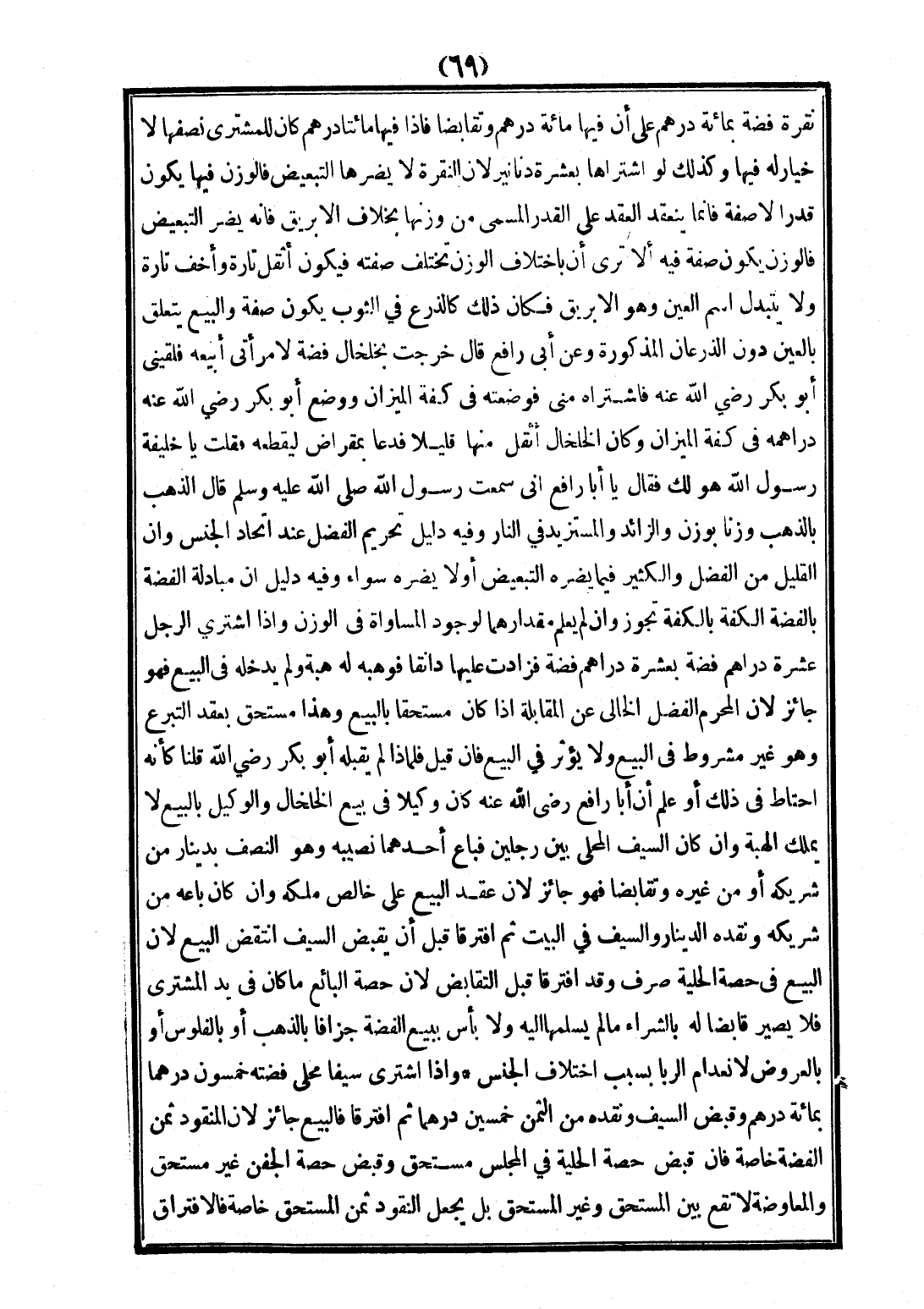 نُقْرَةَ فِضَّةٍ بِمِائَةِ دِرْهَمٍ عَلَى أَنَّ فِيهَا مِائَةَ دِرْهَمٍ، وَتَقَابَضَا، فَإِذَا فِيهَا مِائَتَا دِرْهَمٍ، كَانَ لِلْمُشْتَرِي نِصْفُهَا، لَا خِيَارَ لَهُ فِيهَا، وَكَذَلِكَ لَوْ اشْتَرَاهَا بِعَشَرَةِ دَنَانِيرَ؛ لِأَنَّ النُّقْرَة لَا يَضُرُّهَا التَّبْعِيضُ، فَالْوَزْنُ فِيهَا يَكُونُ قَدْرًا لَا صِفَةً، فَإِنَّمَا يَنْعَقِدُ الْعَقْدُ عَلَى الْقَدْرِ الْمُسَمَّى مِنْ وَزْنِهَا بِخِلَافِ الْإِبْرِيقِ، فَإِنَّهُ يَضُرُّ التَّبْعِيضَ فَالْوَزْنُ يَكُونُ صِفَةً فِيهِ، أَلَا تَرَى أَنْ بِاخْتِلَافِ الْوَزْنِ تَخْتَلِفُ صِفَتُهُ فَيَكُونُ أَثْقَلَ تَارَةً، وَأَخَفَّ تَارَةً، وَلَا يَتَبَدَّلُ اسْمُ الْعَيْنِ، وَهُوَ الْإِبْرِيقُ، فَكَانَ ذَلِكَ كَالذَّرْعِ فِي الثَّوْبِ، يَكُونُ صِفَةً، وَالْبَيْعُ يَتَعَلَّقُ بِالْعَيْنِ دُونَ الذُّرْعَانِ الْمَذْكُورَةِ،، وَعَنْ أَبِي رَافِعٍ قَالَ: خَرَجْتُ بِخَلْخَالِ فِضَّةٍ لِامْرَأَتِي أَبِيعُهُ فَلَقِيَنِي أَبُو بَكْرٍ - رَضِيَ اللَّهُ عَنْهُ -، فَاشْتَرَاهُ مِنِّي فَوَضَعْتَهُ فِي كِفَّةِ الْمِيزَانِ، وَوَضَعَ أَبُو بَكْرٍ - رَضِيَ اللَّهُ عَنْهُ - دَرَاهِمَهُ فِي كِفَّةِ الْمِيزَانِ، وَكَانَ الْخَلْخَالُ أَثْقَلَ مِنْهَا قَلِيلًا، فَدَعَا بِمِقْرَاضٍ لِيَقْطَعَهُ، فَقُلْت: يَا خَلِيفَةَ رَسُولِ اللَّهِ هُوَ لَكَ، فَقَالَ: يَا أَبَا رَافِعٍ، إنِّي سَمِعْتُ رَسُولَ اللَّهِ - صَلَّى اللَّهُ عَلَيْهِ وَسَلَّمَ - قَالَ: «الذَّهَبُ بِالذَّهَبِ، وَزْنًا بِوَزْنٍ، وَالزَّائِدُ، وَالْمُسْتَزِيدُ فِي النَّارِ»، وَفِيهِ دَلِيلُ تَحْرِيمِ الْفَضْلِ عِنْدَ اتِّحَادِ الْجِنْسِ، وَأَنَّ الْقَلِيلَ مِنْ الْفَضْلِ وَالْكَثِيرَ فِيمَا يَضُرُّهُ التَّبْعِيضُ، أَوْ لَا يَضُرُّهُ سَوَاءٌ،، وَفِيهِ دَلِيلُ أَنَّ مُبَادَلَةَ الْفِضَّةِ بِالْفِضَّةِ الْكِفَّةُ بِالْكِفَّةِ تَجُوزُ، وَإِنْ لَمْ يَعْلَمْ مِقْدَارُهُمَا؛ لِوُجُودِ الْمُسَاوَاةِ فِي الْوَزْنِ، وَإِذَا اشْتَرَى الرَّجُلُ عَشَرَةَ دَرَاهِمَ فِضَّةٍ بِعَشَرَةِ دَرَاهِمَ، فَزَادَتْ عَلَيْهَا دَانَقًا فَوَهَبَهُ لَهُ هِبَةً، وَلَمْ يُدْخِلْهُ فِي الْبَيْعِ، فَهُوَ جَائِزٌ؛ لِأَنَّ الْمُحَرَّمَ الْفَضْلُ الْخَالِي عَنْ الْمُقَابَلَةِ؛ إذَا كَانَ مُسْتَحَقًّا بِالْبَيْعِ، وَهَذَا مُسْتَحَقٌّ بِعَقْدِ التَّبَرُّعِ، وَهُوَ غَيْرُ مَشْرُوطٍ فِي الْبَيْعِ، وَلَا يُؤَثِّرُ فِي الْبَيْعِ، فَإِنْ قِيلَ: فَلِمَاذَا لَمْ يَقْبَلْهُ أَبُو بَكْرٍ - رَضِيَ اللَّهُ عَنْهُ -؟ قُلْنَا: كَأَنَّهُ احْتَاطَ فِي ذَلِكَ أَوْ عَلِمَ أَنْ أَبَا رَافِعٍ - رَضِيَ اللَّهُ عَنْهُ - كَانَ وَكِيلًا فِي بَيْعِ الْخَلْخَالِ، وَالْوَكِيلُ بِالْبَيْعِ لَا يَمْلِكُ الْهِبَةَ.