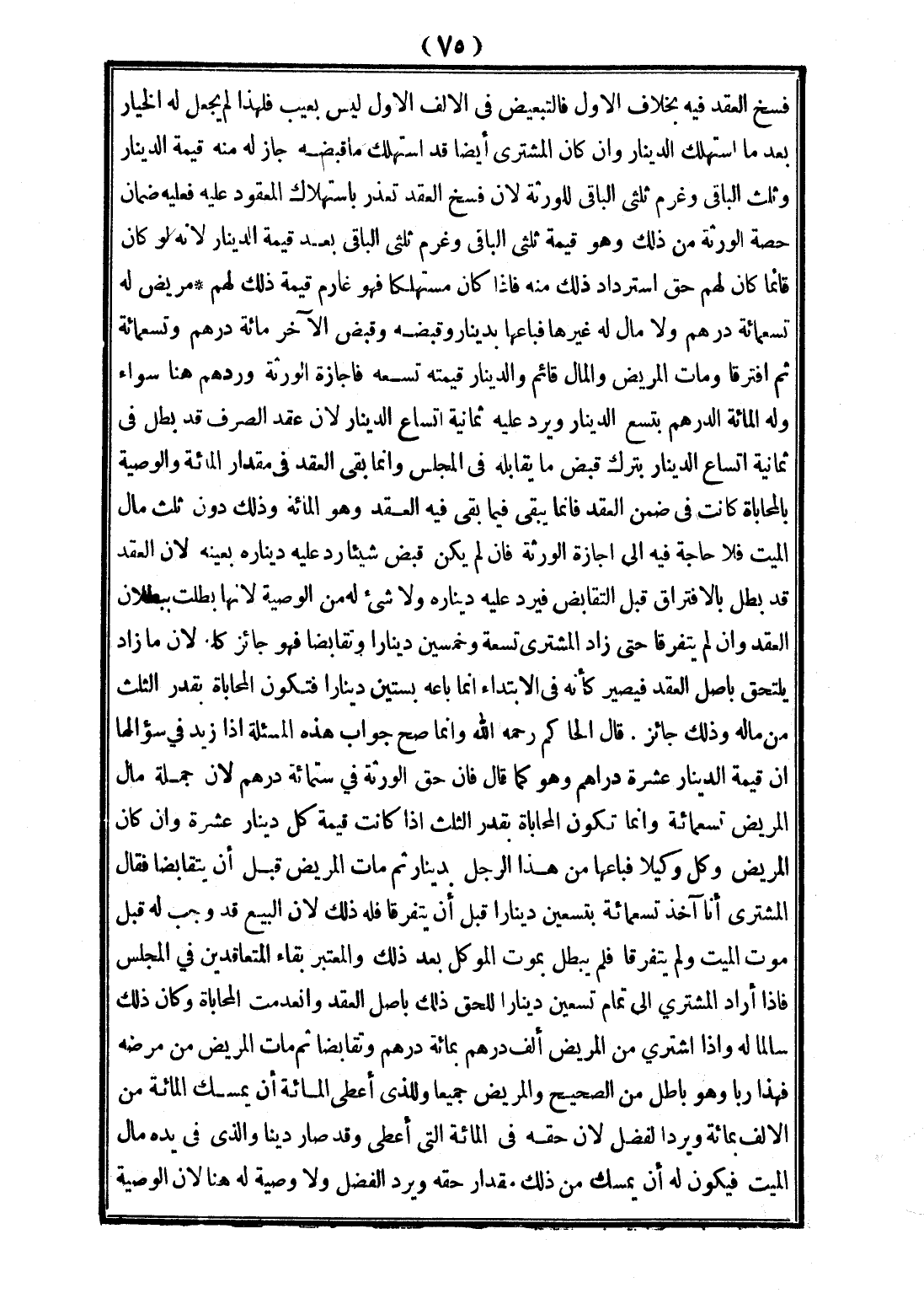 مَرِيضٌ لَهُ تِسْعُمِائَةِ دِرْهَمٍ، وَلَا مَالَ لَهُ غَيْرَهَا فَبَاعَهَا بِدِينَارٍ، وَقَبَضَهُ، وَقَبَضَ الْآخَرُ مِائَةَ دِرْهَمٍ، وَتِسْعَمِائَةِ، ثُمَّ افْتَرَقَا، وَمَاتَ الْمَرِيضُ، وَالْمَالُ قَائِمٌ، وَالدِّينَارُ قِيمَتِهِ تِسْعَةٌ فَإِجَازَةُ الْوَرَثَةِ وَرَدُّهُمْ هُنَا سَوَاءٌ، وَلَهُ الْمِائَةُ، الدِّرْهَمُ بِتُسْعِ الدِّينَارِ، وَيَرُدُّ عَلَيْهِ ثَمَانِيَةَ أَتْسَاعِ الدِّينَارِ؛ لِأَنَّ عَقْدَ الصَّرْفِ قَدْ بَطَلَ فِي ثَمَانِيَةِ أَتْسَاعِ الدِّينَارِ بِتَرْكِ قَبْضِ مَا يُقَابِلُهُ فِي الْمَجْلِسِ، وَإِنَّمَا بَقِيَ الْعَقْدُ فِي مِقْدَارِ الْمِائَةِ، وَالْوَصِيَّةُ بِالْمُحَابَاةِ كَانَتْ فِي ضِمْنِ الْعَقْدِ، فَإِنَّمَا يَبْقَى فِيمَا بَقِيَ فِيهِ الْعَقْدُ، وَهُوَ الْمِائَةُ، وَذَلِكَ دُونَ ثُلُثِ مَالِ الْمَيِّتِ، فَلَا حَاجَةَ فِيهِ إلَى إجَازَةَ الْوَرَثَةِ، فَإِنْ لَمْ يَكُنْ قَبَضَ شَيْئًا؛ رَدَّ عَلَيْهِ دِينَارَهُ بِعَيْنِهِ؛ لِأَنَّ الْعَقْدَ قَدْ بَطَلَ بِالِافْتِرَاقِ قَبْلَ التَّقَابُضِ، فَيَرُدُّ عَلَيْهِ دِينَارَهُ، وَلَا شَيْءَ لَهُ مِنْ الْوَصِيَّةِ؛ لِأَنَّهَا بَطَلَتْ بِبُطْلَانِ الْعَقْدِ، وَإِنْ لَمْ يَتَفَرَّقَا حَتَّى زَادَ الْمُشْتَرِي تِسْعَةَ وَخَمْسِينَ دِينَارًا، وَتَقَابَضَا فَهُوَ جَائِزٌ كُلُّهُ؛ لِأَنَّ مَا زَادَ يَلْتَحِقُ بِأَصْلِ الْعَقْدِ، فَيَصِيرُ كَأَنَّهُ فِي الِابْتِدَاءِ إنَّمَا بَاعَهُ بِسِتِّينَ دِينَارًا فَتَكُونُ الْمُحَابَاةُ بِقَدْرِ الثُّلُثِ مِنْ مَالِهِ، وَذَلِكَ جَائِزٌ.