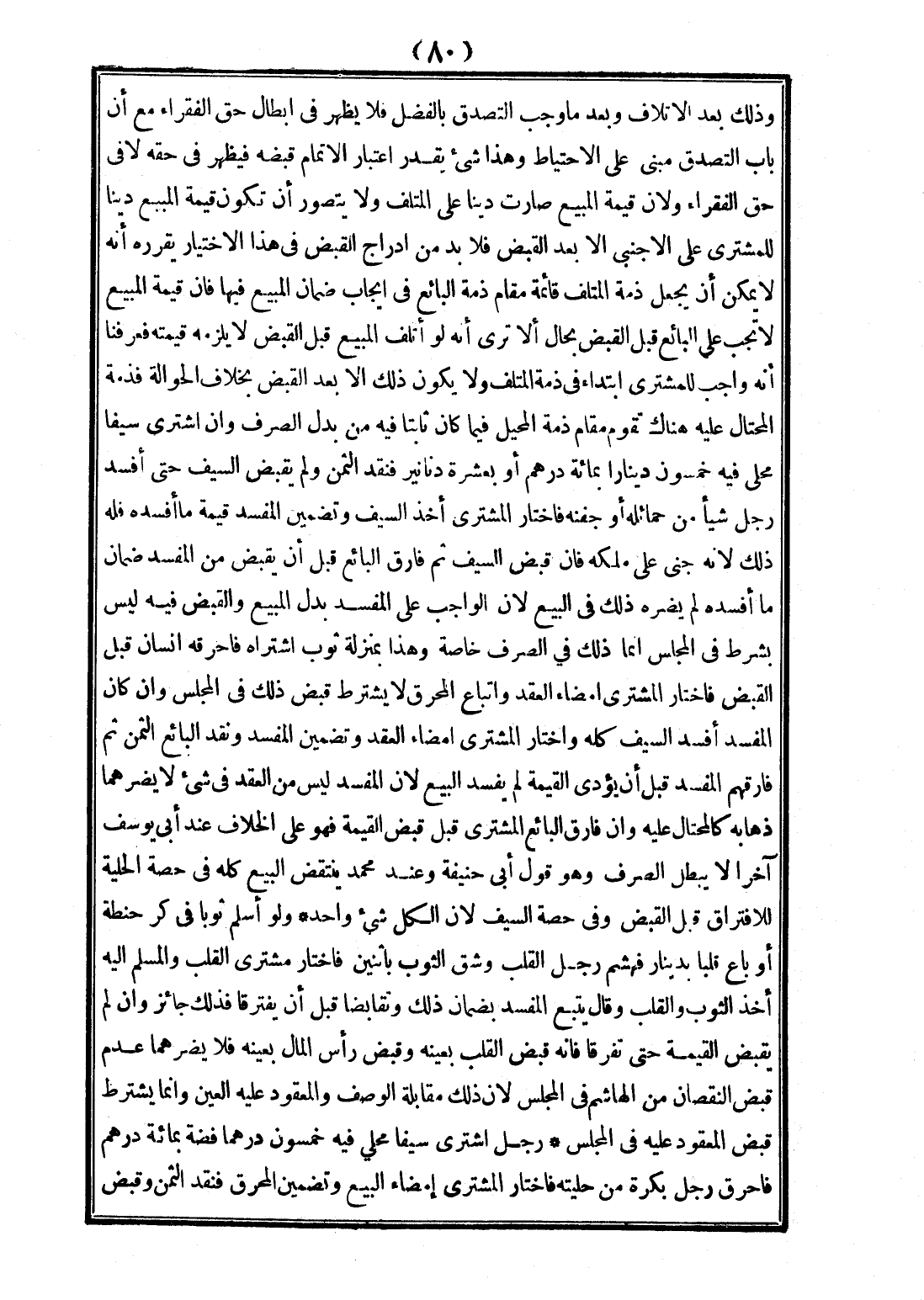 وَذَلِكَ بَعْدَ الْإِتْلَافِ، وَبَعْدَ مَا وَجَبَ التَّصَدُّقُ بِالْفَضْلِ، فَلَا يَظْهَرُ فِي إبْطَالِ حَقِّ الْفُقَرَاءِ مَعَ أَنَّ بَابَ التَّصَدُّقِ مَبْنِيٌّ عَلَى الِاحْتِيَاطِ، وَهَذَا شَيْءٌ يُقَدَّرُ اعْتِبَارًا لِإِتْمَامِ قَبْضِهِ، فَيَظْهَرُ فِي حَقِّهِ لَا فِي حَقِّ الْفُقَرَاءِ؛ وَلِأَنَّ قِيمَةَ الْمَبِيعِ صَارَتْ دَيْنًا عَلَى الْمُتْلِفِ، وَلَا يُتَصَوَّرُ أَنْ تَكُونَ قِيمَةُ الْمَبِيعِ دَيْنًا لِلْمُشْتَرِي عَلَى الْأَجْنَبِيِّ إلَّا بَعْدَ الْقَبْضِ، فَلَا بُدَّ مِنْ إدْرَاجِ الْقَبْضِ فِي هَذَا الِاخْتِيَارِ، يُقَرِّرُهُ أَنَّهُ لَا يُمْكِنُ أَنْ يَجْعَلَ ذِمَّةَ الْمُتْلِفِ قَائِمَةً مَقَامَ ذِمَّةِ الْبَائِعِ فِي إيجَابِ ضَمَانِ الْمَبِيعِ فِيهَا، فَإِنَّ قِيمَةَ الْمَبِيعِ لَا تَجِبُ عَلَى الْبَائِعِ قَبْلَ الْقَبْضِ بِحَالٍ، أَلَا تَرَى أَنَّهُ لَوْ أَتْلَفَ الْمَبِيعَ قَبْلَ الْقَبْضِ لَا يَلْزَمُهُ قِيمَتُهُ، فَعَرَفْنَا أَنَّهُ وَاجِبٌ لِلْمُشْتَرِي ابْتِدَاءً فِي ذِمَّةِ الْمُتْلِفِ، وَلَا يَكُونُ ذَلِكَ إلَّا بَعْدَ الْقَبْضِ بِخِلَافِ الْحَوَالَةِ، فَذِمَّةُ الْمُحْتَالِ عَلَيْهِ هُنَاكَ تَقُومُ مَقَامَ ذِمَّةِ الْمُحِيلِ فِيمَا كَانَ ثَابِتًا فِيهِ مِنْ بَدَلِ الصَّرْفِ.