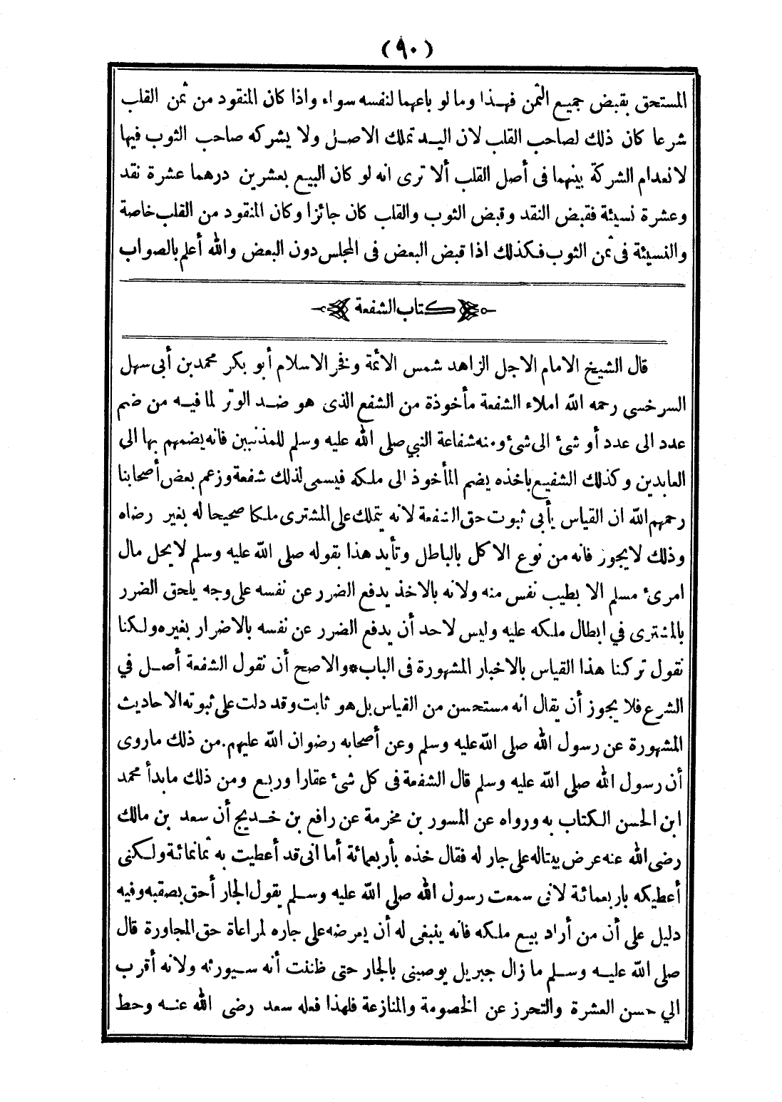 قَالَ الشَّيْخُ الْإِمَامُ الْأَجَلُّ الزَّاهِدُ شَمْسُ الْأَئِمَّةِ وَفَخْرُ الْإِسْلَامِ أَبُو بَكْرٍ مُحَمَّدُ بْنُ أَبِي سَهْلٍ السَّرَخْسِيُّ - رَحِمَهُ اللَّهُ - إمْلَاءً: الشُّفْعَةُ مَأْخُوذَةٌ مِنْ الشَّفْعِ الَّذِي هُوَ ضِدُّ الْوَتْرِ؛ لِمَا فِيهِ مِنْ ضَمِّ عَدَدٍ إلَى عَدَدٍ، أَوْ شَيْءٍ إلَى شَيْءٍ وَمِنْهُ شَفَاعَةُ النَّبِيِّ - صَلَّى اللَّهُ عَلَيْهِ وَسَلَّمَ - لِلْمُذْنِبِينَ فَإِنَّهُ يَضُمُّهُمْ بِهَا إلَى الْعَابِدِينَ، وَكَذَلِكَ الشَّفِيعُ بِأَخْذِهِ يَضُمُّ الْمَأْخُوذَ إلَى مِلْكِهِ، فَيُسَمَّى لِذَلِكَ شُفْعَةً، وَزَعَمَ بَعْضُ أَصْحَابِنَا - رَحِمَهُمُ اللَّهُ - أَنَّ الْقِيَاسَ يَأْبَى ثُبُوتَ حَقِّ الشُّفْعَةِ؛ لِأَنَّهُ يُتَمَلَّكُ عَلَى الْمُشْتَرِي مِلْكًا صَحِيحًا لَهُ بِغَيْرِ رِضَاهُ، وَذَلِكَ لَا يَجُوزُ فَإِنَّهُ مِنْ نَوْعِ الْأَكْلِ بِالْبَاطِلِ وَتَأَيَّدَ هَذَا بِقَوْلِهِ: - صَلَّى اللَّهُ عَلَيْهِ وَسَلَّمَ - «لَا يَحِلُّ مَالُ امْرِئٍ مُسْلِمٍ، إلَّا بِطِيبِ نَفْسٍ مِنْهُ»؛ وَلِأَنَّهُ بِالْأَخْذِ يَدْفَعُ الضَّرَرَ عَنْ نَفْسِهِ عَلَى وَجْهٍ يُلْحِقُ الضَّرَرَ بِالْمُشْتَرِي فِي إبْطَالِ مِلْكِهِ عَلَيْهِ، وَلَيْسَ لِأَحَدٍ أَنْ يَدْفَعَ الضَّرَرَ عَنْ نَفْسِهِ بِالْإِضْرَارِ بِغَيْرِهِ وَلَكِنَّا نَقُولُ تَرَكْنَا هَذَا الْقِيَاسَ بِالْأَخْبَارِ الْمَشْهُورَةِ فِي الْبَابِ، وَالْأَصَحُّ أَنْ نَقُولَ الشُّفْعَةُ أَصْلٌ فِي الشَّرْعِ، فَلَا يَجُوزُ أَنْ يُقَالَ: إنَّهُ مُسْتَحْسَنٌ مِنْ الْقِيَاسِ، بَلْ هُوَ ثَابِتٌ، وَقَدْ دَلَّتْ عَلَى ثُبُوتِهِ الْأَحَادِيثُ الْمَشْهُورَةُ عَنْ رَسُولِ اللَّهِ - صَلَّى اللَّهُ عَلَيْهِ وَسَلَّمَ - وَعَنْ أَصْحَابِهِ - رِضْوَانُ اللَّهِ عَلَيْهِمْ -. مِنْ ذَلِكَ مَا رُوِيَ أَنَّ رَسُولَ اللَّهِ - صَلَّى اللَّهُ عَلَيْهِ وَسَلَّمَ - قَالَ: «الشُّفْعَةُ فِي كُلِّ شَيْءٍ عَقَارًا وَرُبْعًا»، وَمِنْ ذَلِكَ مَا بَدَأَ مُحَمَّدُ بْنُ الْحَسَنِ الْكِتَابَ بِهِ وَرَوَاهُ عَنْ الْمِسْوَرِ بْنِ مَخْرَمَةَ عَنْ رَافِعِ بْنِ خَدِيجٍ أَنَّ سَعْدَ بْنَ مَالِكٍ - رَضِيَ اللَّهُ عَنْهُ - عَرَضَ بَيْتًا لَهُ عَلَى جَارٍ لَهُ، فَقَالَ خُذْهُ بِأَرْبَعِمِائَةٍ، أَمَا إنِّي قَدْ أُعْطِيت بِهِ ثَمَانَمِائَةٍ، وَلَكِنِّي أُعْطِيكَهُ بِأَرْبَعِمِائَةٍ لِأَنِّي سَمِعْت رَسُولَ اللَّهِ - صَلَّى اللَّهُ عَلَيْهِ وَسَلَّمَ - يَقُولُ: «الْجَارُ أَحَقُّ بِصَقْبِهِ»، وَفِيهِ دَلِيلٌ عَلَى أَنَّ مَنْ أَرَادَ بَيْعَ مِلْكِهِ فَإِنَّهُ يَنْبَغِي لَهُ أَنْ يَعْرِضَهُ عَلَى جَارِهِ لِمُرَاعَاةِ حَقِّ الْمُجَاوَرَةِ قَالَ: - صَلَّى اللَّهُ عَلَيْهِ وَسَلَّمَ - «مَا زَالَ جِبْرِيلُ يُوصِينِي بِالْجَارِ حَتَّى ظَنَنْت أَنَّهُ سَيُوَرِّثُهُ»؛ وَلِأَنَّهُ أَقْرَبُ إلَى حُسْنِ الْعِشْرَةِ، وَالتَّحَرُّزِ عَنْ الْخُصُومَةِ، وَالْمُنَازَعَةِ؛ فَلِهَذَا فَعَلَهُ سَعْدٌ - رَضِيَ اللَّهُ عَنْهُ - وَحَطَّ