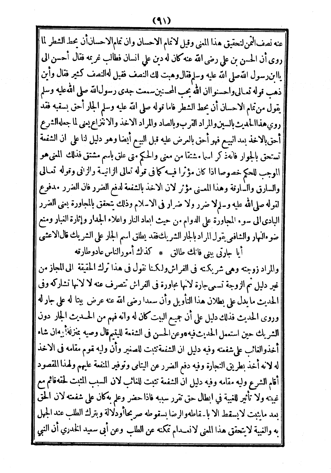 عَنْهُ نِصْفَ الثَّمَنِ لِتَحْقِيقِ هَذَا الْمَعْنَى وَقِيلَ لِإِتْمَامِ الْإِحْسَانِ، وَإِنَّ تَمَامَ الْإِحْسَانِ أَنْ يَحُطَّ الشَّطْرَ؛ لِمَا رُوِيَ أَنَّ الْحَسَنَ بْنَ عَلِيٍّ - رَضِيَ اللَّهُ عَنْهُ - كَانَ لَهُ دَيْنٌ عَلَى إنْسَانٍ فَطَالَبَ غَرِيمَهُ، فَقَالَ: أَحْسِنْ إلَيَّ يَا ابْنَ رَسُولِ اللَّهِ - صَلَّى اللَّهُ عَلَيْهِ وَسَلَّمَ -، فَقَالَ: وَهَبْت لَك النِّصْفَ فَقِيلَ لَهُ: النِّصْفُ كَثِيرٌ، فَقَالَ: وَأَيْنَ ذَهَبَ قَوْله تَعَالَى {وَأَحْسِنُوا إنَّ اللَّهَ يُحِبُّ الْمُحْسِنِينَ} [البقرة: 195] سَمِعْت جَدِّي رَسُولَ اللَّهِ - صَلَّى اللَّهُ عَلَيْهِ وَسَلَّمَ - يَقُولُ: «مِنْ تَمَامِ الْإِحْسَانِ أَنْ يُحَطَّ الشَّطْرُ». فَأَمَّا قَوْلُهُ: - صَلَّى اللَّهُ عَلَيْهِ وَسَلَّمَ - «الْجَارُ أَحَقُّ بِسَقَبِهِ»، فَقَدْ رُوِيَ هَذَا الْحَدِيثُ بِالسِّينِ، وَالْمُرَادُ الْقُرْبُ، وَبِالصَّادِ، وَالْمُرَادُ الْأَخْذُ، وَالِانْتِزَاعُ، يَعْنِي: لَمَّا جَعَلَهُ الشَّرْعُ أَحَقَّ بِالْأَخْذِ بَعْدَ الْبَيْعِ، فَهُوَ أَحَقُّ بِالْعَرْضِ عَلَيْهِ قَبْلَ الْبَيْعِ أَيْضًا، وَهُوَ دَلِيلٌ لَنَا عَلَى أَنَّ الشُّفْعَةَ تُسْتَحَقُّ بِالْجِوَارِ، فَإِنَّهُ ذَكَرَ اسْمًا مُشْتَقًّا مِنْ مَعْنًى، وَالْحُكْمُ مَتَى عُلِّقَ بِاسْمٍ مُشْتَقٍّ، فَذَلِكَ الْمَعْنَى هُوَ الْمُوجِبُ لِلْحُكْمِ خُصُوصًا إذَا كَانَ مُؤَثِّرًا فِيهِ كَمَا فِي قَوْله تَعَالَى {الزَّانِيَةُ وَالزَّانِي} [النور: 2]، وقَوْله تَعَالَى {وَالسَّارِقُ وَالسَّارِقَةُ} [المائدة: 38] وَهَذَا الْمَعْنَى مُؤَثِّرٌ؛ لِأَنَّ الْأَخْذَ بِالشُّفْعَةِ لِدَفْعِ الضَّرَرِ، فَإِنَّ الضَّرَرَ مَدْفُوعٌ؛ لِقَوْلِهِ - صَلَّى اللَّهُ عَلَيْهِ وَسَلَّمَ - «لَا ضَرَرَ وَلَا ضِرَارَ» فِي الْإِسْلَامِ، وَذَلِكَ يَتَحَقَّقُ بِالْمُجَاوَرَةِ، يَعْنِي: الضَّرَرَ الْبَادِيَ إلَى سُوءِ الْمُجَاوَرَةِ عَلَى الدَّوَامِ مِنْ حَيْثُ إبْعَادِ النَّارِ وَإِعْلَاءِ الْجِدَارِ وَإِثَارَةِ الْغُبَارِ وَمَنْعِ ضَوْءِ النَّهَارِ وَالشَّافِعِيُّ يَقُولُ: الْمُرَادُ بِالْجَارِ الشَّرِيكُ، فَقَدْ يُطْلَقُ اسْمُ الْجَارِ عَلَى الشَّرِيكِ قَالَ الْأَعْشَى