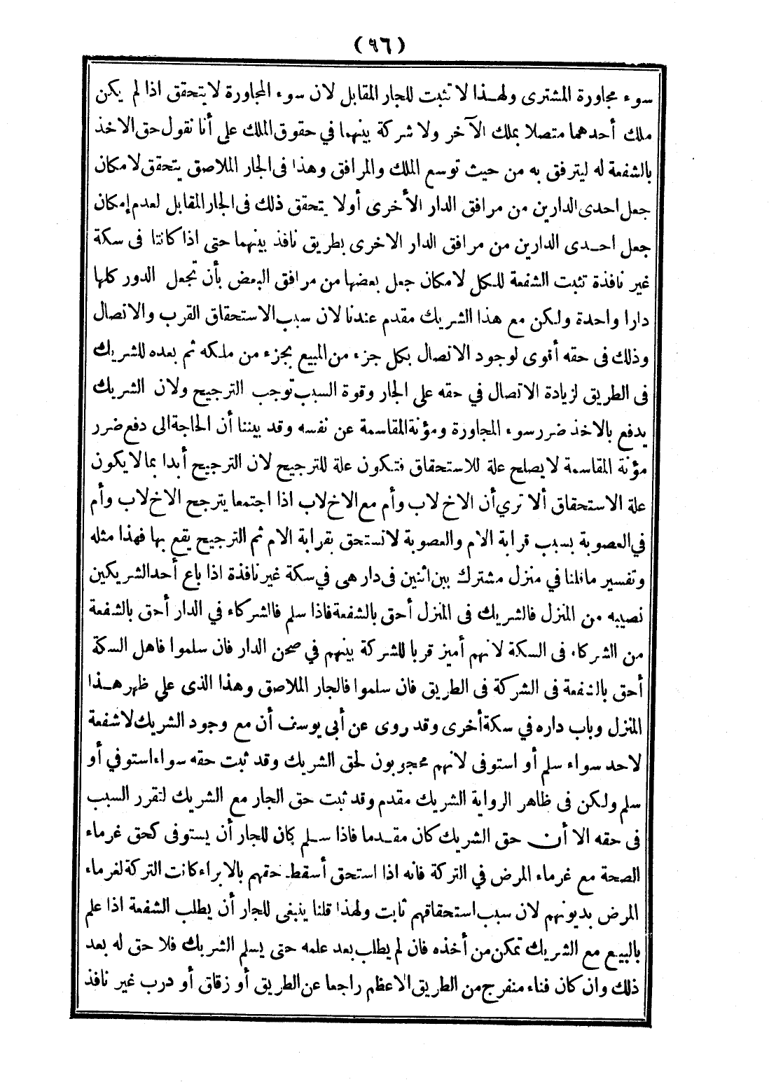 وَقَدْ بَيَّنَّا أَنَّ الْحَاجَةَ إلَى دَفْعِ ضَرَرِ مُؤْنَةِ الْمُقَاسَمَةِ لَا يَصْلُحُ عِلَّةً لِلِاسْتِحْقَاقِ فَتَكُونُ عِلَّةً لِلتَّرْجِيحِ؛ لِأَنَّ التَّرْجِيحَ أَبَدًا بِمَا لَا يَكُونُ عِلَّةً الِاسْتِحْقَاقِ أَلَا تَرَى أَنَّ الْأَخَ لِأَبٍ وَأُمٍّ مَعَ الْأَخِ لِأَبٍ إذَا اجْتَمَعَا يَتَرَجَّحُ الْأَخُ لِأَبٍ وَأُمٍّ فِي الْعُصُوبَةِ بِسَبَبِ قَرَابَةِ الْأُمِّ، وَالْعُصُوبَةُ لَا تُسْتَحَقُّ بِقَرَابَةِ الْأُمِّ، ثُمَّ التَّرْجِيحُ يَقَعُ بِهَا فَهَذَا مِثْلُهُ وَتَفْسِيرُ مَا قُلْنَا فِي مَنْزِلٍ مُشْتَرَكٍ بَيْنَ اثْنَيْنِ فِي دَارٍ هِيَ فِي سِكَّةٍ غَيْرِ نَافِذَةٍ إذَا بَاعَ أَحَدُ الشَّرِيكَيْنِ نَصِيبَهُ مِنْ الْمَنْزِلِ، فَالشَّرِيكُ فِي الْمَنْزِلِ أَحَقُّ بِالشُّفْعَةِ، فَإِذَا سَلَّمَ، فَالشُّرَكَاءُ فِي الدَّارِ أَحَقُّ بِالشُّفْعَةِ مِنْ الشُّرَكَاءِ فِي السِّكَّةِ؛ لِأَنَّهُمْ أَمْيَزُ قُرْبًا لِلشَّرِكَةِ بَيْنَهُمْ فِي صَحْنِ الدَّارِ، فَإِنْ سَلَّمُوا فَأَهْلُ السِّكَّةِ أَحَقُّ بِالشُّفْعَةِ فِي الشَّرِكَةِ فِي الطَّرِيقِ، فَإِنْ سَلَّمُوا، فَالْجَارُ الْمُلَاصِقُ، وَهَذَا الَّذِي عَلَى ظَهْرِ هَذَا الْمَنْزِلِ وَبَابُ دَارِهِ فِي سِكَّةٍ أُخْرَى، وَقَدْ رُوِيَ عَنْ أَبِي يُوسُفَ أَنَّ مَعَ وُجُودِ الشَّرِيكِ لَا شُفْعَةَ لِأَحَدٍ سَوَاءٌ سَلَّمَ أَوْ اسْتَوْفَى؛ لِأَنَّهُمْ مَحْجُوبُونَ لِحَقِّ الشَّرِيكِ، وَقَدْ ثَبَتَ حَقُّهُ سَوَاءٌ اسْتَوْفَى، أَوْ سَلَّمَ، وَلَكِنْ فِي ظَاهِرِ الرِّوَايَةِ الشَّرِيكُ مُقَدَّمٌ، وَقَدْ ثَبَتَ حَقُّ الْجَارِ مَعَ الشَّرِيكِ لِتَقَرُّرِ السَّبَبِ فِي حَقِّهِ، إلَّا أَنَّ حَقَّ الشَّرِيكِ كَانَ مُقَدَّمًا، فَإِذَا سَلَّمَ كَانَ لِلْجَارِ أَنْ يَسْتَوْفِيَ كَحَقِّ غُرَمَاءِ الصِّحَّةِ مَعَ غُرَمَاءِ الْمَرَضِ فِي التَّرِكَةِ، فَإِنَّهُ إذَا اسْتَحَقَّ أَسْقَطَ حَقَّهُمْ بِالْإِبْرَاءِ كَانَتْ التَّرِكَةُ لِغُرَمَاءِ الْمَرَضِ بِدُيُونِهِمْ؛ لِأَنَّ سَبَبَ اسْتِحْقَاقِهِمْ ثَابِتٌ؛ وَلِهَذَا قُلْنَا يَنْبَغِي لِلْجَارِ أَنْ يَطْلُبَ الشُّفْعَةَ إذَا عَلِمَ بِالْبَيْعِ مَعَ الشَّرِيكِ تَمَكَّنَ مِنْ أَخْذِهِ، فَإِنْ لَمْ يَطْلُبْ بَعْدَ عِلْمِهِ حَتَّى يُسَلِّمَ الشَّرِيكُ، فَلَا حَقَّ لَهُ بَعْدَ ذَلِكَ، وَإِنْ كَانَ فِنَاءٌ مُنْفَرِجٌ مِنْ الطَّرِيقِ الْأَعْظَمِ رَاجِعًا عَنْ الطَّرِيقِ، أَوْ زُقَاقٌ، أَوْ دَرْبٌ غَيْرُ نَافِذٍ