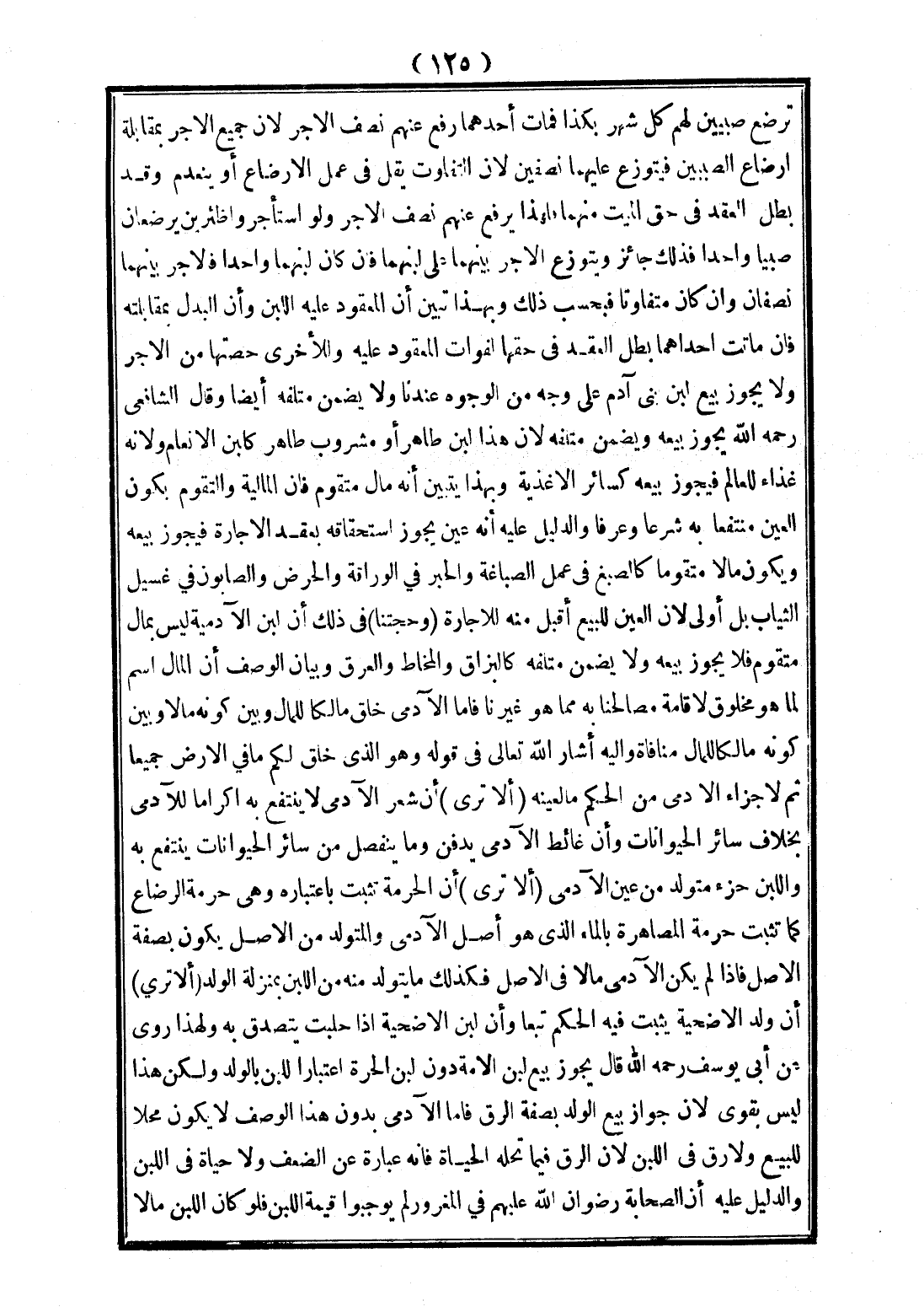 (أَلَا تَرَى) أَنَّ الْحُرْمَةَ تَثْبُتُ بِاعْتِبَارِهِ وَهِيَ حُرْمَةُ الرَّضَاعِ كَمَا تَثْبُتُ حُرْمَةُ الْمُصَاهَرَةِ بِالْمَاءِ الَّذِي هُوَ أَصْلُ الْآدَمِيِّ وَالْمُتَوَلِّدُ مِنْ الْأَصْلِ يَكُونُ بِصِفَةِ الْأَصْلِ فَإِذَا لَمْ يَكُنْ الْآدَمِيُّ مَالًا فِي الْأَصْلِ، فَكَذَلِكَ مَا يَتَوَلَّدُ مِنْهُ مِنْ اللَّبَنِ بِمَنْزِلَةِ الْوَلَدِ.