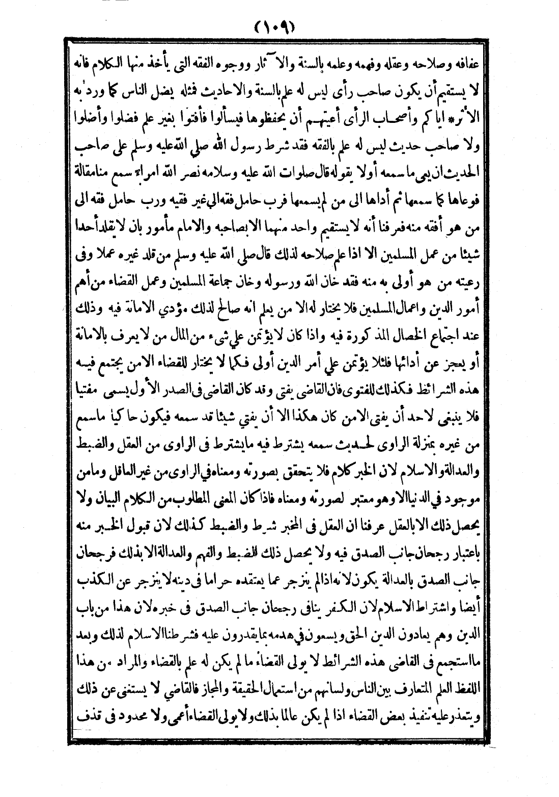 عَفَافِهِ وَصَلَاحِهِ وَعَقْلِهِ وَفَهْمِهِ وَعِلْمِهِ بِالسُّنَّةِ وَالْآثَارِ وَوُجُوهِ الْفِقْهِ الَّتِي يَأْخُذُ مِنْهَا الْكَلَامَ فَإِنَّهُ لَا يَسْتَقِيمُ أَنْ يَكُونَ صَاحِبَ رَأْيٍ لَيْسَ لَهُ عِلْمٌ بِالسُّنَّةِ وَالْأَحَادِيثِ فَمِثْلُهُ يَضِلُّ النَّاسَ كَمَا وَرَدَ بِهِ الْأَثَرُ إيَّاكُمْ وَأَصْحَابَ الرَّأْيِ أَعْيَتْهُمْ أَنْ يَحْفَظُوهَا فَيُسْأَلُوا فَأَفْتَوْا بِغَيْرِ عِلْمٍ فَضَلُّوا وَأَضَلُّوا وَلَا صَاحِبَ حَدِيثٍ لَيْسَ لَهُ عِلْمٌ بِالْفِقْهِ فَقَدْ شَرَطَ رَسُولُ اللَّهِ - صَلَّى اللَّهُ عَلَيْهِ وَسَلَّمَ - عَلَى صَاحِبِ الْحَدِيثِ أَنْ يَعِيَ مَا سَمِعَهُ، أَوْ لَا يَقُولَهُ قَالَ صَلَوَاتُ اللَّهِ عَلَيْهِ وَسَلَامُهُ «نَضَّرَ اللَّهُ امْرَأً سَمِعَ مِنَّا مَقَالَةً فَوَعَاهَا كَمَا سَمِعَهَا، ثُمَّ أَدَّاهَا إلَى مَنْ لَمْ يَسْمَعْهَا فَرُبَّ حَامِلِ فِقْهٍ إلَى غَيْرِ فَقِيهٍ وَرَبُّ حَامِلِ فِقْهٍ إلَى مَنْ هُوَ أَفْقَهُ مِنْهُ» فَعَرَفْنَا أَنَّهُ لَا يَسْتَقِيمُ وَاحِدٌ مِنْهُمَا إلَّا بِصَاحِبِهِ وَالْإِمَامُ مَأْمُورٌ بِأَنْ لَا يُقَلِّدَ أَحَدًا شَيْئًا مِنْ عَمَلِ الْمُسْلِمِينَ إلَّا إذَا عَلِمَ صَلَاحَهُ لِذَلِكَ قَالَ - صَلَّى اللَّهُ عَلَيْهِ وَسَلَّمَ - «مَنْ قَلَّدَ غَيْرَهُ عَمَلًا، وَفِي رَعِيَّتِهِ مَنْ هُوَ أَوْلَى بِهِ مِنْهُ فَقَدْ خَانَ اللَّهَ وَرَسُولَهُ وَخَانَ جَمَاعَةَ الْمُسْلِمِينَ» وَعَمَلُ الْقَضَاءِ مِنْ أَهَمِّ أُمُورِ الدِّينِ وَأَعْمَالِ الْمُسْلِمِينَ فَلَا يُخْتَارُ لَهُ إلَّا مَنْ يُعْلَمُ أَنَّهُ صَالِحٌ لِذَلِكَ مُؤَدِّي الْأَمَانَةَ فِيهِ، وَذَلِكَ عِنْدَ اجْتِمَاعِ الْخِصَالِ الْمَذْكُورَةِ فِيهِ.