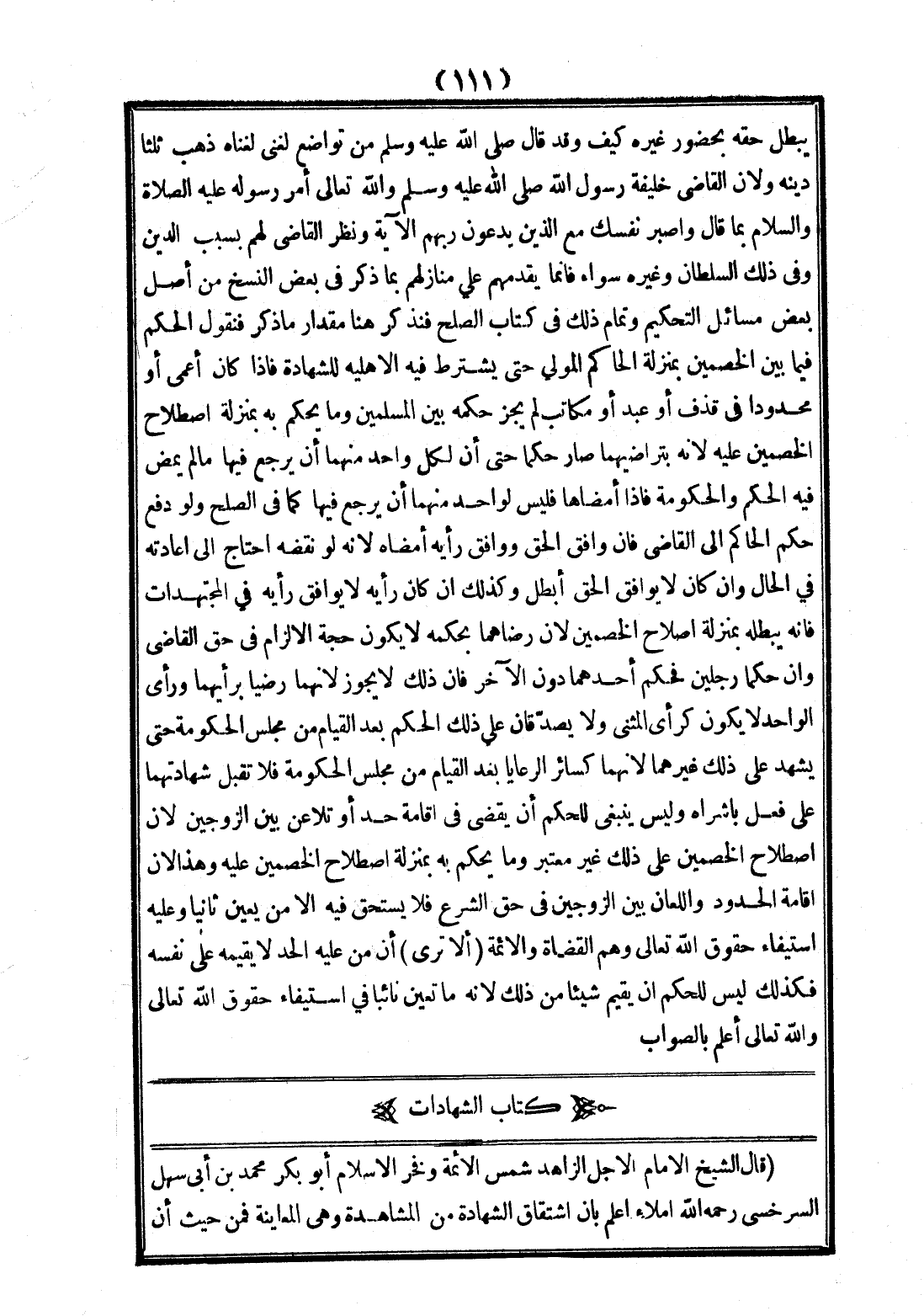 (قَالَ الشَّيْخُ الْإِمَامُ الْأَجَلُّ الزَّاهِدُ شَمْسُ الْأَئِمَّةِ وَفَخْرُ الْإِسْلَامِ أَبُو بَكْرٍ مُحَمَّدُ بْنُ أَبِي سَهْلٍ السَّرَخْسِيُّ - رَحِمَهُ اللَّهُ - إمْلَاءً: اعْلَمْ بِأَنَّ اشْتِقَاقَ الشَّهَادَةِ مِنْ الْمُشَاهَدَةِ وَهِيَ الْمُعَايَنَةُ فَمِنْ حَيْثُ إنَّ