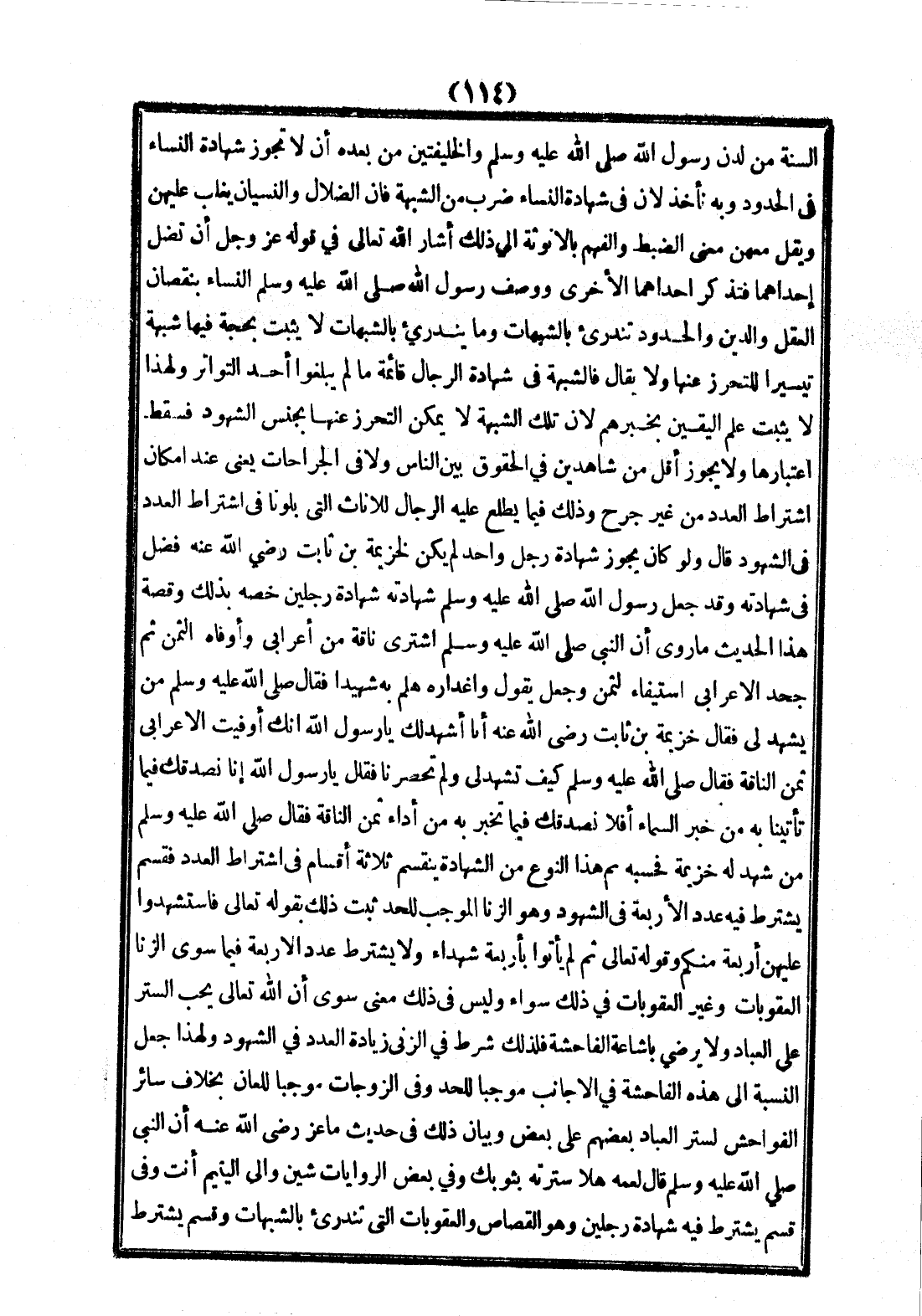 وَلَا يَجُوزُ أَقَلُّ مِنْ شَاهِدَيْنِ فِي الْحُقُوقِ بَيْنَ النَّاسِ وَلَا فِي الْجِرَاحَاتِ يَعْنِي عِنْدَ إمْكَانِ اشْتِرَاطِ الْعَدَدِ مِنْ غَيْرِ جُرْحٍ، وَذَلِكَ فِيمَا يَطَّلِعُ عَلَيْهِ الرِّجَالُ لِلْإِنَاثِ الَّتِي بَلَوْنَا فِي اشْتِرَاطِ الْعَدَدِ فِي الشُّهُودِ قَالَ، وَلَوْ كَانَ يَجُوزُ شَهَادَةُ رَجُلٍ وَاحِدٍ لَمْ يَكُنْ لِخُزَيْمَةَ بْنِ ثَابِتٍ - رَضِيَ اللَّهُ عَنْهُ - فَضْلٌ فِي شَهَادَتِهِ، وَقَدْ جَعَلَ رَسُولُ اللَّهِ - صَلَّى اللَّهُ عَلَيْهِ وَسَلَّمَ - شَهَادَتَهُ شَهَادَةَ رَجُلَيْنِ خَصَّهُ بِذَلِكَ وَقِصَّةُ هَذَا الْحَدِيثِ مَا رُوِيَ «أَنَّ النَّبِيَّ - صَلَّى اللَّهُ عَلَيْهِ وَسَلَّمَ - اشْتَرَى نَاقَةً مِنْ أَعْرَابِيٍّ وَأَوْفَاهُ الثَّمَنَ، ثُمَّ جَحَدَ الْأَعْرَابِيُّ اسْتِيفَاءَ الثَّمَنِ وَجَعَلَ يَقُولُ وَاغَدْرَاهُ هَلُمَّ بِهِ شَهِيدًا فَقَالَ - صَلَّى اللَّهُ عَلَيْهِ وَسَلَّمَ - مَنْ يَشْهَدُ لِي فَقَالَ خُزَيْمَةُ بْنُ ثَابِتٍ - رَضِيَ اللَّهُ عَنْهُ - أَنَا أَشْهَدُ لَك يَا رَسُولَ اللَّهِ أَنَّكَ أَوْفَيْت الْأَعْرَابِيَّ ثَمَنَ النَّاقَةِ فَقَالَ - صَلَّى اللَّهُ عَلَيْهِ وَسَلَّمَ - كَيْفَ تَشْهَدُ لِي وَلَمْ تَحْضُرْنَا فَقَالَ يَا رَسُولَ اللَّهِ إنَّا نُصَدِّقُك فِيمَا تَأْتِينَا بِهِ مِنْ خَبَرِ السَّمَاءِ أَفَلَا نُصَدِّقُك فِيمَا تُخْبِرُ بِهِ مِنْ أَدَاءِ ثَمَنِ النَّاقَةِ فَقَالَ - صَلَّى اللَّهُ عَلَيْهِ وَسَلَّمَ - مَنْ شَهِدَ لَهُ خُزَيْمَةُ فَحَسْبُهُ»