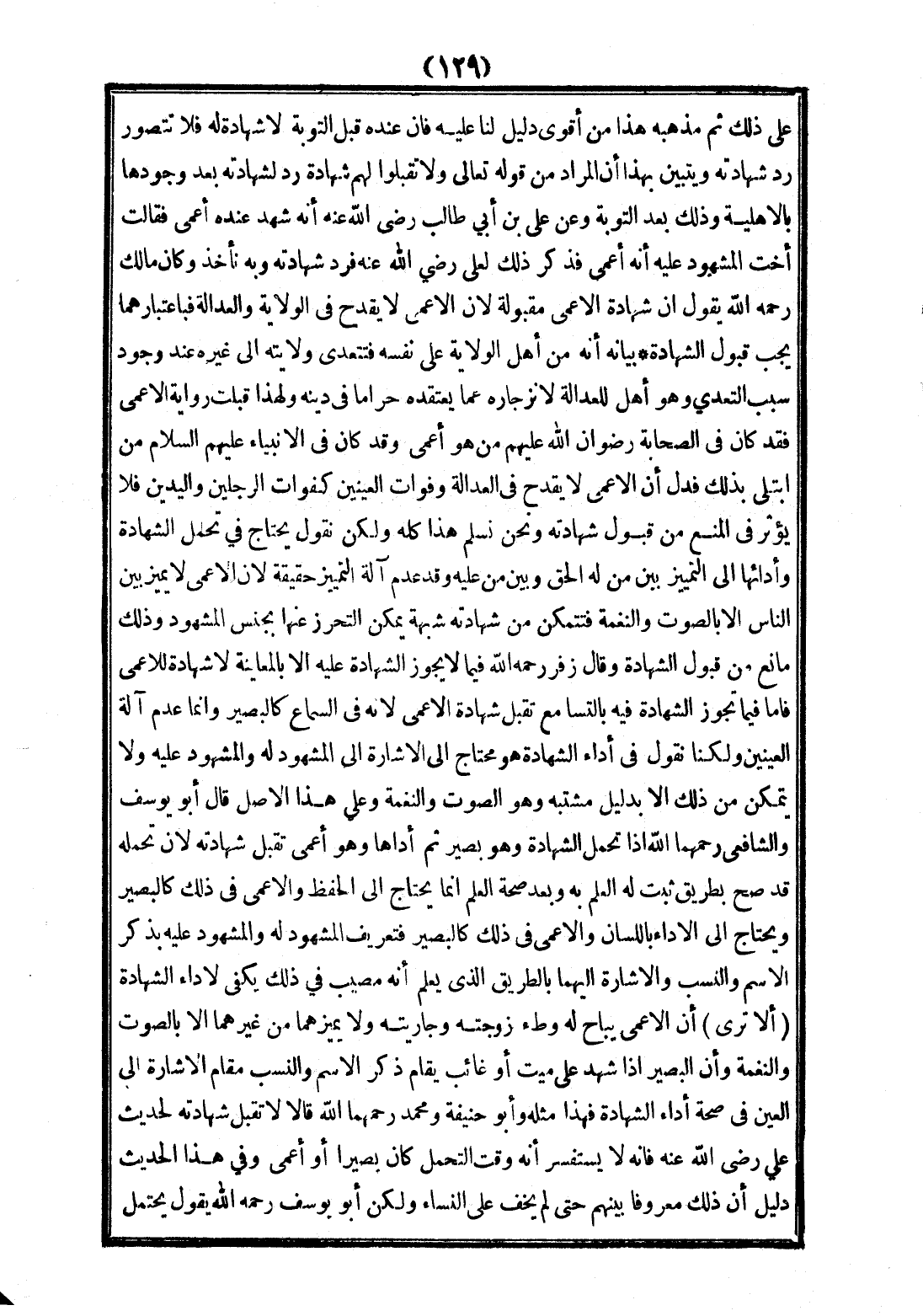 وَعَنْ عَلِيِّ بْنِ أَبِي طَالِبٍ - رَضِيَ اللَّهُ عَنْهُ - أَنَّهُ شَهِدَ عِنْدَهُ أَعْمَى فَقَالَتْ أُخْتُ الْمَشْهُودِ عَلَيْهِ إنَّهُ أَعْمَى فَذُكِرَ ذَلِكَ لِعَلِيٍّ - رَضِيَ اللَّهُ عَنْهُ - فَرَدَّ شَهَادَتَهُ، وَبِهِ نَأْخُذُ وَكَانَ مَالِكٌ - رَحِمَهُ اللَّهُ - يَقُولُ إنَّ شَهَادَةَ الْأَعْمَى مَقْبُولَةٌ؛ لِأَنَّ الْأَعْمَى لَا يَقْدَحُ فِي الْوِلَايَةِ وَالْعَدَالَةِ فَبِاعْتِبَارِهِمَا يَجِبُ قَبُولِ الشَّهَادَةِ بَيَانُهُ أَنَّهُ مِنْ أَهْلِ الْوِلَايَةِ عَلَى نَفْسِهِ فَتَتَعَدَّى وِلَايَتُهُ إلَى غَيْرِهِ عِنْدَ وُجُودِ سَبَبِ التَّعَدِّي وَهُوَ أَهْلٌ لِلْعَدَالَةِ لِانْزِجَارِهِ عَمَّا يَعْتَقِدُهُ حَرَامًا فِي دِينِهِ؛ وَلِهَذَا قُبِلَتْ رِوَايَةُ الْأَعْمَى فَقَدْ كَانَ فِي الصَّحَابَةِ - رِضْوَانُ اللَّهِ عَلَيْهِمْ - مَنْ هُوَ أَعْمَى، وَقَدْ كَانَ فِي الْأَنْبِيَاءِ - عَلَيْهِمْ السَّلَامُ - مَنْ ابْتَلَى بِذَلِكَ فَدَلَّ أَنَّ الْأَعْمَى لَا يُقْدَحُ فِي الْعَدَالَةِ وَفَوَاتُ الْعَيْنَيْنِ كَفَوَاتِ الرِّجْلَيْنِ وَالْيَدَيْنِ فَلَا يُؤَثِّرُ فِي الْمَنْعِ مِنْ قَبُولِ شَهَادَتِهِ وَنَحْنُ نُسَلِّمُ هَذَا كُلَّهُ، وَلَكِنْ نَقُولُ يُحْتَاجُ فِي تَحَمُّلِ الشَّهَادَةِ وَأَدَائِهَا إلَى التَّمْيِيزِ بَيْنَ مَنْ لَهُ الْحَقُّ وَبَيْنَ مَنْ عَلَيْهِ، وَقَدْ عَدِمَ آلَةَ التَّمْيِيزِ حَقِيقَةً؛ لِأَنَّ الْأَعْمَى لَا يُمَيِّزُ بَيْنَ النَّاسِ إلَّا بِالصَّوْتِ وَالنَّغْمَةِ فَتَتَمَكَّنُ مِنْ شَهَادَتِهِ شُبْهَةٌ يُمْكِنُ التَّحَرُّزُ عَنْهَا بِجِنْسِ الْمَشْهُودِ، وَذَلِكَ مَانِعٌ مِنْ قَبُولِ الشَّهَادَةِ. وَقَالَ زُفَرُ - رَحِمَهُ اللَّهُ - فِيمَا لَا يَجُوزُ الشَّهَادَةُ عَلَيْهِ إلَّا بِالْمُعَايَنَةِ لَا شَهَادَةَ لِلْأَعْمَى. فَأَمَّا فِيمَا تَجُوزُ الشَّهَادَةُ فِيهِ بِالتَّسَامُعِ تُقْبَلُ شَهَادَةُ الْأَعْمَى؛ لِأَنَّهُ فِي السَّمَاعِ كَالْبَصِيرِ، وَإِنَّمَا عَدَمُ آلَةِ الْعَيْنَيْنِ، وَلَكِنَّا نَقُولُ فِي أَدَاءِ الشَّهَادَةِ هُوَ مُحْتَاجٌ إلَى الْإِشَارَةِ إلَى الْمَشْهُودِ لَهُ وَالْمَشْهُودِ عَلَيْهِ وَلَا يَتَمَكَّنُ مِنْ ذَلِكَ إلَّا بِدَلِيلٍ مُشْتَبَهٍ وَهُوَ الصَّوْتُ وَالنَّغْمَةُ وَعَلَى هَذَا الْأَصْلِ قَالَ أَبُو يُوسُفَ وَالشَّافِعِيُّ - رَضِيَ اللَّهُ عَنْهُمَا - إذَا تَحَمَّلَ الشَّهَادَةَ وَهُوَ بَصِيرٌ، ثُمَّ أَدَّاهَا وَهُوَ أَعْمَى تُقْبَلُ شَهَادَتُهُ؛ لِأَنَّ تَحَمُّلَهُ قَدْ صَحَّ بِطَرِيقٍ ثَبَتَ لَهُ الْعِلْمُ بِهِ، وَبَعْدَ صِحَّةِ الْعِلْمِ إنَّمَا يَحْتَاجُ إلَى الْحِفْظِ وَالْأَعْمَى فِي ذَلِكَ كَالْبَصِيرِ وَيَحْتَاجُ إلَى الْأَدَاءِ بِاللِّسَانِ وَالْأَعْمَى فِي ذَلِكَ كَالْبَصِيرِ فَتَعْرِيفُ الْمَشْهُودِ لَهُ وَالْمَشْهُودِ عَلَيْهِ بِذِكْرِ الِاسْمِ وَالنَّسَبِ وَالْإِشَارَةِ إلَيْهِمَا بِالطَّرِيقِ الَّذِي يُعْلَمُ أَنَّهُ مُصِيبٌ فِي ذَلِكَ يَكْفِي لِأَدَاءِ الشَّهَادَةِ