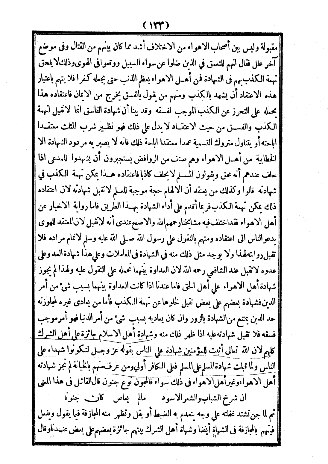 وَشَهَادَةُ أَهْلِ الْإِسْلَامِ جَائِزَةٌ عَلَى أَهْلِ الشِّرْكِ كُلِّهِمْ؛ لِأَنَّ اللَّهَ تَعَالَى أَثْبَتَ لِلْمُؤْمِنِينَ شَهَادَةً عَلَى النَّاسِ بِقَوْلِهِ عَزَّ وَجَلَّ {لِتَكُونُوا شُهَدَاءَ عَلَى النَّاسِ} [البقرة: 143] وَلَمَّا قُبِلَتْ شَهَادَةُ الْمُسْلِمِ عَلَى الْمُسْلِمِ فَعَلَى الْكَافِرِ أَوْلَى وَمَنْ عُرِفَ مِنْهُمْ بِالْخِيَانَةِ لَمْ تَجُزْ شَهَادَتُهُ أَهْلِ الْأَهْوَاءِ وَغَيْرُ أَهْلِ الْأَهْوَاءِ فِي ذَلِكَ سَوَاءٌ فَالْمُجُونُ نَوْعَ جُنُونٍ قَالَ الْقَائِلُ فِي هَذَا الْمَعْنَى