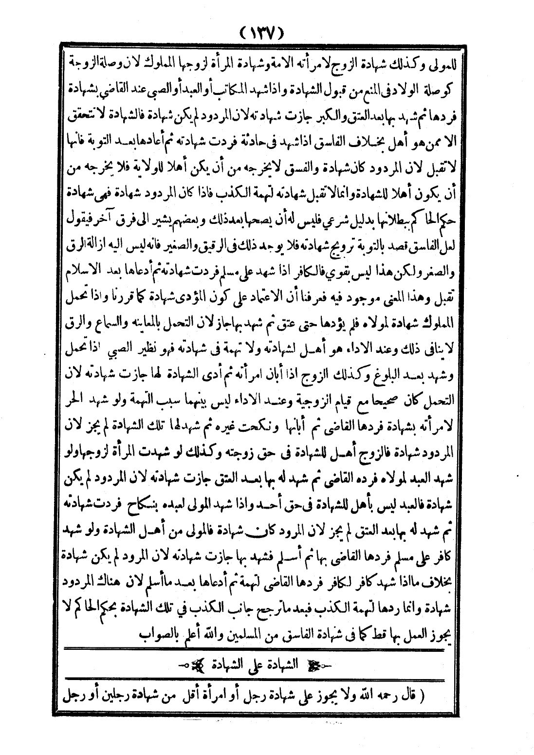 الشَّهَادَةُ عَلَى الشَّهَادَةِ (قَالَ - رَحِمَهُ اللَّهُ - وَلَا يَجُوزُ عَلَى شَهَادَةِ رَجُلٍ، أَوْ امْرَأَةٍ أَقَلُّ مِنْ شَهَادَةِ رَجُلَيْنِ، أَوْ رَجُلٍ