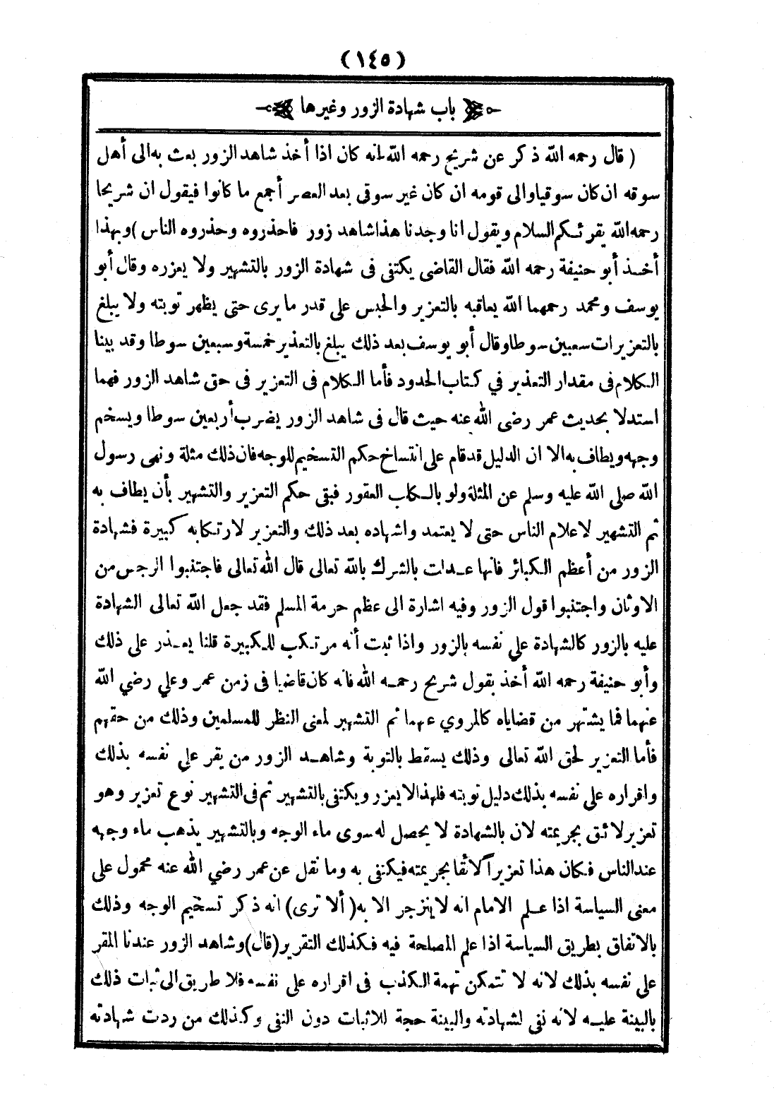(قَالَ - رَحِمَهُ اللَّهُ - ذُكِرَ عَنْ شُرَيْحٍ - رَحِمَهُ اللَّهُ - أَنَّهُ كَانَ إذَا أَخَذَ شَاهِدُ الزُّورِ بَعَثَ بِهِ إلَى أَهْلِ سُوقِهِ إنْ كَانَ سُوقِيًّا وَإِلَى قَوْمِهِ إنْ كَانَ غَيْرَ سُوقِيٍّ بَعْدَ الْعَصْرِ أَجْمَعَ مَا كَانُوا فَيَقُولُ إنَّ شُرَيْحًا - رَحِمَهُ اللَّهُ - يُقْرِئُكُمْ السَّلَامَ وَيَقُولُ أَنَا وَجَدْنَا هَذَا شَاهِدُ زُورٍ فَاحْذَرُوهُ وَحَذِّرُوهُ النَّاسَ) وَبِهَذَا أَخَذَ أَبُو حَنِيفَةَ - رَحِمَهُ اللَّهُ - فَقَالَ الْقَاضِي يُكْتَفَى فِي شَهَادَةِ الزُّورِ بِالتَّشْهِيرِ وَلَا يُعَزِّرُهُ. وَقَالَ أَبُو يُوسُفَ وَمُحَمَّدٌ رَحِمَهُمَا اللَّهُ يُعَاقِبُهُ بِالتَّعْزِيرِ وَالْحَبْسُ عَلَى قَدْرِ مَا يَرَى حَتَّى يُظْهِرَ تَوْبَتَهُ وَلَا يَبْلُغَ بِالتَّعْزِيرَاتِ سَبْعِينَ سَوْطًا. وَقَالَ أَبُو يُوسُفَ بَعْدَ ذَلِكَ يَبْلُغُ بِالتَّعْزِيرِ خَمْسَةً وَسَبْعِينَ سَوْطًا، وَقَدْ بَيَّنَّا الْكَلَامَ فِي مِقْدَارِ التَّعْزِيرِ فِي كِتَابِ الْحُدُودِ. فَأَمَّا الْكَلَامُ فِي التَّعْزِيرِ فِي حَقِّ شَاهِدِ الزُّورِ فَهُمَا اسْتَدَلَّا بِحَدِيثِ عُمَرَ - رَضِيَ اللَّهُ عَنْهُ - حَيْثُ قَالَ فِي شَاهِدِ الزُّورِ يُضْرَبُ أَرْبَعِينَ سَوْطًا وَيُسَخَّمُ وَجْهُهُ وَيُطَافُ بِهِ إلَّا أَنَّ الدَّلِيلَ قَدْ قَامَ عَلَى انْتِسَاخِ حُكْمِ التَّسْخِيمِ لِلْوَجْهِ فَإِنَّ ذَلِكَ مُثْلَةٌ «وَنَهَى رَسُولُ اللَّهِ - صَلَّى اللَّهُ عَلَيْهِ وَسَلَّمَ - عَنْ الْمُثْلَةِ، وَلَوْ بِالْكَلْبِ الْعَقُورِ».