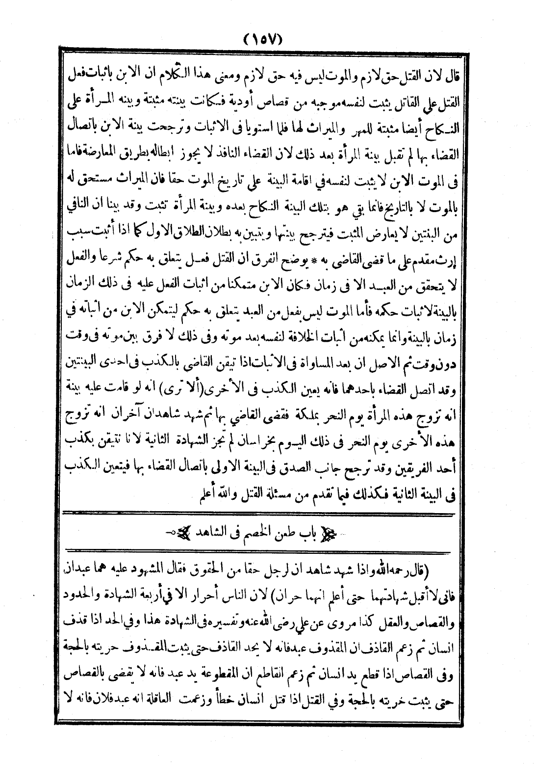 (قَالَ - رَحِمَهُ اللَّهُ -. وَإِذَا شَهِدَ شَاهِدٌ أَنَّ لِرَجُلٍ حَقًّا مِنْ الْحُقُوقِ فَقَالَ الْمَشْهُودُ عَلَيْهِ هُمَا عَبْدَانِ فَإِنِّي لَا أَقْبَلُ شَهَادَتَهُمَا حَتَّى أَعْلَمَ أَنَّهُمَا حُرَّانِ)؛ لِأَنَّ النَّاسَ أَحْرَارٌ إلَّا فِي أَرْبَعَةٍ الشَّهَادَةِ وَالْحُدُودِ وَالْقِصَاصِ وَالْعَقْلِ كَذَا مَرْوِيٌّ عَنْ عَلِيٍّ - رَضِيَ اللَّهُ عَنْهُ - وَتَفْسِيرُهُ فِي الشَّهَادَةِ هَذَا، وَفِي الْحَيِّ إذَا قَذَفَ إنْسَانٌ، ثُمَّ زَعَمَ الْقَاذِفُ أَنَّ الْمَقْذُوفَ عَبْدٌ فَإِنَّهُ لَا يُحَدُّ الْقَاذِفُ حَتَّى يُثْبِتَ الْمَقْذُوفُ حُرِّيَّتَهُ بِالْحُجَّةِ، وَفِي الْقِصَاصِ إذَا قَطَعَ يَدَ إنْسَانٍ، ثُمَّ زَعَمَ الْقَاطِعُ أَنَّ الْمَقْطُوعَةَ يَدُ عَبْدٍ فَإِنَّهُ لَا يُقْضَى بِالْقِصَاصِ حَتَّى يُثْبِتَ حُرِّيَّتَهُ بِالْحُجَّةِ، وَفِي الْقَتْلِ إذَا قَتَلَ إنْسَانٌ خَطَأً وَزَعَمَتْ الْعَاقِلَةُ أَنَّهُ عَبْدُ فُلَانٍ فَإِنَّهُ لَا