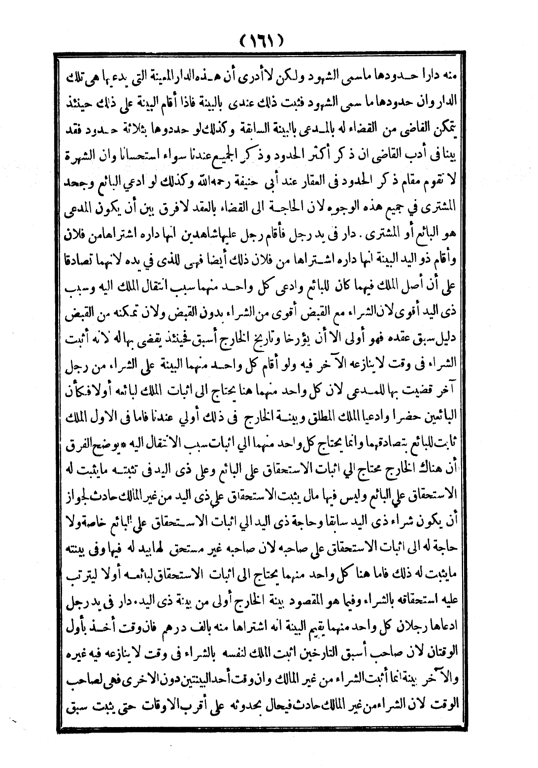 دَارٌ فِي يَدِ رَجُلٍ فَأَقَامَ رَجُلٌ عَلَيْهَا شَاهِدَيْنِ أَنَّهَا دَارُهُ اشْتَرَاهَا مِنْ فُلَانٍ وَأَقَامَ ذُو الْيَدِ الْبَيِّنَةَ أَنَّهَا دَارُهُ اشْتَرَاهَا مِنْ فُلَانٍ ذَلِكَ أَيْضًا فَهِيَ لِلَّذِي فِي يَدِهِ؛ لِأَنَّهُمَا تَصَادَقَا عَلَى أَنَّ أَصْلَ الْمِلْكِ فِيهِمَا كَانَ لِلْبَائِعِ وَادَّعَى كُلُّ وَاحِدٍ مِنْهُمَا سَبَبَ انْتِقَالِ الْمِلْكِ إلَيْهِ وَسَبَبُ ذِي الْيَدِ أَقْوَى؛ لِأَنَّ الشِّرَاءَ مَعَ الْقَبْضِ أَقْوَى مِنْ الشِّرَاءِ بِدُونِ الْقَبْضِ، وَلِأَنَّ تَمَكُّنَهُ مِنْ الْقَبْضِ دَلِيلٌ سَبَقَ عَقْدَهُ فَهُوَ أَوْلَى إلَّا أَنْ يُؤَرِّخَا وَتَارِيخُ الْخَارِجِ أَسْبَقُ فَحِينَئِذٍ يَقْضِي بِهَا لَهُ؛ لِأَنَّهُ أَثْبَتَ الشِّرَاءَ فِي وَقْتٍ لَا يُنَازِعُهُ الْآخَرُ فِيهِ، وَلَوْ أَقَامَ كُلُّ وَاحِدٍ مِنْهُمَا الْبَيِّنَةَ عَلَى الشِّرَاءِ مِنْ رَجُلٍ آخَرَ قَضَيْت بِهَا لِلْمُدَّعِي؛ لِأَنَّ كُلَّ وَاحِدٍ مِنْهُمَا هُنَا يَحْتَاجُ إلَى إثْبَاتِ الْمِلْكِ لِبَائِعِهِ أَوَّلًا فَكَأَنَّ الْبَائِعَيْنِ حَضَرَا وَادَّعَيَا الْمِلْكَ الْمُطْلَقَ وَبَيِّنَةُ الْخَارِجِ فِي ذَلِكَ أَوْلَى عِنْدَنَا. فَأَمَّا فِي الْأَوَّلِ الْمِلْكُ ثَابِتٌ لِلْبَائِعِ بِتَصَادُقِهِمَا، وَإِنَّمَا يَحْتَاجُ كُلُّ وَاحِدٍ مِنْهُمَا إلَى إثْبَاتِ سَبَبِ الِانْتِقَالِ إلَيْهِ يُوَضِّحُ الْفَرْقَ أَنَّ هُنَاكَ الْخَارِجُ مُحْتَاجٌ إلَى إثْبَاتِ الِاسْتِحْقَاقِ عَلَى الْبَائِعِ وَعَلَى ذِي الْيَدِ فِي تَثَبُّتِهِ مَا يَثْبُتُ لَهُ الِاسْتِحْقَاقُ عَلَى الْبَائِعِ، وَلَيْسَ فِيهَا مَالٌ يُثْبِتُ الِاسْتِحْقَاقَ عَلَى ذِي الْيَدِ مِنْ غَيْرِ الْمَالِكِ حَادِثٌ لِجَوَازِ أَنْ يَكُونَ شِرَاءُ ذِي الْيَدِ سَابِقًا وَحَاجَةُ ذِي الْيَدِ إلَى إثْبَاتِ الِاسْتِحْقَاقِ عَلَى الْبَائِعِ خَاصَّةً وَلَا حَاجَةَ لَهُ إلَى إثْبَاتِ الِاسْتِحْقَاقِ عَلَى صَاحِبِهِ؛ لِأَنَّ صَاحِبَهُ غَيْرُ مُسْتَحِقٍّ لَهَا بِيَدٍ لَهُ فِيهَا، وَفِي بَيِّنَتِهِ مَا يُثْبِتُ لَهُ ذَلِكَ. فَأَمَّا هُنَا كُلُّ وَاحِدٍ مِنْهُمَا يَحْتَاجُ إلَى إثْبَاتِ الِاسْتِحْقَاقِ لِبَائِعِهِ أَوَّلًا لِيَتَرَتَّبَ عَلَيْهِ اسْتِحْقَاقُهُ بِالشِّرَاءِ، وَفِيمَا هُوَ الْمَقْصُودُ بَيِّنَةُ الْخَارِجِ أَوْلَى مِنْ بَيِّنَةِ ذِي الْيَدِ.
