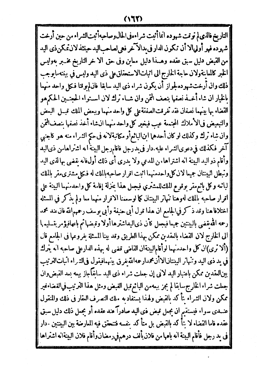 دَارٌ فِي يَدِ رَجُلٍ فَأَقَامَ رَجُلُ الْبَيِّنَةَ أَنَّهُ اشْتَرَاهَا مِنْ ذِي الْيَدِ وَأَقَامَ ذُو الْيَدِ الْبَيِّنَةَ أَنَّهُ اشْتَرَاهَا مِنْ الْمُدَّعِي وَلَا يَدْرِي أَيُّ ذَلِكَ أَوَّلُ فَإِنَّهُ يَقْضِي بِهَا لِذِي الْيَدِ وَتَبْطُلُ الْبَيِّنَتَانِ جَمِيعًا؛ لِأَنَّ كُلَّ وَاحِدٍ مِنْهُمَا أَثْبَتَ إقْرَارَ صَاحِبِهِ بِالْمِلْكِ لَهُ فَكُلُّ مُشْتَرٍ مُقِرٌّ بِالْمِلْكِ لِبَائِعِهِ وَكُلُّ بَائِعٍ مُقِرٌّ بِوُقُوعِ الْمِلْكِ لِلْمُشْتَرِي فَيُجْعَلُ هَذَا بِمَنْزِلَةِ إقَامَةِ كُلِّ وَاحِدٍ مِنْهُمَا الْبَيِّنَةَ عَلَى إقْرَارِ صَاحِبِهِ بِالْمِلْكِ لَهُ وَهُنَا تَتَهَاتَرُ الْبَيِّنَتَانِ كَمَا لَوْ سَمِعْنَا الْإِقْرَارَ مِنْهُمَا مَعًا وَلَمْ يَذْكُرْ فِي الْمَسْأَلَةِ اخْتِلَافًا هُنَا، وَقَدْ ذَكَرَ فِي الْجَامِعِ أَنَّ هَذَا قَوْلَ أَبِي حَنِيفَةَ وَأَبِي يُوسُفَ - رَحِمَهُمُ اللَّهُ - فَإِنَّ عِنْدَ مُحَمَّدٍ - رَحِمَهُ اللَّهُ - يَقْضِي بِالْبَيِّنَتَيْنِ جَمِيعًا كَأَنَّ ذِي الْيَدِ اشْتَرَاهَا أَوَّلًا وَقَبَضَهَا، ثُمَّ بَاعَهَا فَيُؤْمَرُ بِتَسْلِيمِهَا إلَى الْخَارِجِ؛ لِأَنَّ الْقَضَاءَ بِالْعَقْدَيْنِ مُمْكِنٌ بِهَذَا الطَّرِيقِ، وَقَدْ بَيَّنَّا الْمَسْأَلَةَ بِفُرُوعِهَا فِي الْجَامِعِ قَالَ.