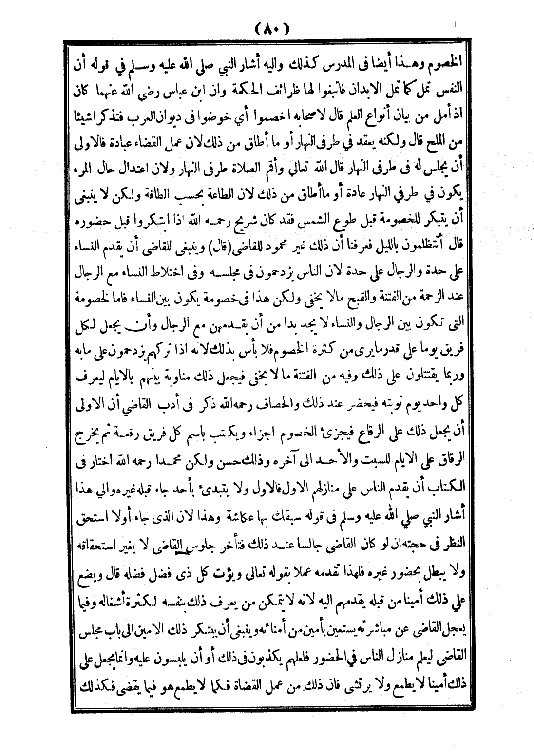 الْخُصُومِ، وَهَذَا أَيْضًا فِي الْمُدَرِّسِ كَذَلِكَ وَإِلَيْهِ أَشَارَ النَّبِيُّ - صَلَّى اللَّهُ عَلَيْهِ وَسَلَّمَ - فِي قَوْلِهِ «إنْ النَّفْسَ تَمَلُّ كَمَا تَمَلُّ الْأَبْدَانُ فَابْتَغَوْا لَهَا ظَرَائِفَ الْحِكْمَةِ»، وَإِنَّ ابْنَ عَبَّاسٍ - رَضِيَ اللَّهُ عَنْهُمَا - كَانَ إذَا مَلَّ مِنْ بَيَانِ أَنْوَاعِ الْعِلْمِ قَالَ لِأَصْحَابِهِ اخْصِمُوا أَيْ خُوضُوا فِي دِيوَانِ الْعَرَبِ فَتَذَكَّرُوا شَيْئًا مِنْ الْمُلَحِ قَالَ، وَلَكِنَّهُ يَقْعُدُ فِي طَرَفَيْ النَّهَارِ، أَوْ مَا أَطَاقَ مِنْ ذَلِكَ؛ لِأَنَّ عَمَلَ الْقَضَاءِ عِبَادَةٌ فَالْأَوْلَى أَنْ يَجْلِسَ لَهُ فِي طَرَفَيْ النَّهَارِ قَالَ اللَّهُ تَعَالَى {وَأَقِمْ الصَّلَاةَ طَرَفَيْ النَّهَارِ} [هود: 114]، وَلِأَنَّ اعْتِدَالَ حَالِ الْمَرْءِ يَكُونُ فِي طَرَفَيْ النَّهَارِ عَادَةً، أَوْ مَا أَطَاقَ مِنْ ذَلِكَ؛ لِأَنَّ الطَّاعَةَ بِحَسَبِ الطَّاقَةِ، وَلَكِنْ لَا يَنْبَغِي أَنْ يَتَبَكَّرَ لِلْخُصُومَةِ قَبْلَ طُلُوعِ الشَّمْسِ فَقَدْ كَانَ شُرَيْحٌ - رَحِمَهُ اللَّهُ - إذَا ابْتَكَرُوا قَبْلَ حُضُورِهِ قَالَ أَتَتَظَلَّمُونَ بِاللَّيْلِ فَعَرَفْنَا أَنَّ ذَلِكَ غَيْرُ مَحْمُودٍ لِلْقَاضِي