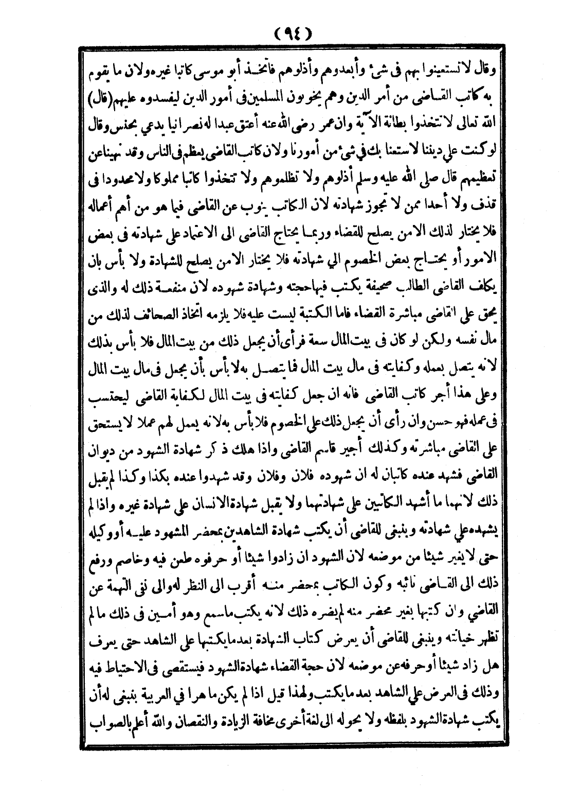 وَقَالَ لَا تَسْتَعِينُوا بِهِمْ فِي شَيْءٍ وَأَبْعِدُوهُمْ وَأَذِلُّوهُمْ فَاِتَّخَذَ أَبُو مُوسَى كَاتِبًا غَيْرَهُ، وَلِأَنَّ مَا يَقُومُ بِهِ كَاتِبُ الْقَاضِي مِنْ أَمْرِ الدِّينِ وَهُمْ يَخُونُونَ الْمُسْلِمِينَ فِي أُمُورِ الدِّينِ لِيُفْسِدُوهُ عَلَيْهِمْ (قَالَ) اللَّهُ تَعَالَى {لَا تَتَّخِذُوا بِطَانَةً} [آل عمران: 118] الْآيَةَ، وَإِنَّ عُمَرَ - رَضِيَ اللَّهُ عَنْهُ - أَعْتَقَ عَبْدًا لَهُ نَصْرَانِيًّا يُدْعَى بحنس. وَقَالَ لَوْ كُنْتَ عَلَى دِينِنَا لَاسْتَعَنَّا بِك فِي شَيْءٍ مِنْ أُمُورِنَا، وَلِأَنَّ كَاتِبَ الْقَاضِي يُعَظَّمُ فِي النَّاسِ، وَقَدْ نُهِينَا عَنْ تَعْظِيمِهِمْ قَالَ - صَلَّى اللَّهُ عَلَيْهِ وَسَلَّمَ - «أَذِلُّوهُمْ وَلَا تَظْلِمُوهُمْ وَلَا تَتَّخِذُوا كَاتِبًا مَمْلُوكًا وَلَا مَحْدُودًا فِي قَذْفٍ وَلَا أَحَدًا مِمَّنْ لَا تَجُوزُ شَهَادَتُهُ»؛ لِأَنَّ الْكَاتِبَ يَنُوبُ عَنْ الْقَاضِي فِيمَا هُوَ مِنْ أَهَمِّ أَعْمَالِهِ فَلَا يَخْتَارُ لِذَلِكَ إلَّا مِنْ يَصْلُحُ لِلْقَضَاءِ وَرُبَّمَا يَحْتَاجُ الْقَاضِي إلَى الِاعْتِمَادِ عَلَى شَهَادَتِهِ فِي بَعْضِ الْأُمُورِ، أَوْ يَحْتَاجُ بَعْضُ الْخُصُومِ إلَى شَهَادَتِهِ فَلَا يَخْتَارُ إلَّا مَنْ يَصْلُحُ لِلشَّهَادَةِ