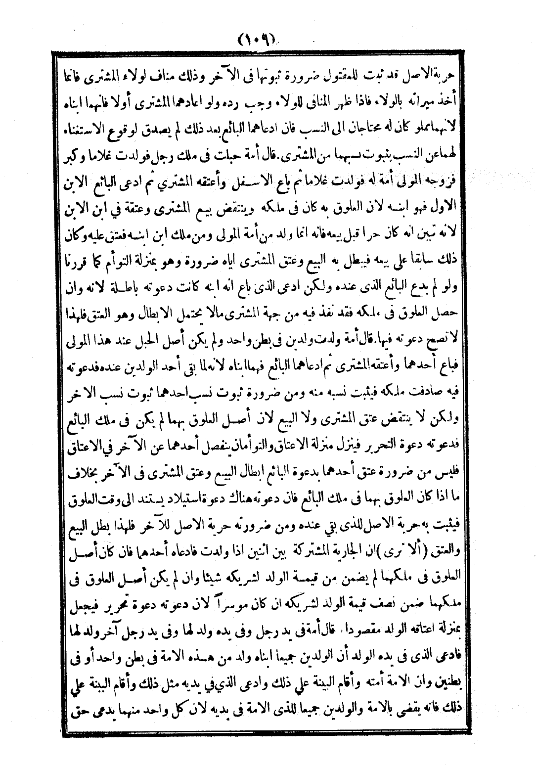 قَالَ أَمَةٌ حَبِلَتْ فِي مِلْكِ رَجُلٍ فَوَلَدَتْ غُلَامًا، وَكَبُرَ فَزَوَّجَهُ الْوَلِيُّ أَمَةً لَهُ فَوَلَدَتْ غُلَامًا، ثُمَّ بَاعَ الْأَسْفَلَ، وَأَعْتَقَهُ الْمُشْتَرِي، ثُمَّ ادَّعَى الْبَائِعُ الِابْنَ الْأَوَّلَ فَهُوَ ابْنُهُ؛ لِأَنَّ الْعُلُوقَ بِهِ كَانَ فِي مِلْكِهِ وَيُنْتَقَضُ بَيْعُ الْمُشْتَرِي، وَعِتْقُهُ فِي ابْنِ الِابْنِ؛ لِأَنَّهُ تَبَيَّنَ أَنَّهُ كَانَ حُرًّا قَبْلَ بَيْعِهِ فَإِنَّهُ إنَّمَا وُلِدَ مِنْ أَمَةِ الْمَوْلَى وَمِنْ مِلْكِ ابْنِ ابْنِهِ فَعَتَقَ عَلَيْهِ، وَكَانَ ذَلِكَ سَابِقًا عَلَى بَيْعِهِ فَيَبْطُلُ بِهِ الْبَيْعُ، وَعِتْقُ الْمُشْتَرِي إيَّاهُ ضَرُورَةً، وَهُوَ بِمَنْزِلَةِ التَّوْأَمِ كَمَا قَرَّرْنَا وَلَوْ لَمْ يَدَّعِ الْبَائِعُ الَّذِي عِنْدَهُ وَلَكِنْ ادَّعَى الَّذِي بَاعَ أَنَّهُ ابْنُهُ كَانَتْ دَعْوَتُهُ بَاطِلَةً؛ لِأَنَّهُ، وَإِنْ حَصَلَ الْعُلُوقُ فِي مِلْكِهِ فَقَدْ نَفَذَ فِيهِ مِنْ جِهَةِ الْمُشْتَرِي مَا لَا يَحْتَمِلُ الْإِبْطَالَ وَهُوَ الْعِتْقُ فَلِهَذَا لَا تَصِحُّ دَعْوَتُهُ فِيهَا