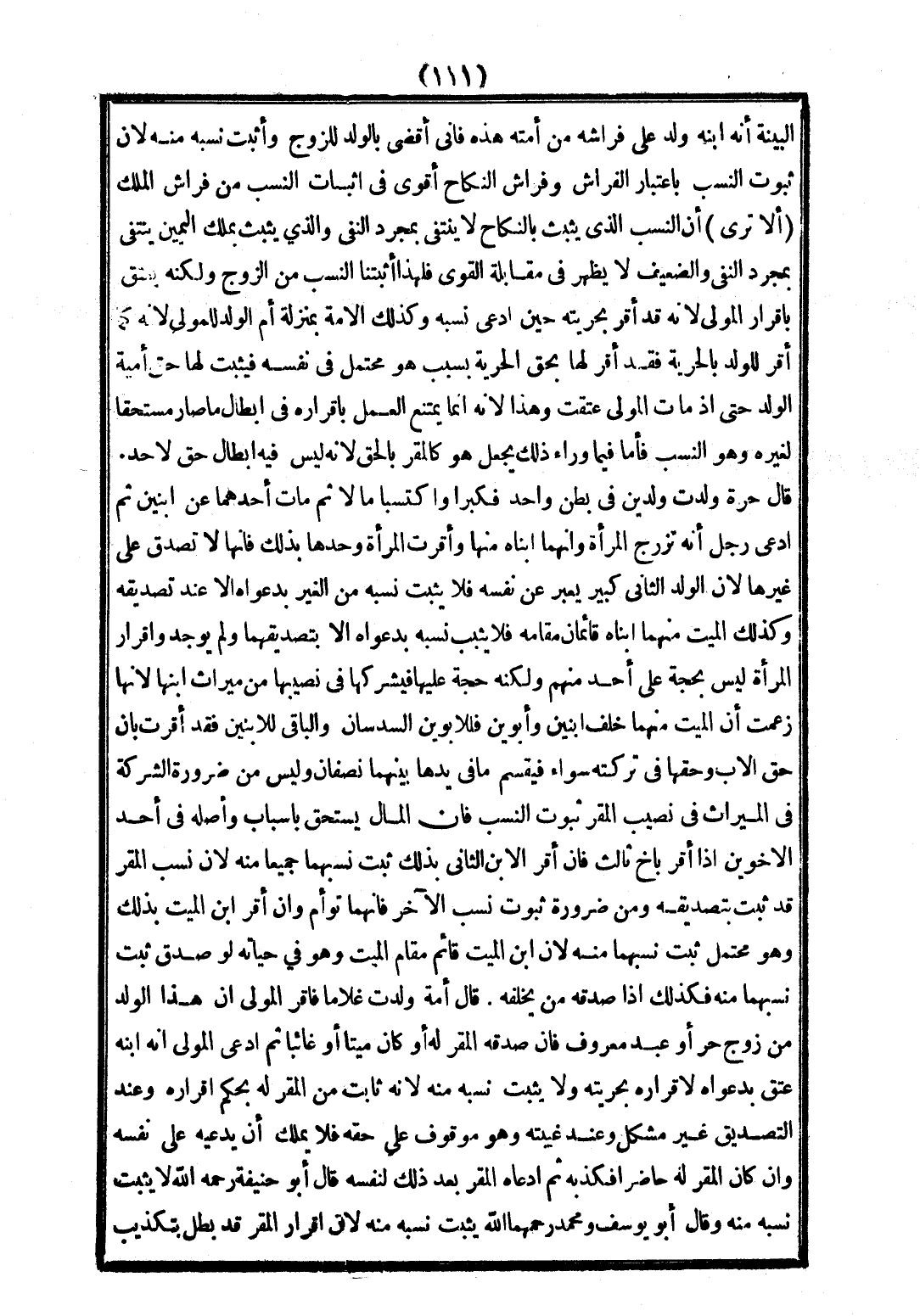 الْبَيِّنَةَ أَنَّهُ ابْنُهُ وُلِدَ عَلَى فِرَاشِهِ مِنْ أَمَتِهِ هَذِهِ فَإِنِّي أَقْضِي بِالْوَلَدِ لِلزَّوْجِ، وَأُثْبِتُ نَسَبَهُ مِنْهُ؛ لِأَنَّ ثُبُوتَ النَّسَبِ بِاعْتِبَارِ الْفِرَاشِ، وَفِرَاشُ النِّكَاحِ أَقْوَى فِي إثْبَاتِ النَّسَبِ مِنْ فِرَاشِ الْمِلْكِ.