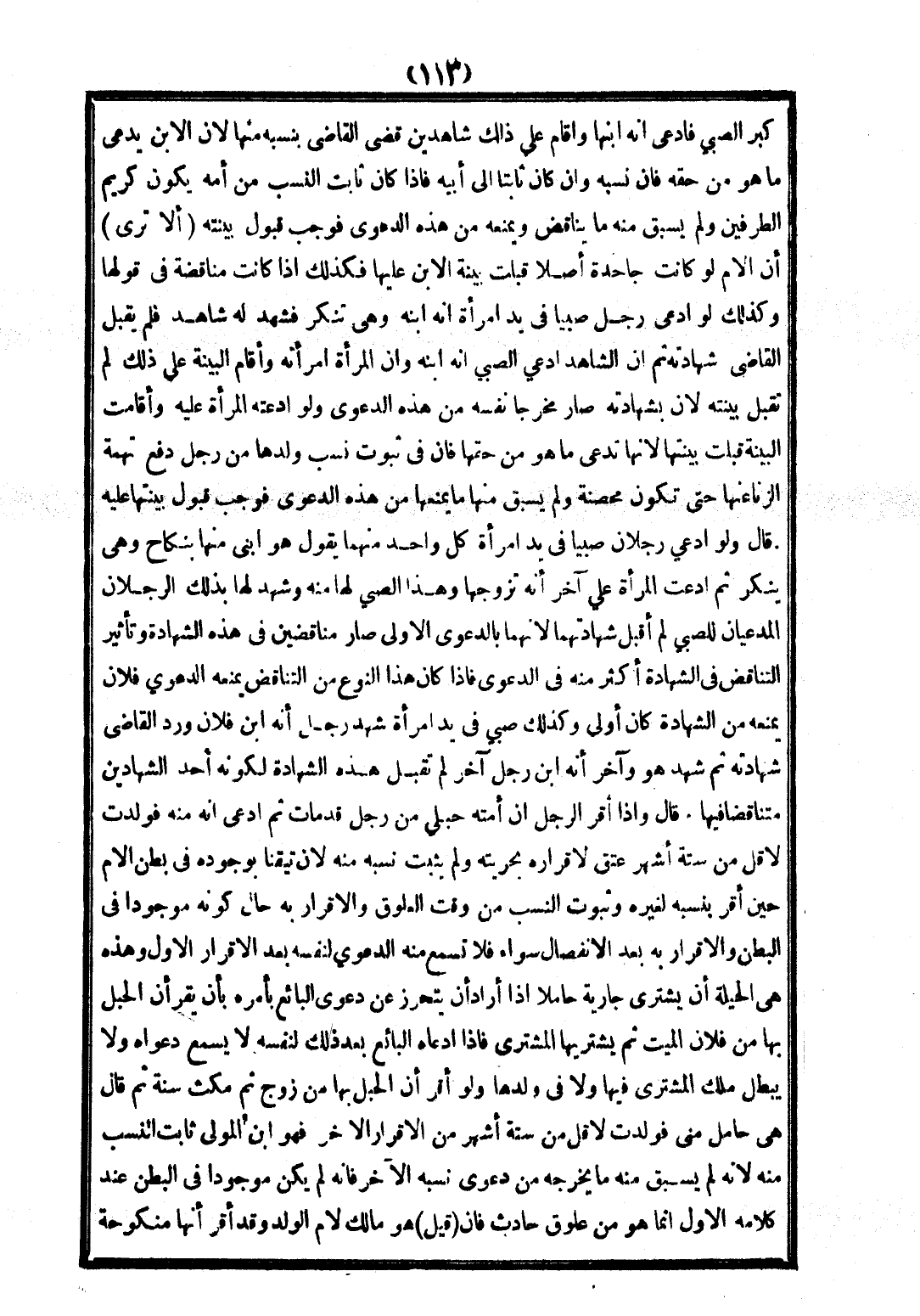 وَكَذَلِكَ صَبِيٌّ فِي يَدِ امْرَأَةٍ شَهِدَ رَجُلٌ أَنَّهُ ابْنُ فُلَانٍ وَرَدَّ الْقَاضِي شَهَادَتَهُ، ثُمَّ شَهِدَ هُوَ وَآخَرُ أَنَّهُ ابْنُ رَجُلٍ آخَرَ لَمْ تُقْبَلْ هَذِهِ الشَّهَادَةُ لِكَوْنِهِ أَحَدَ الشَّاهِدَيْنِ مُتَنَاقِضًا فِيهَا