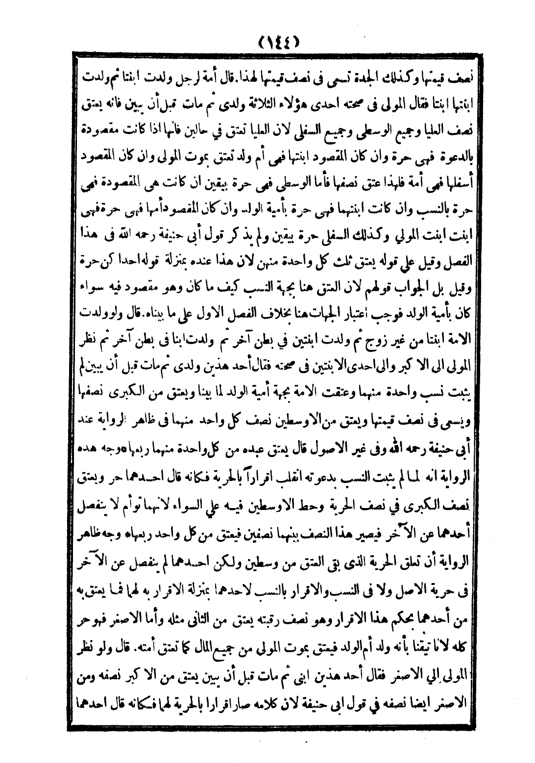 قَالَ: أَمَةٌ لِرَجُلِ وَلَدَتْ ابْنَتًا، ثُمَّ وَلَدَتْ ابْنَتَهَا ابْنَتًا فَقَالَ الْمَوْلَى فِي صِحَّتِهِ: إحْدَى هَؤُلَاءِ الثَّلَاثَةِ وَلَدِي، ثُمَّ مَاتَ قَبْلَ أَنْ يُبَيِّنَ فَإِنَّهُ يُعْتَقُ نِصْفُ الْعُلْيَا وَجَمِيعُ الْوُسْطَى، وَجَمِيعُ السُّفْلَى؛ لِأَنَّ الْعُلْيَا تُعْتَقُ فِي حَالَيْنِ فَإِنَّهَا إذَا كَانَتْ مَقْصُودَةً بِالدَّعْوَةِ فَهِيَ حُرَّةٌ، وَإِنْ كَانَ الْمَقْصُودُ ابْنَتَهَا فَهِيَ أُمُّ وَلَدٍ تُعْتَقُ بِمَوْتِ الْمَوْلَى، وَإِنْ كَانَ الْمَقْصُودُ أَسْفَلَهَا فَهِيَ أَمَةٌ فَلِهَذَا عَتَقَ نِصْفُهَا فَأَمَّا الْوُسْطَى فَهِيَ حُرَّةٌ بِيَقِينٍ إنْ كَانَتْ هِيَ الْمَقْصُودَةَ فَهِيَ حُرَّةٌ بِالنَّسَبِ، وَإِنْ كَانَتْ ابْنَتَهُمَا فَهِيَ حُرَّةٌ بِأُمِّيَّةِ الْوَلَدِ، وَإِنْ كَانَ الْمَقْصُودُ أُمَّهَا فَهِيَ حُرَّةٌ فَهِيَ بِنْتُ بِنْتِ الْمَوْلَى، وَكَذَلِكَ السُّفْلَى حُرَّةٌ بِيَقِينٍ.