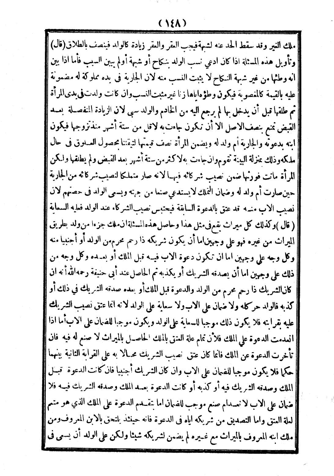 (قَالَ): وَكَذَلِكَ كُلُّ مِيرَاثٍ يَقَعُ فِي مِثْلِ هَذَا وَحَاصِلُ هَذِهِ الْمَسْأَلَةِ إنْ مَلَكَ جُزْءًا مِنْ وَلَدٍ بِطَرِيقِ الْمِيرَاثِ مِنْ غَيْرِهِ فَهُوَ عَلَى وَجْهَيْنِ إمَّا أَنْ يَكُونَ شَرِيكُهُ ذَا رَحِمٍ مَحْرَمٍ مِنْ الْوَلَدِ أَوْ أَجْنَبِيًّا مِنْهُ، وَكُلُّ وَجْهٍ عَلَى وَجْهَيْنِ إمَّا أَنْ تَكُونَ دَعْوَةُ الْأَبِ فِيهِ قَبْلَ الْمِلْكِ أَوْ بَعْدَهُ وَكُلُّ وَجْهٍ مِنْ ذَلِكَ عَلَى وَجْهَيْنِ إمَّا أَنْ يُصَدِّقَهُ الشَّرِيكُ أَوْ يُكَذِّبَهُ، ثُمَّ الْحَاصِلُ عِنْدَ أَبِي حَنِيفَةَ - رَحِمَهُ اللَّهُ - أَنَّهُ إنْ كَانَ الشَّرِيكُ ذَا رَحِمٍ مَحْرَمٍ مِنْ الْوَلَدِ، وَالدَّعْوَةُ قَبْلَ الْمِلْكِ أَوْ بَعْدَهُ صَدَّقَهُ الشَّرِيكُ فِي ذَلِكَ أَوْ كَذَّبَهُ فَالْوَلَدُ حُرٌّ كُلُّهُ، وَلَا ضَمَانَ عَلَى الْأَبِ، وَلَا سِعَايَةَ عَلَى الْوَلَدِ؛ لِأَنَّهُ إنَّمَا عَتَقَ نَصِيبُ الشَّرِيكِ عَلَيْهِ بِقَرَابَتِهِ فَلَا يَكُونُ ذَلِكَ مُوجِبًا لِلسِّعَايَةِ عَلَى الْوَلَدِ وَيَكُونُ مُوجِبًا لِلضَّمَانِ عَلَى الْأَبِ أَمَّا إذَا انْعَدَمَتْ الدَّعْوَةُ عَلَى الْمِلْكِ فَلِأَنَّ تَمَامَ عِلَّةِ الْعِتْقِ بِالْمِلْكِ الْحَاصِلِ بِالْمِيرَاثِ لَا صُنْعَ لَهُ فِيهِ فَإِنْ تَأَخَّرَتْ الدَّعْوَةُ عَنْ الْمِلْكِ فَإِنَّمَا كَانَ عِتْقُ نَصِيبِ الشَّرِيكِ مُحَالًا بِهِ عَلَى الْقَرَابَةِ الثَّانِيَةِ بَيْنَهُمَا حُكْمًا فَلَا يَكُونُ مُوجِبًا لِلضَّمَانِ عَلَى الْأَبِ.