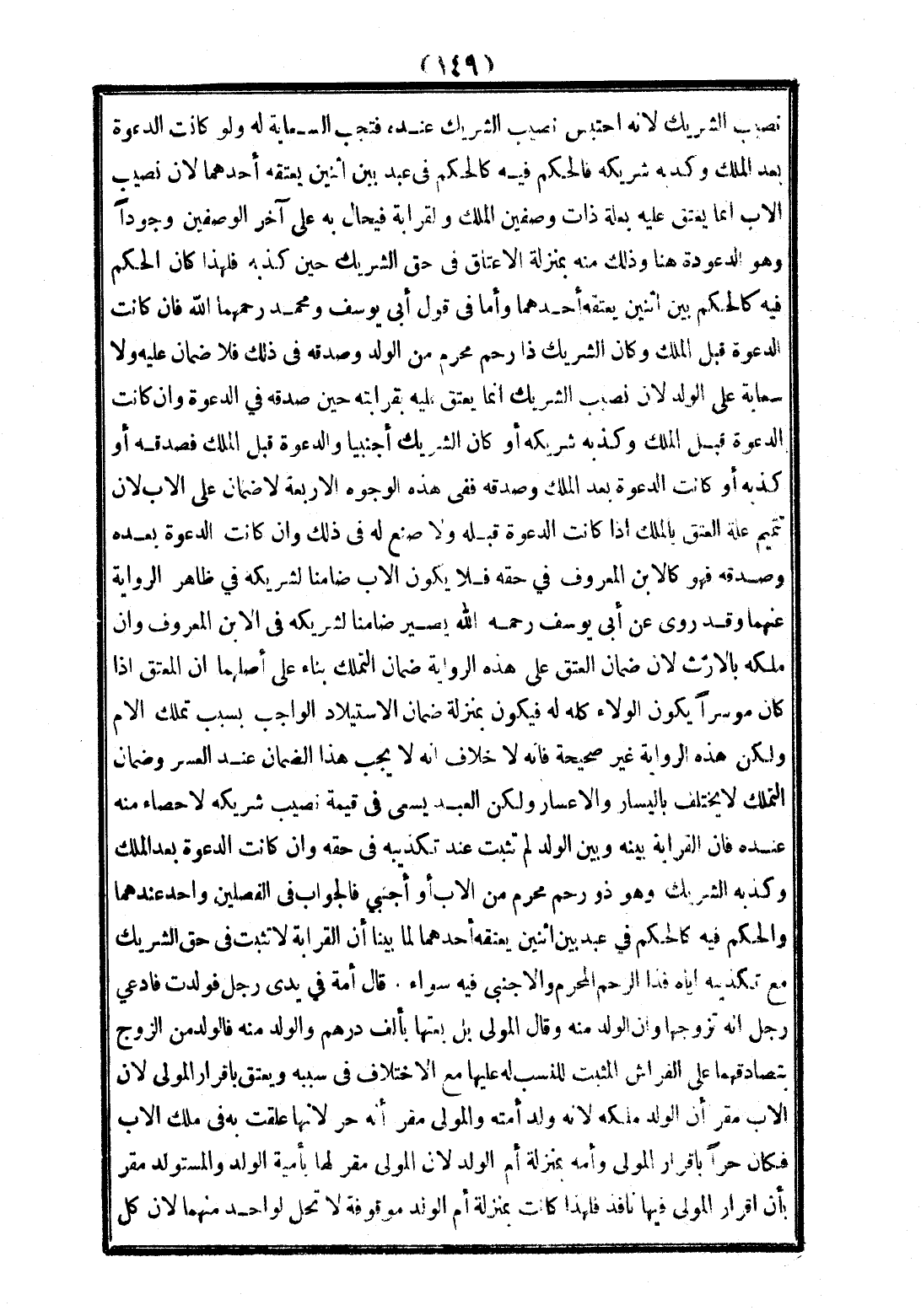 وَلَكِنَّ هَذِهِ الرِّوَايَةَ غَيْرُ صَحِيحَةٍ فَإِنَّهُ لَا خِلَافَ أَنَّهُ لَا يَجِبُ هَذَا الضَّمَانُ عِنْدَ الْعُسْرِ وَضَمَانُ التَّمَلُّكِ لَا يَخْتَلِفُ بِالْيَسَارِ وَالْإِعْسَارِ، وَلَكِنَّ الْعَبْدَ يَسْعَى فِي قِيمَةِ نَصِيبِ شَرِيكِهِ لِإِحْصَاءٍ مِنْهُ عِنْدَهُ فَإِنَّ الْقَرَابَةَ بَيْنَهُ وَبَيْنَ الْوَلَدِ لَمْ تَثْبُتْ عِنْدَ تَكْذِيبِهِ فِي حَقِّهِ، وَإِنْ كَانَتْ الدَّعْوَةُ بَعْدَ الْمِلْكِ، وَكَذَّبَهُ الشَّرِيكُ وَهُوَ ذُو رَحِمٍ مَحْرَمٍ مِنْ الْأَبِ أَوْ أَجْنَبِيٍّ فَالْجَوَابُ فِي الْفَصْلَيْنِ وَاحِدٌ عِنْدَهُمَا، وَالْحُكْمُ فِيهِ كَالْحُكْمِ فِي عَبْدٍ بَيْنَ اثْنَيْنِ يُعْتِقُهُ أَحَدُهُمَا لِمَا بَيَّنَّا أَنَّ الْقَرَابَةَ لَا تَثْبُتُ فِي حَقِّ الشَّرِيكِ مَعَ تَكْذِيبِهِ إيَّاهُ فَذَا الرَّحِمِ الْمَحْرَمِ، وَالْأَجْنَبِيَّ فِيهِ سَوَاءٌ.