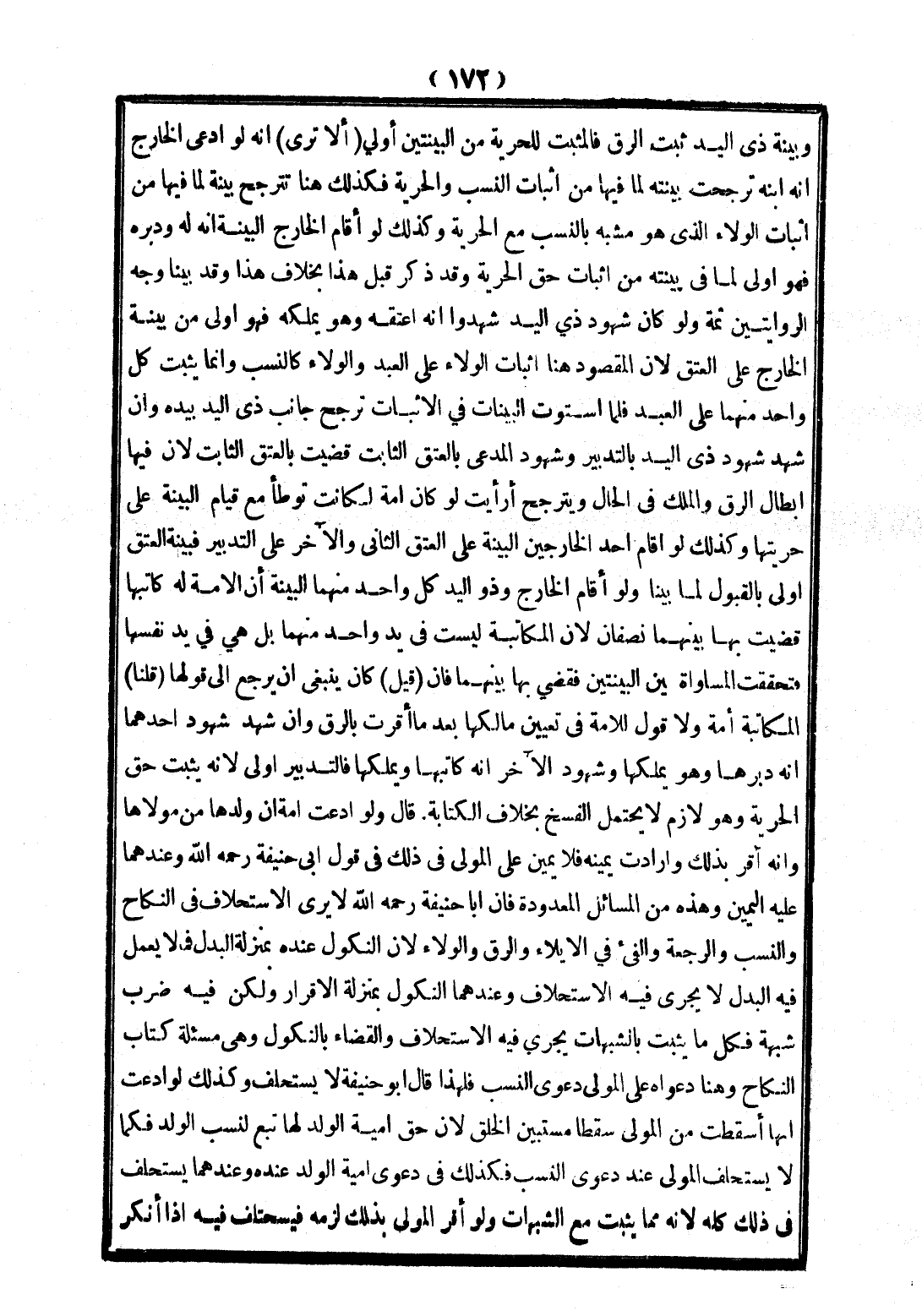 (أَلَا تَرَى) أَنَّهُ لَوْ ادَّعَى الْخَارِجُ أَنَّهُ ابْنُهُ تَرَجَّحَتْ بَيِّنَتُهُ لِمَا فِيهَا مِنْ إثْبَاتِ النَّسَبِ، وَالْحُرِّيَّةِ فَكَذَلِكَ هُنَا تَتَرَجَّحُ بَيِّنَتُهُ؛ لِمَا فِيهَا مِنْ إثْبَاتِ الْوَلَاءِ الَّذِي هُوَ مُشَبَّهٌ بِالنَّسَبِ مَعَ الْحُرِّيَّةِ، وَكَذَلِكَ لَوْ أَقَامَ الْخَارِجُ الْبَيِّنَةَ أَنَّهُ لَهُ وَدَبَّرَهُ فَهُوَ أَوْلَى لِمَا فِي بَيِّنَتِهِ مِنْ إثْبَاتِ حَقِّ الْحُرِّيَّةِ، وَقَدْ ذَكَرَ قَبْلَ هَذَا بِخِلَافِ هَذَا، وَقَدْ بَيَّنَّا وَجْهَ الرِّوَايَتَيْنِ ثَمَّةَ، وَلَوْ كَانَ شُهُودُ ذِي الْيَدِ شَهِدُوا أَنَّهُ أَعْتَقَهُ، وَهُوَ يَمْلِكُهُ فَهُوَ أَوْلَى مِنْ بَيِّنَةِ الْخَارِجِ عَلَى الْعِتْقِ؛ لِأَنَّ الْمَقْصُودَ هُنَا إثْبَاتُ الْوَلَاءِ عَلَى الْعَبْدِ وَالْوَلَاءُ كَالنَّسَبِ، وَإِنَّمَا يُثْبِتُ كُلُّ وَاحِدٍ مِنْهُمَا عَلَى الْعَبْدِ فَلَمَّا اسْتَوَتْ الْبَيِّنَاتُ فِي الْإِثْبَاتِ تَرَجَّحَ جَانِبُ ذِي الْيَدِ بِيَدِهِ، وَإِنْ شَهِدَ شُهُودُ ذِي الْيَدِ بِالتَّدْبِيرِ وَشُهُودُ الْمُدَّعِي بِالْعِتْقِ الثَّابِتِ قَضَيْتُ بِالْعِتْقِ الثَّابِتِ؛ لِأَنَّ فِيهَا إبْطَالَ الرِّقِّ وَالْمِلْكِ فِي الْحَالِ يَتَرَجَّحُ أَرَأَيْتَ لَوْ كَانَ أَمَةً لَكَانَتْ تُوطَأُ مَعَ قِيَامِ الْبَيِّنَةِ عَلَى حُرِّيَّتِهَا.