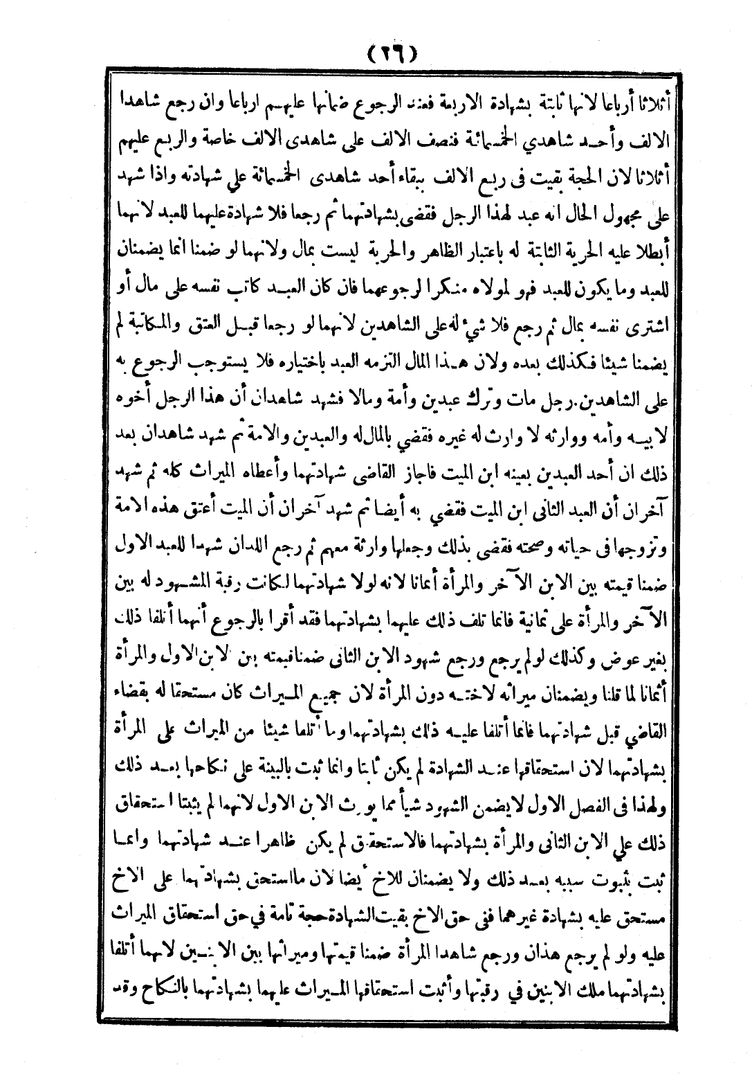 رَجُلٌ مَاتَ وَتَرَكَ عَبْدَيْنِ وَأَمَةً وَمَالًا فَشَهِدَ شَاهِدَانِ أَنَّ هَذَا الرَّجُلَ أَخُوهُ لِأَبِيهِ وَأُمِّهِ وَوَارِثُهُ لَا وَارِثَ لَهُ غَيْرُهُ فَقَضَى بِالْمَالِ لَهُ وَالْعَبْدَيْنِ وَالْأَمَةِ ثُمَّ شَهِدَ شَاهِدَانِ بَعْدَ ذَلِكَ أَنَّ أَحَدَ الْعَبْدَيْنِ بِعَيْنِهِ ابْنُ الْمَيِّتِ فَأَجَازَ الْقَاضِي شَهَادَتَهُمَا وَأَعْطَاهُ الْمِيرَاثَ كُلَّهُ ثُمَّ شَهِدَ آخَرَانِ أَنَّ الْعَبْدَ الثَّانِيَ ابْنُ الْمَيِّتِ فَقَضَى بِهِ أَيْضًا ثُمَّ شَهِدَ آخَرَانِ أَنَّ الْمَيِّتَ أَعْتَقَ هَذِهِ الْأَمَةَ وَتَزَوَّجَهَا فِي حَيَاتِهِ وَصِحَّتِهِ فَقَضَى بِذَلِكَ وَجَعَلَهَا وَارِثَةً مَعَهُمْ ثُمَّ رَجَعَ اللَّذَانِ شَهِدَا لِلْعَبْدِ الْأَوَّلِ ضَمِنَا قِيمَتَهُ بَيْنَ الِابْنِ الْآخَرِ وَالْمَرْأَةِ أَثْمَانًا؛ لِأَنَّهُ لَوْلَا شَهَادَتُهُمَا لَكَانَتْ رَقَبَةُ الْمَشْهُودِ لَهُ بَيْنَ الْآخَرِ وَالْمَرْأَةِ عَلَى ثَمَانِيَةٍ فَإِنَّمَا تَلِفَ ذَلِكَ عَلَيْهِمَا بِشَهَادَتِهِمَا فَقَدْ أَقَرَّا بِالرُّجُوعِ أَنَّهُمَا أَتْلَفَا ذَلِكَ بِغَيْرِ عِوَضٍ وَكَذَلِكَ لَوْ لَمْ يَرْجِعْ وَرَجَعَ شُهُودُ الِابْنِ الثَّانِي ضَمِنَا قِيمَتَهُ بَيْنَ الِابْنِ الْأَوَّلِ وَالْمَرْأَةِ أَثْمَانًا لِمَا قُلْنَا وَيَضْمَنَانِ مِيرَاثَهُ لِأُخْتِهِ دُونَ الْمَرْأَةِ؛ لِأَنَّ جَمِيعَ الْمِيرَاثِ كَانَ مُسْتَحَقًّا لَهُ بِقَضَاءِ الْقَاضِي قَبْلَ شَهَادَتِهِمَا فَإِنَّمَا أَتْلَفَا عَلَيْهِ ذَلِكَ بِشَهَادَتِهِمَا وَمَا أَتْلَفَا مِنْ الْمِيرَاثِ عَلَى الْمَرْأَةِ بِشَهَادَتِهِمَا؛ لِأَنَّ اسْتِحْقَاقَهَا عِنْدَ الشَّهَادَةِ لَمْ يَكُنْ ثَابِتًا وَإِنَّمَا ثَبَتَ بِالْبَيِّنَةِ عَلَى نِكَاحِهَا بَعْدَ ذَلِكَ وَلِهَذَا فِي الْفَصْلِ الْأَوَّلِ لَا يَضْمَنُ الشُّهُودُ شَيْئًا مِمَّا يُوَرَّثُ الِابْنَ الْأَوَّلَ؛ لِأَنَّهُمَا لَمْ يُثْبِتَا اسْتِحْقَاقَ ذَلِكَ عَلَى الِابْنِ الثَّانِي وَالْمَرْأَةِ بِشَهَادَتِهِمَا فَالِاسْتِحْقَاقُ لَمْ يَكُنْ ظَاهِرًا عِنْدَ شَهَادَتِهِمَا وَإِنَّمَا ثَبَتَ بِثُبُوتِ سَبَبِهِ بَعْدَ ذَلِكَ وَلَا يَضْمَنَانِ لِلْأَخِ أَيْضًا؛ لِأَنَّ مَا اسْتَحَقَّ بِشَهَادَتِهِمَا عَلَى الْأَخِ مُسْتَحَقٌّ عَلَيْهِ بِشَهَادَةِ غَيْرِهِمَا فَفِي حَقِّ الْأَخِ بَقِيَتْ الشَّهَادَةُ حُجَّةً تَامَّةً فِي حَقِّ اسْتِحْقَاقِ الْمِيرَاثِ عَلَيْهِ وَلَوْ لَمْ يَرْجِعْ هَذَانِ وَرَجَعَ شَاهِدَا الْمَرْأَةِ ضَمِنَا قِيمَتَهَا وَمِيرَاثَهَا بَيْنَ الِابْنَيْنِ؛ لِأَنَّهُمَا أَتْلَفَا بِشَهَادَتِهِمَا مِلْكَ الِابْنَيْنِ فِي رَقَبَتِهِمَا وَأَثْبَتَ اسْتِحْقَاقَهَا الْمِيرَاثَ عَلَيْهِمَا بِشَهَادَتِهِمَا بِالنِّكَاحِ وَقَدْ