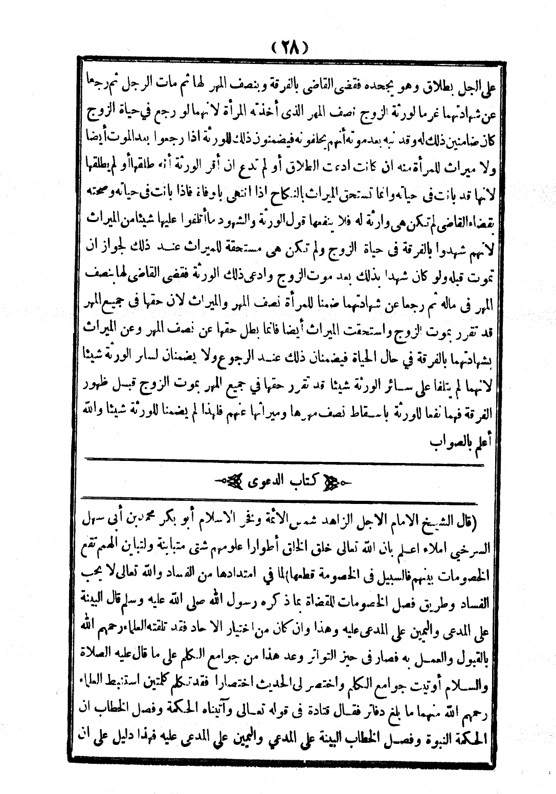 (كِتَابُ الدَّعْوَى) (قَالَ الشَّيْخُ الْإِمَامُ الْأَجَلُّ الزَّاهِدُ شَمْسُ الْأَئِمَّةِ وَفَخْرُ الْإِسْلَامِ أَبُو بَكْرٍ مُحَمَّدُ بْنُ أَبِي سَهْلٍ السَّرَخْسِيُّ إمْلَاءً: اعْلَمْ بِأَنَّ اللَّهَ تَعَالَى خَلَقَ الْخَلْقَ أَطْوَارًا عُلُومُهُمْ شَتَّى مُتَبَايِنَةٌ وَلِتَبَايُنِ الْهِمَمِ تَقَعُ الْخُصُومَاتُ بَيْنَهُمْ فَالسَّبِيلُ فِي الْخُصُومَةِ قَطْعُهَا) لِمَا فِي امْتِدَادِهَا مِنْ الْفَسَادِ وَاَللَّهُ تَعَالَى لَا يُحِبُّ الْفَسَادَ وَطَرِيقُ فَصْلِ الْخُصُومَاتِ لِلْقُضَاةِ بِمَا ذَكَرَهُ رَسُولُ اللَّهِ - صَلَّى اللَّهُ عَلَيْهِ وَسَلَّمَ - «قَالَ الْبَيِّنَةُ عَلَى الْمُدَّعِي وَالْيَمِينُ عَلَى الْمُدَّعَى عَلَيْهِ» هَذَا وَإِنْ كَانَ مِنْ اخْتِيَارِ الْآحَادِ فَقَدْ تَلَقَّتْهُ الْعُلَمَاءُ - رَحِمَهُمُ اللَّهُ - بِالْقَبُولِ وَالْعَمَلِ بِهِ فَصَارَ فِي حَيِّزِ التَّوَاتُرِ وَعُدَّ هَذَا مِنْ جَوَامِعِ الْكَلِمِ عَلَى مَا قَالَ - عَلَيْهِ الصَّلَاةُ وَالسَّلَامُ - «أُوتِيتُ جَوَامِعَ الْكَلِمِ» وَاخْتُصِرَ لِي الْحَدِيثُ اخْتِصَارًا فَقَدْ تَكَلَّمَ كَلِمَتَيْنِ اسْتَنْبَطَ الْعُلَمَاءُ - رَحِمَهُمُ اللَّهُ - مِنْهُمَا مَا بَلَغَ دَفَاتِرَ فَقَالَ قَتَادَةُ فِي قَوْله تَعَالَى {وَآتَيْنَاهُ الْحِكْمَةَ وَفَصْلَ الْخِطَابِ} [ص: 20] أَنَّ الْحِكْمَةَ النُّبُوَّةُ وَفَصْلَ الْخِطَابِ الْبَيِّنَةُ عَلَى الْمُدَّعِي وَالْيَمِينُ عَلَى الْمُدَّعَى عَلَيْهِ فَهَذَا دَلِيلٌ عَلَى أَنَّ